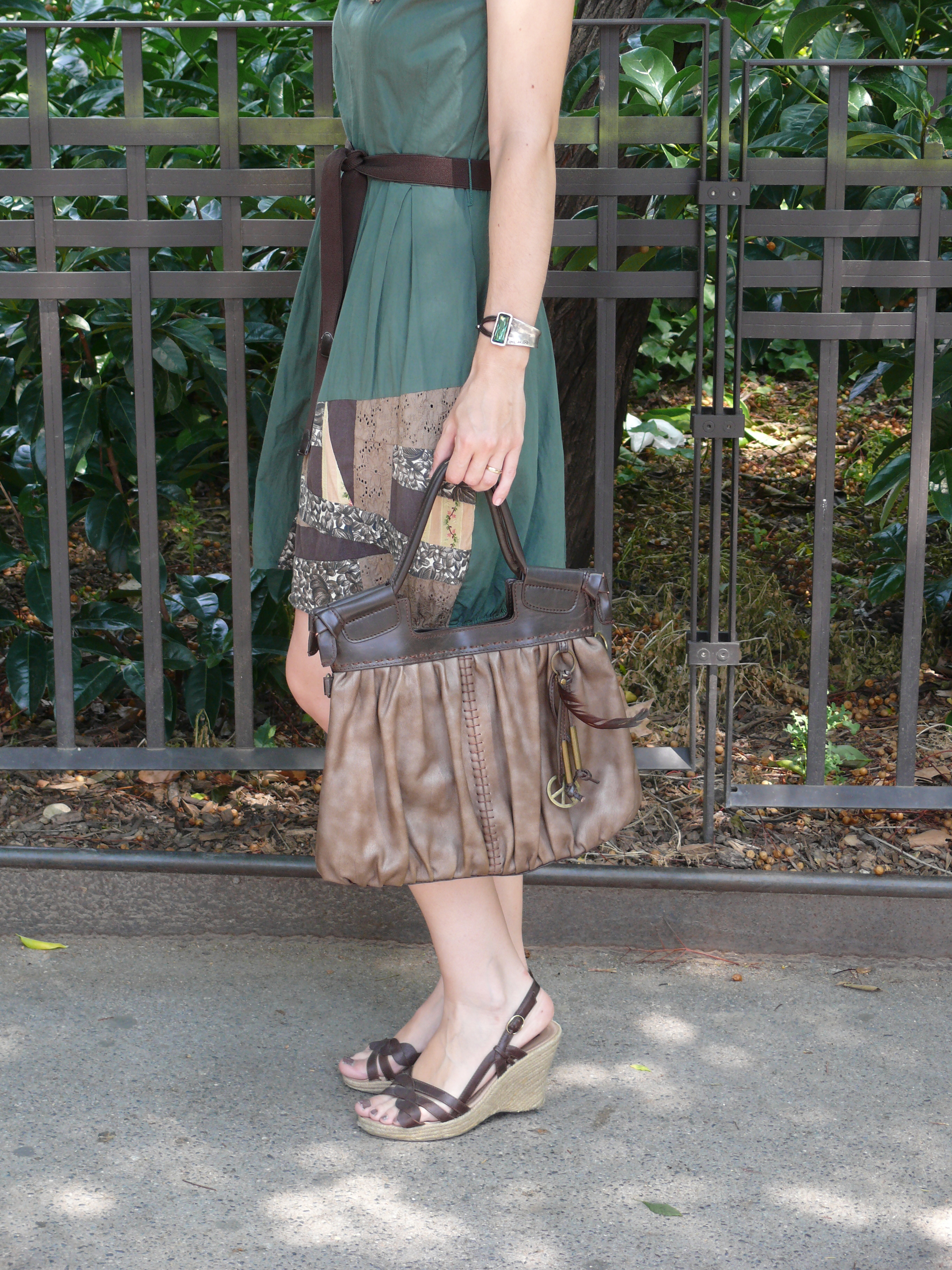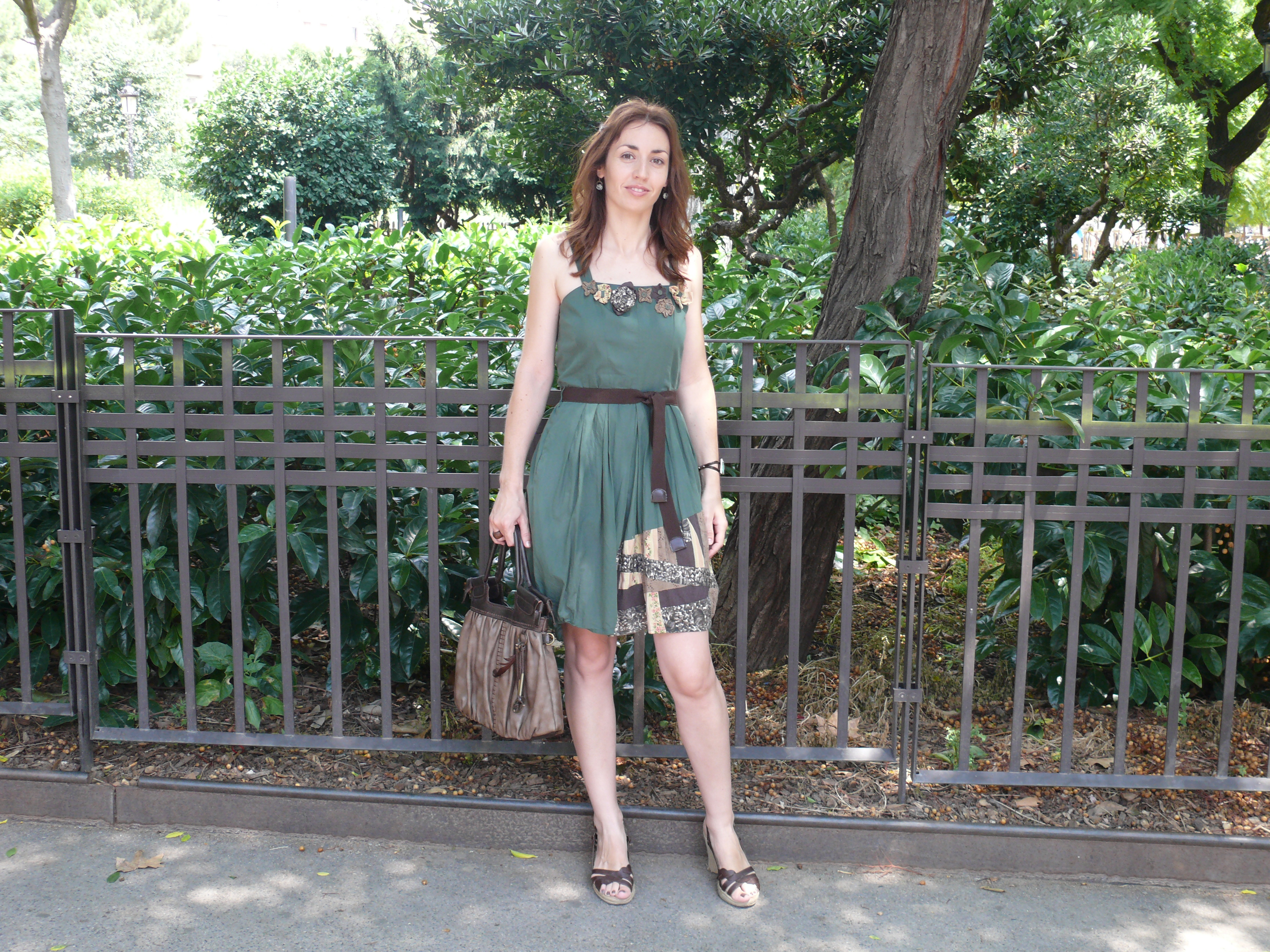 Vestido de Nice Things, bolso de Misako, cuñas de Oysho, pulsera de Uno de 50, anillo de Natura y pendientes de Paca Peca.