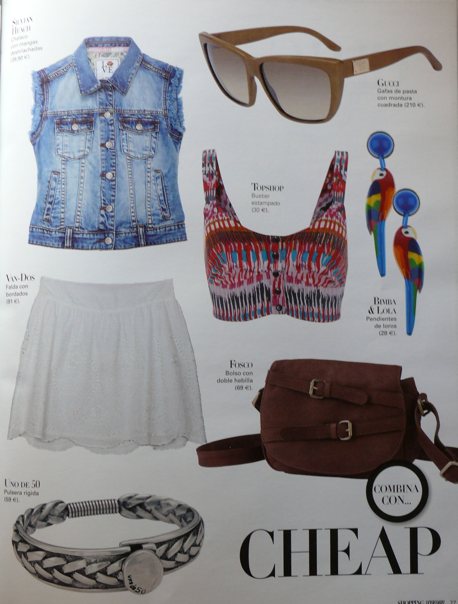 Chaleco con mangas deshilachadas de Silvian Heach (39,90€), gafas de pasta con montura cuadrada de Gucci (210€), Bustier estampado de Topshop (30€), pendientes de loros de Bimba & Lola (28€), falda con bordados Van-Dos (91€), bolso con doble hebilla de Fosco (69€) y pulsera rígida de Uno de 50 (59€).