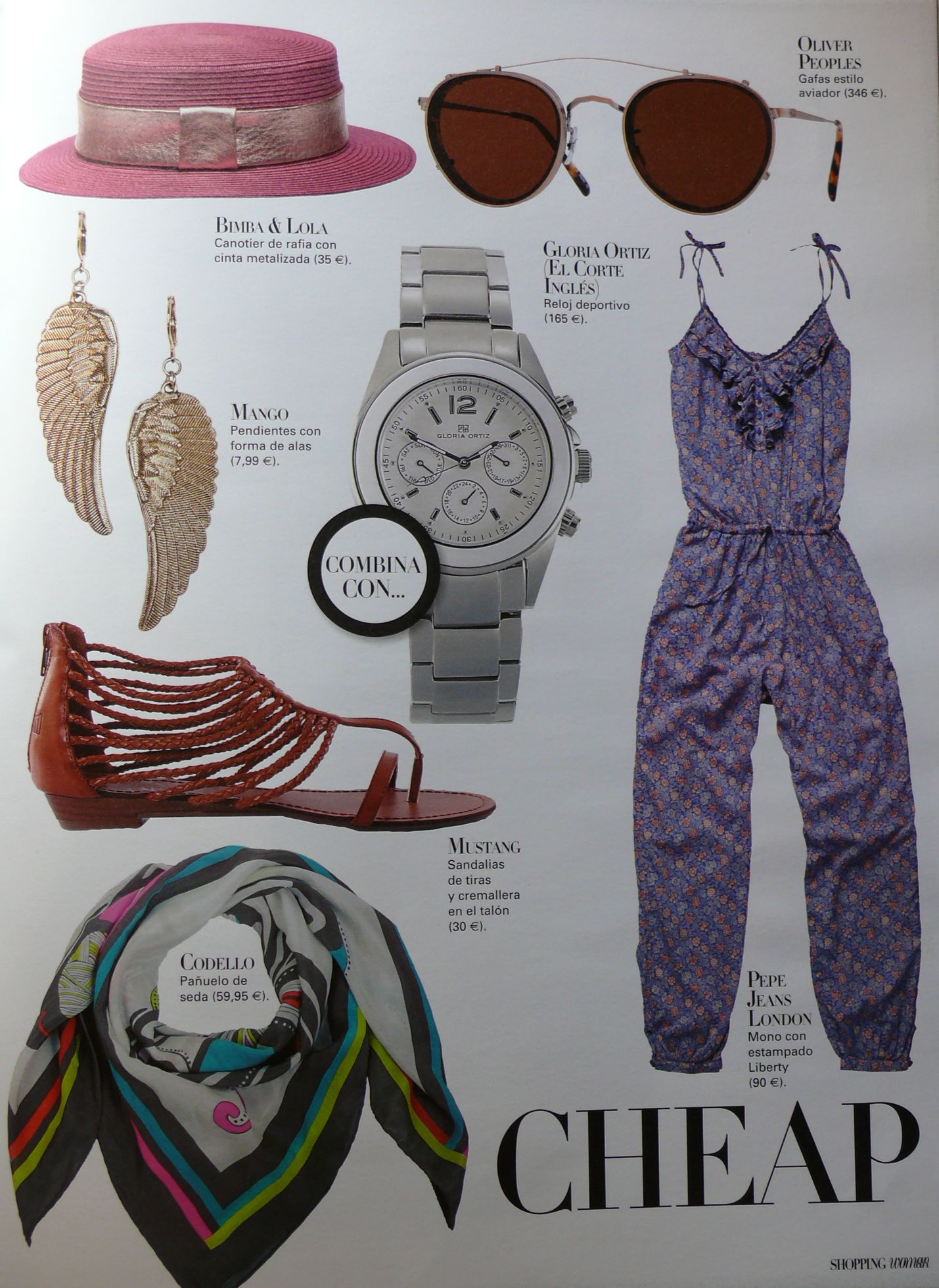 Canotier de rafia con cinta metalizada de Bimba & Lola (35€), gafas estilo aviador de Oliver Peoples (346€), reloj deportivo de Gloria Ortiz (El Corte Inglés) 165€, pendientes con forma de alas de Mango (7,99€), sandalias de tiras y cremallera en el talón de Mustang (30€), mono con estampado liberty de Pepe Jeans London (90€) y pañuelo de seda de Codello (59,95€).