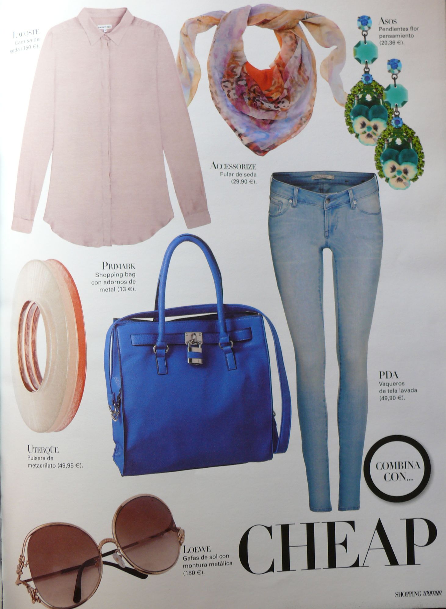 Camisa de seda de Lacoste (150€), fular de seda de Accesorize (29,90€), pendientes de Asos (20,36€), shopping bag con adornos de metal de Primark (13€), vaqueros de tela lavada de PDA (49,90€), pulsera de metacrilato de Uterqüe (49,95€) y gafas de sol con montura metálica de Loewe (180€).