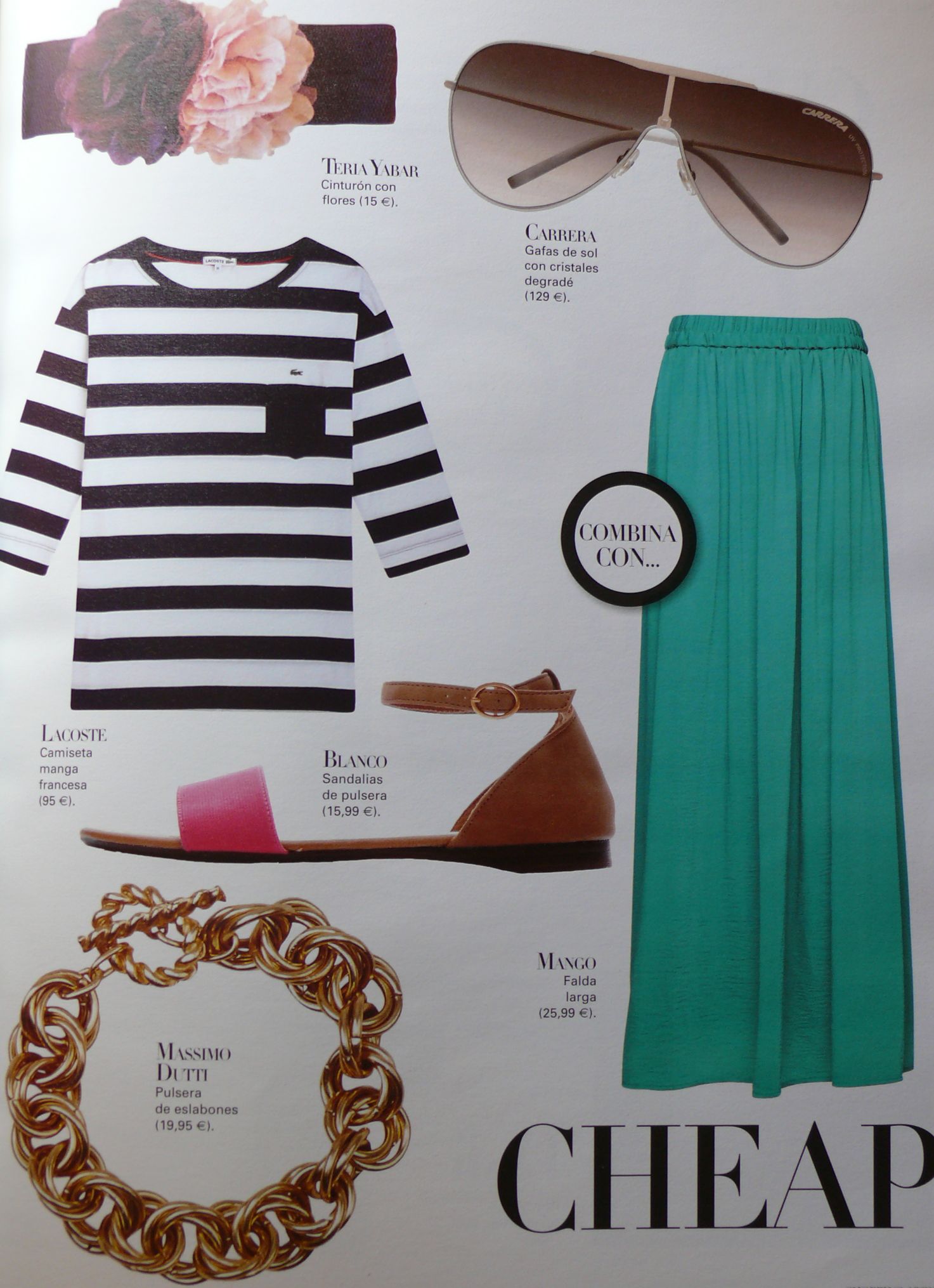 Cinturón con flores de Teria Yabar (15€), gafas de sol con cristales degradé de Carrera (129€), camiseta manga francesa de Lacoste (95€), sandalias de pulsera de Blanco (15,99€), falda larga de Mango (25,99€) y pulsera de eslabones de Massimo Dutti (19,95€).