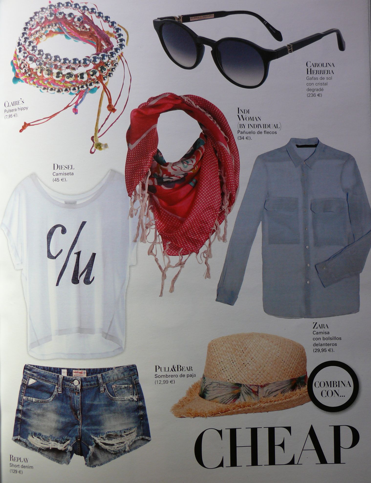 Pulsera hippy de Claire’s (7,95€), gafas de sol con cristal degradé de Carolina Herrera (236€), pañuelo de flecos de Indi Woman -By Individual- (34€), camiseta de Diesel (45€), camisa con bolsillos delanteros de Zara (29,95€), short denim de Replay (129€) y sombrero de paja de Pull & Bear (12,99€).