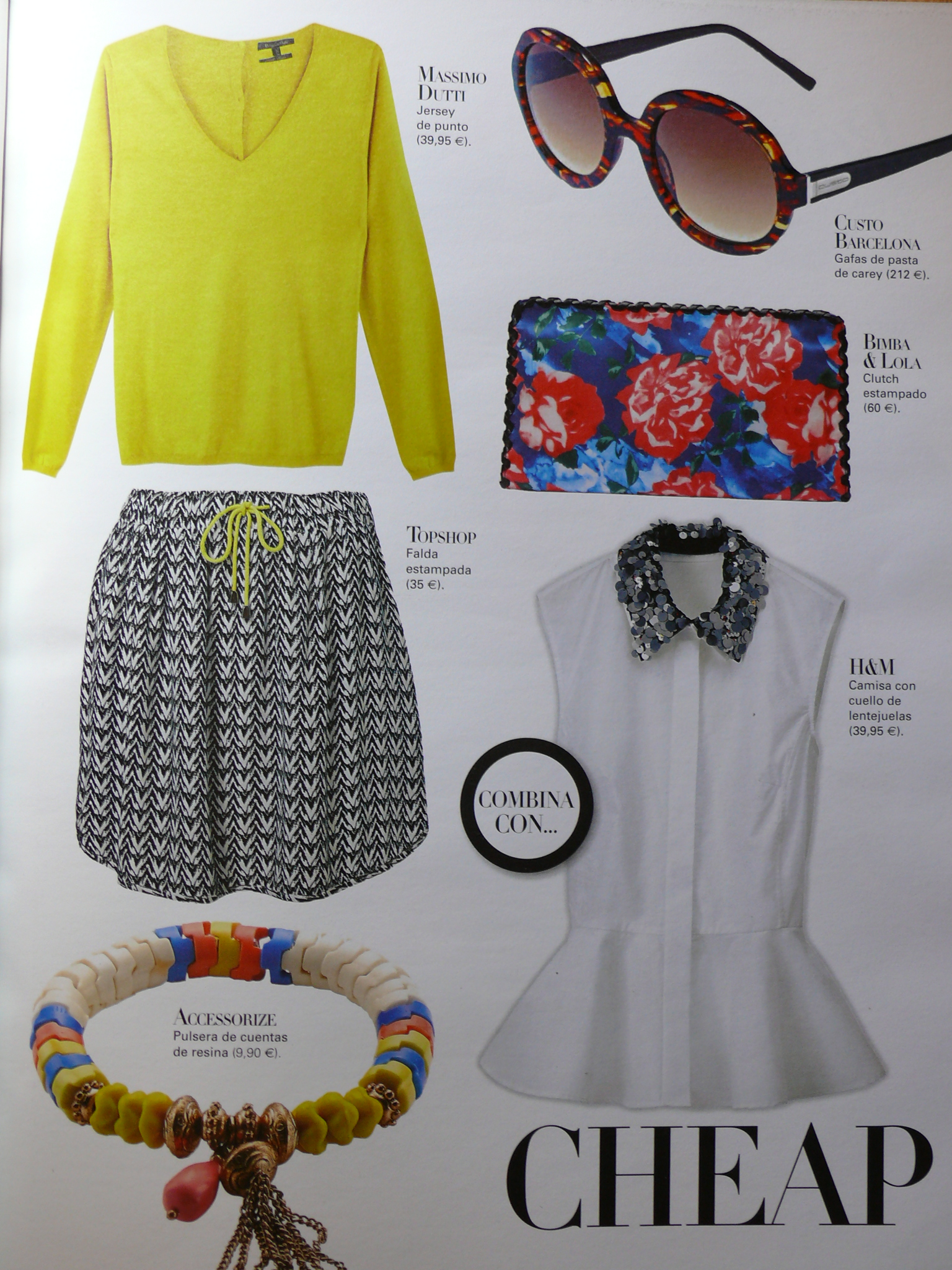 Jersey de punto de Massimo Dutti (39,95€), gafas de pasta de carey de Custo Barcelona (212€), clutch estampado de Bimba & Lola (60€), falda estampada de Topshop (35€), camisa con cuello de lentejuelas de H&M (39,95€) y pulsera de cuentas de resina de Accesorize (9,90€).