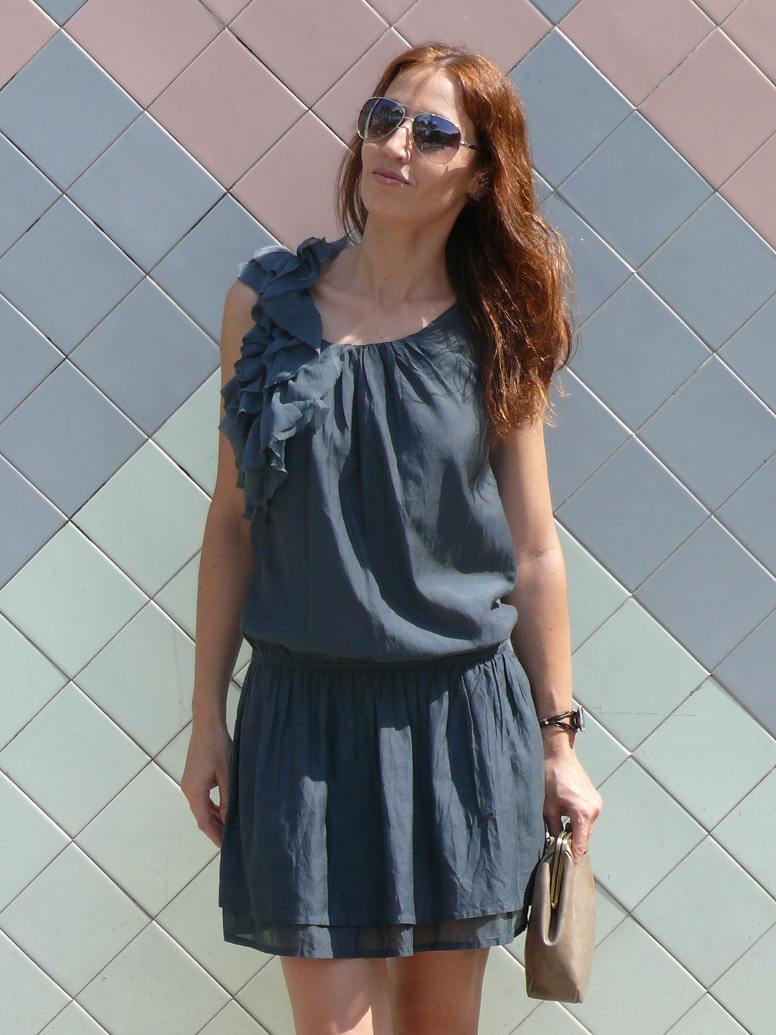 Vestido de Sisley (S/S 2012), bolso de STR (S/S 2011), sandalias Xti (S/S 2010), gafas de Mango (S/S 2012) y pulsera de Uno de 50.