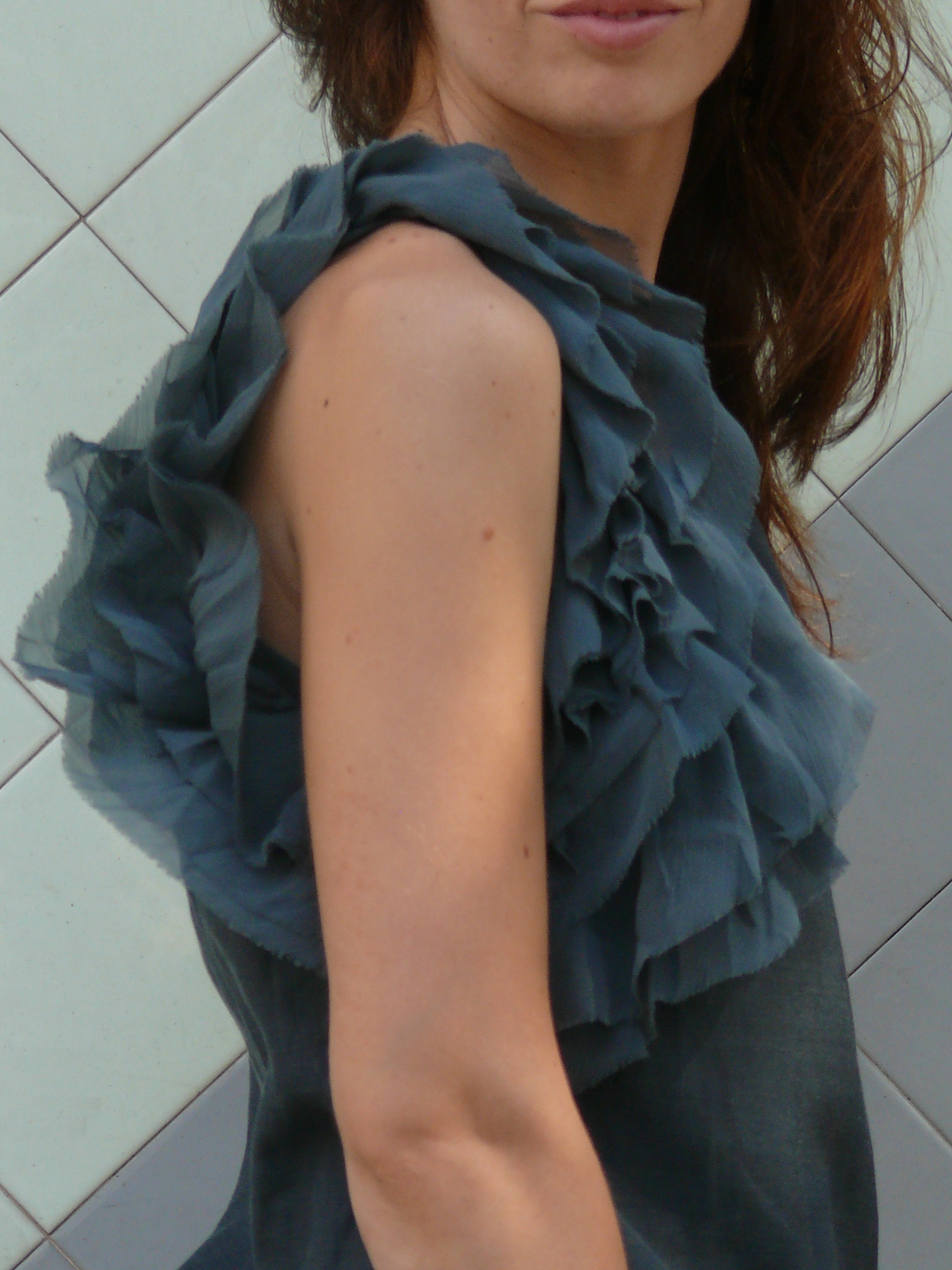 Para contrastar con el escenario, llevo un vestido de un sólo color y más oscuro que de costumbre, de un color verde/gris indefinido.