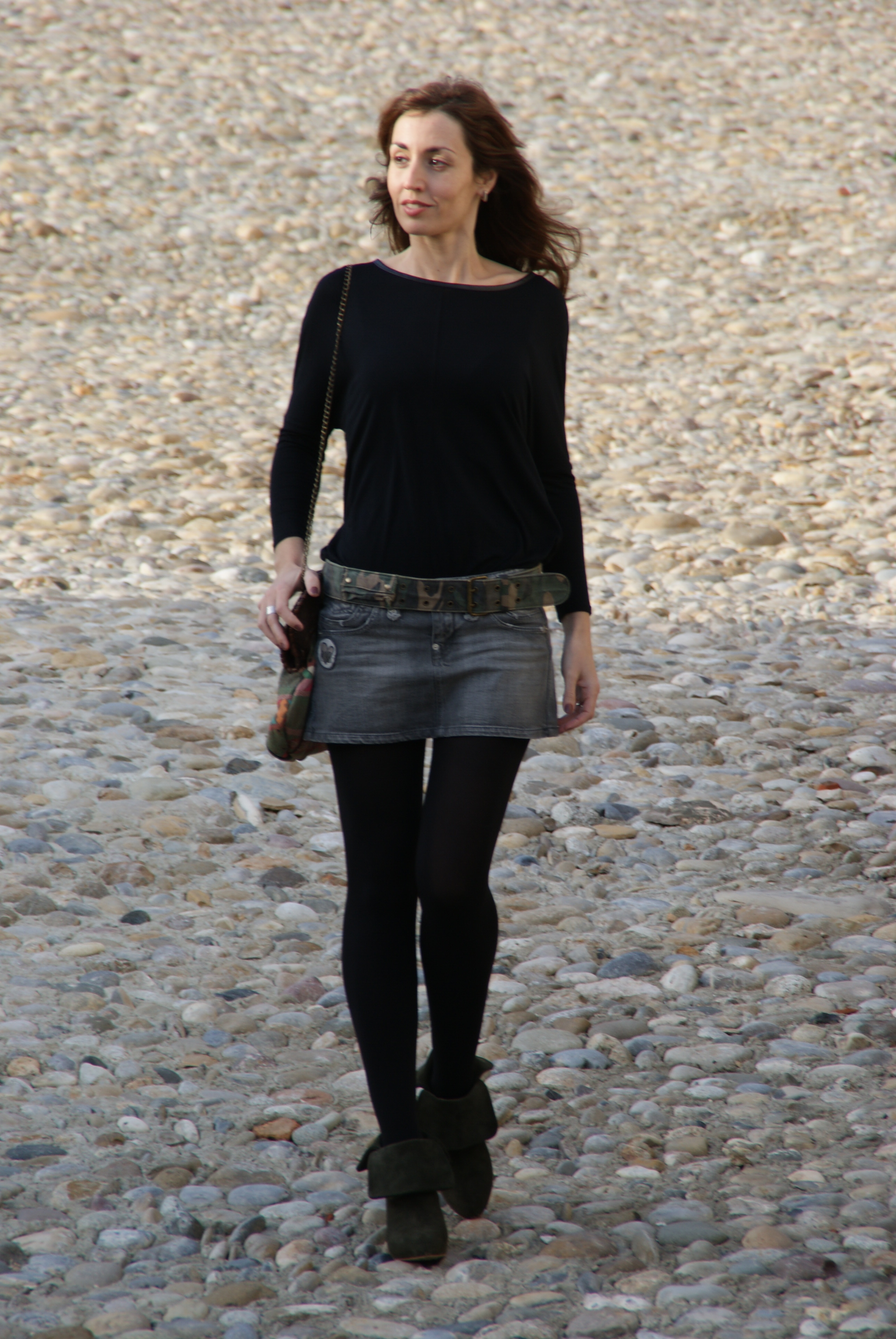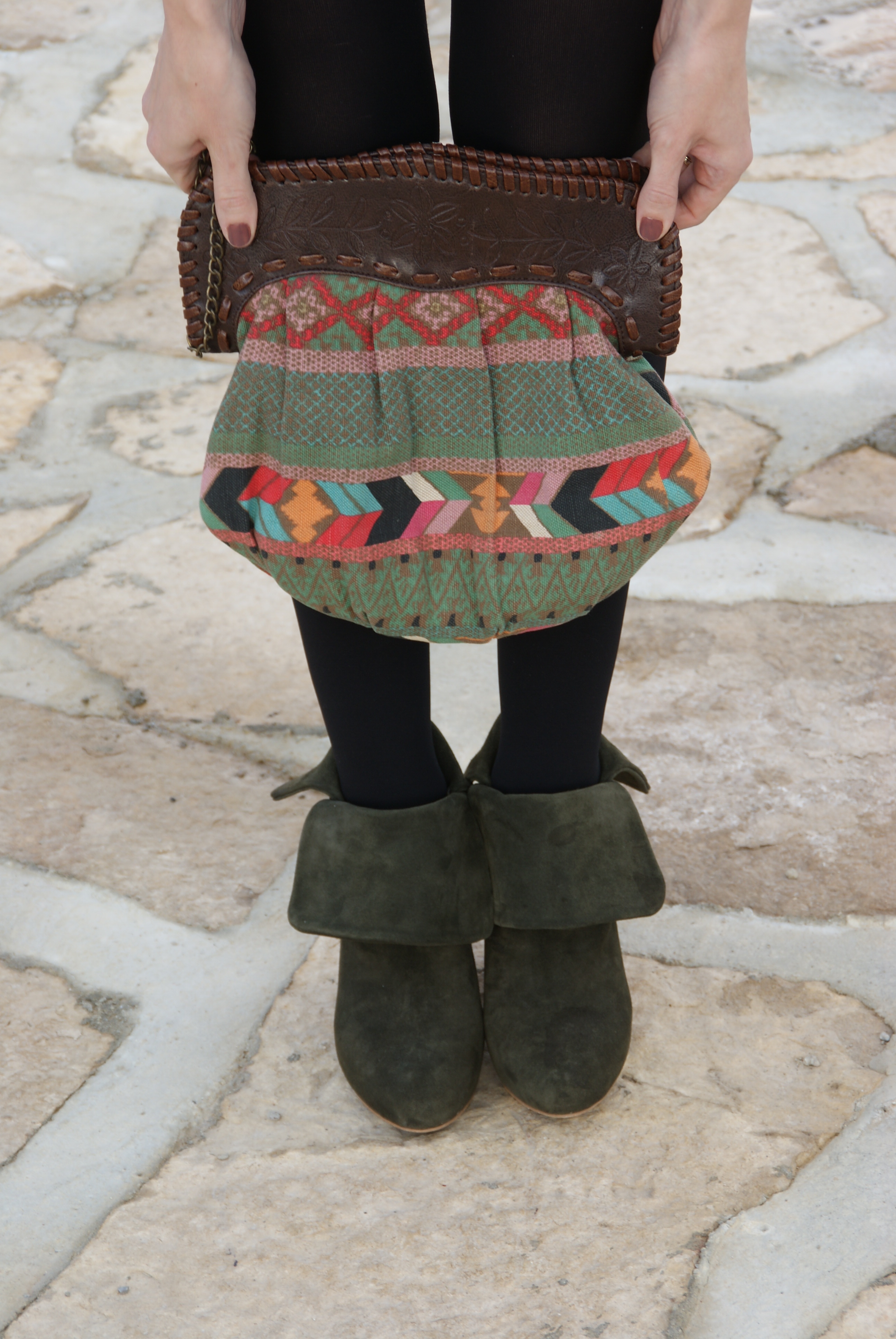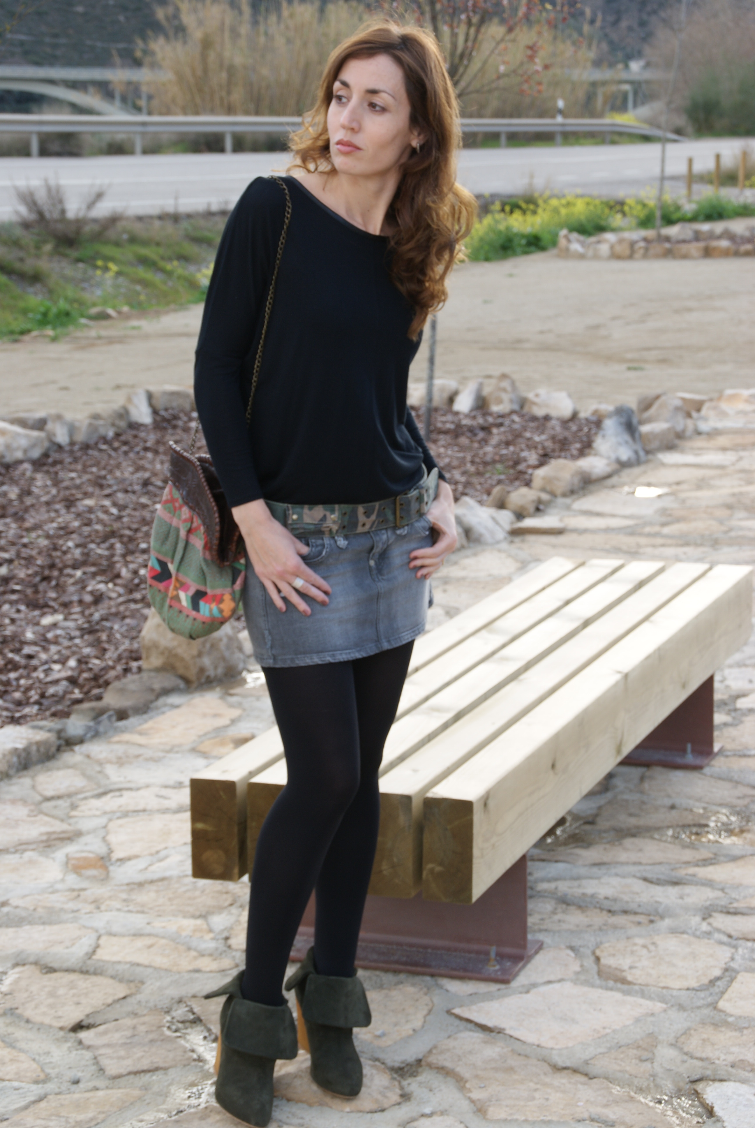 Respecto al look, es de base liso y oscuro, pero el bolso, cinturón y botines le dan el toque de color y de mezcla de estilos militar y étnico. El bolso es recuperado del baúl de mi hermana (aunque menos antiguo que la falda «casi vintage«), y creo que esta primavera/verano, sino me lo reclama… :), me va a venir como anillo al dedo al volver la tendencia étnica.
