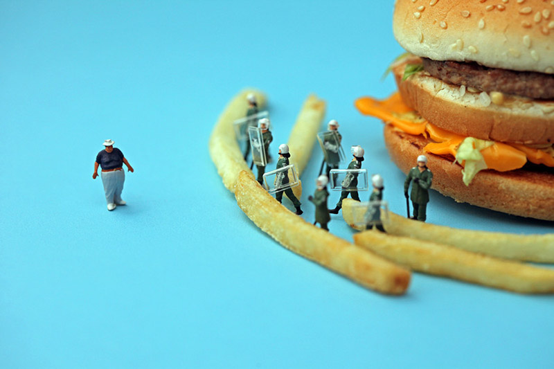 Unas imágenes exquisitas -nunca mejor dicho-, que con el efecto visual conseguido por la proporción de elementos, pretenden hacer reflexionar acerca de los excesos gastronómicos de nuestra sociedad, la comida basura y «el hambre» siempre presente en muchos lugares.