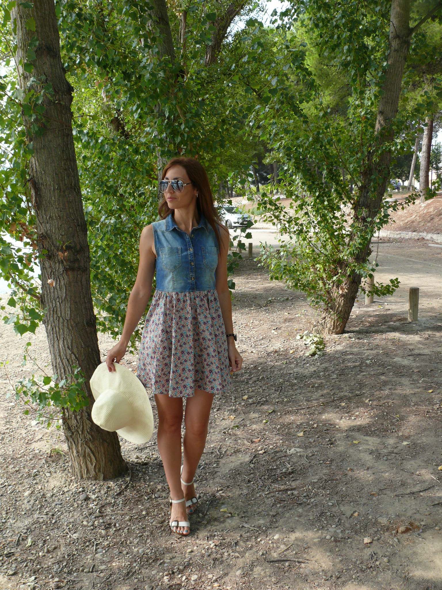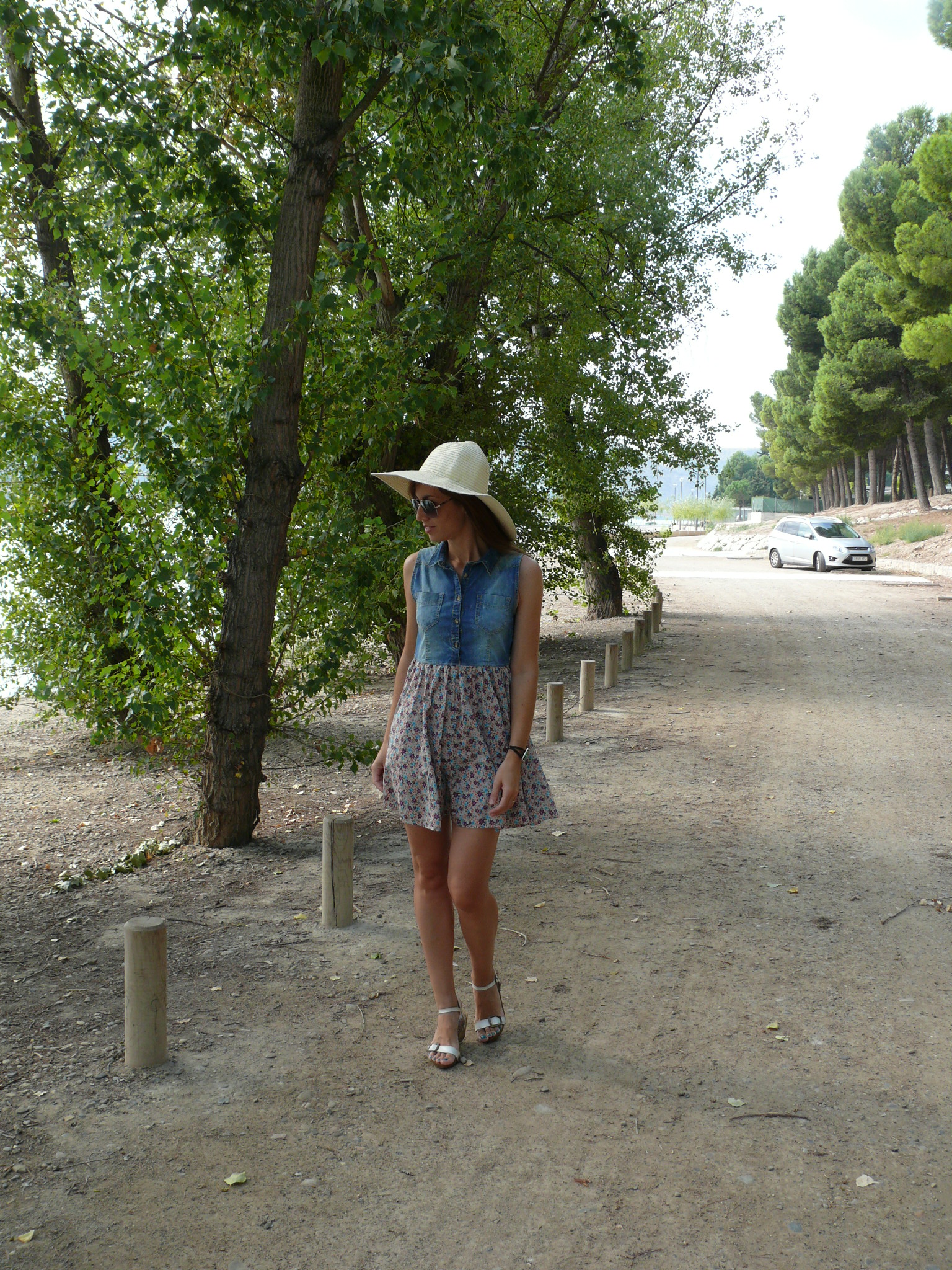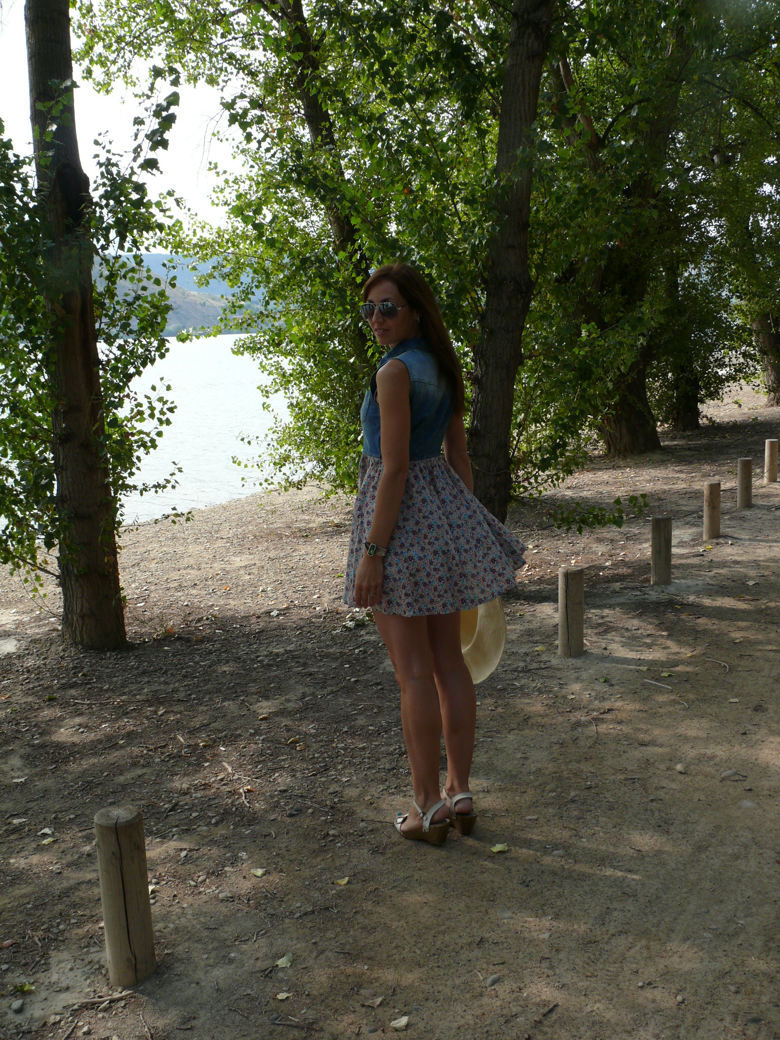 Así que en el post de hoy, rodeada de naturaleza y agua, otro look sencillo vacacional, compuesto por vestidito de vuelo en denim y flores, las sandalias que habéis visto ya muchas veces -aparte de comodísimas encajan con un sinfín de estilismos- y sombrero de hace un par de veranos -creo que todavía no había asomado por aquí-.