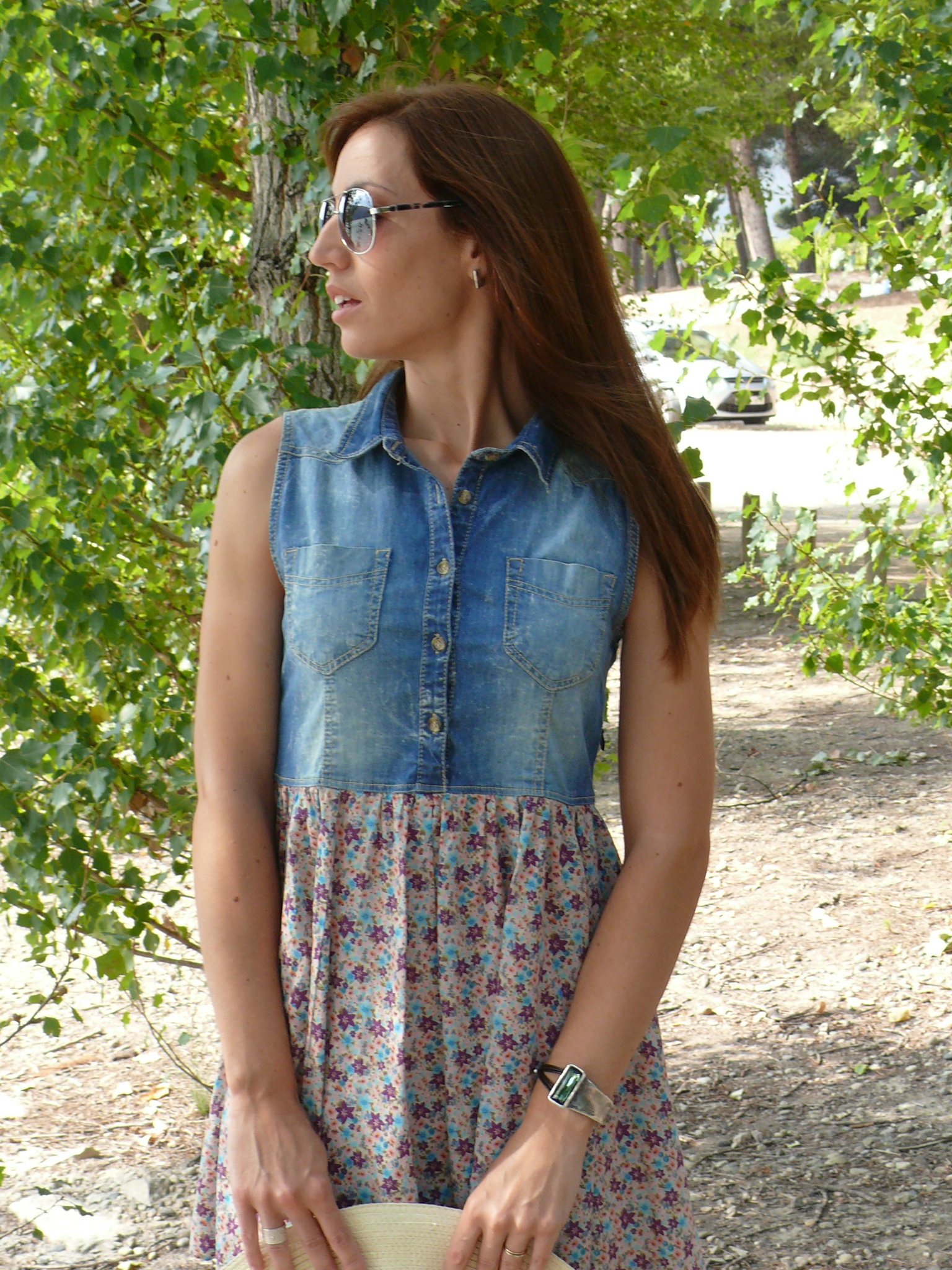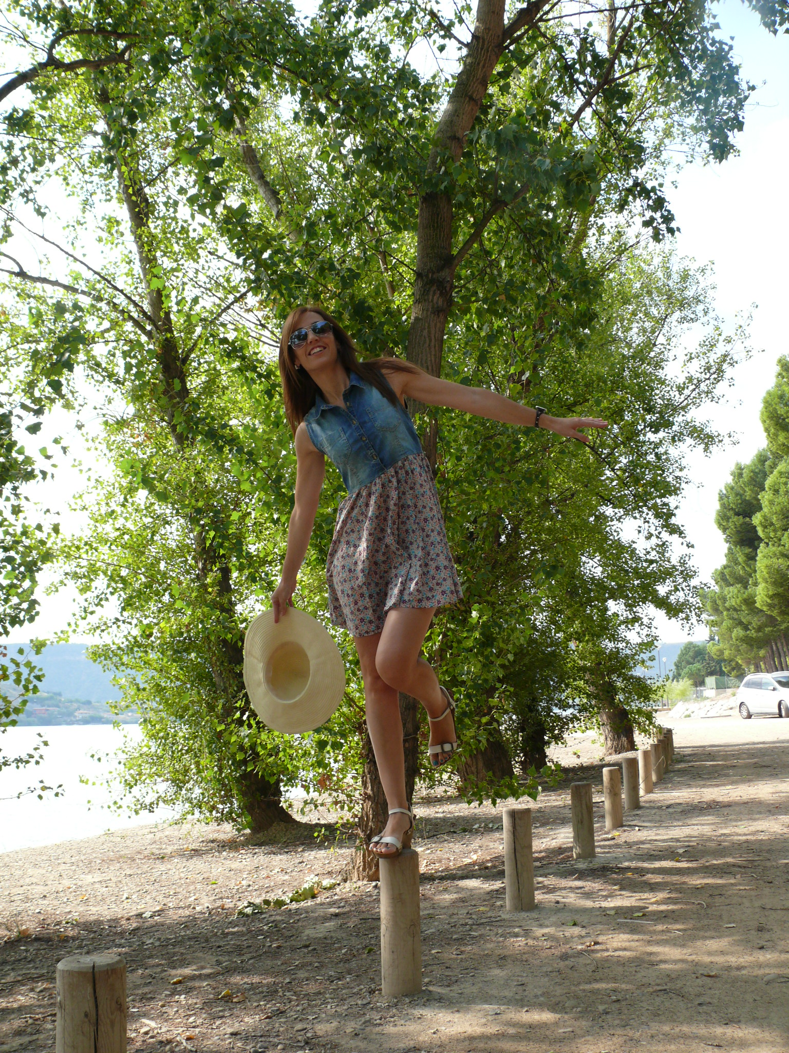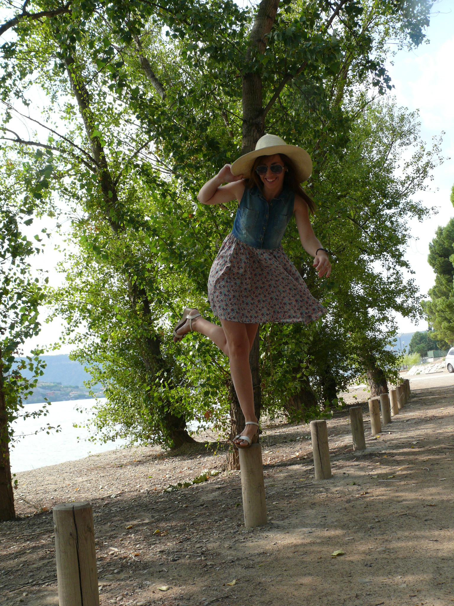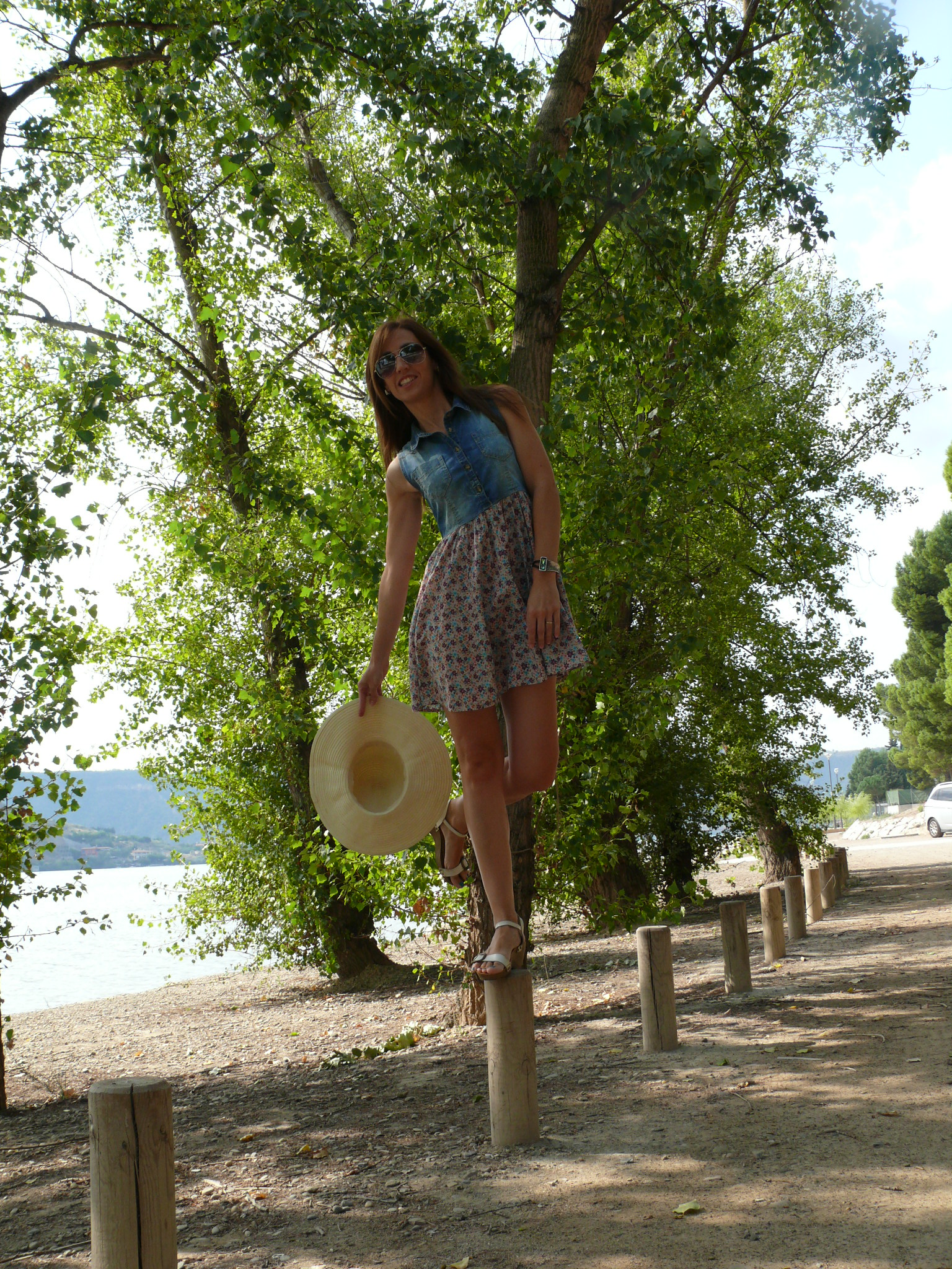 Así que en el post de hoy, rodeada de naturaleza y agua, otro look sencillo vacacional, compuesto por vestidito de vuelo en denim y flores, las sandalias que habéis visto ya muchas veces -aparte de comodísimas encajan con un sinfín de estilismos- y sombrero de hace un par de veranos -creo que todavía no había asomado por aquí-.
