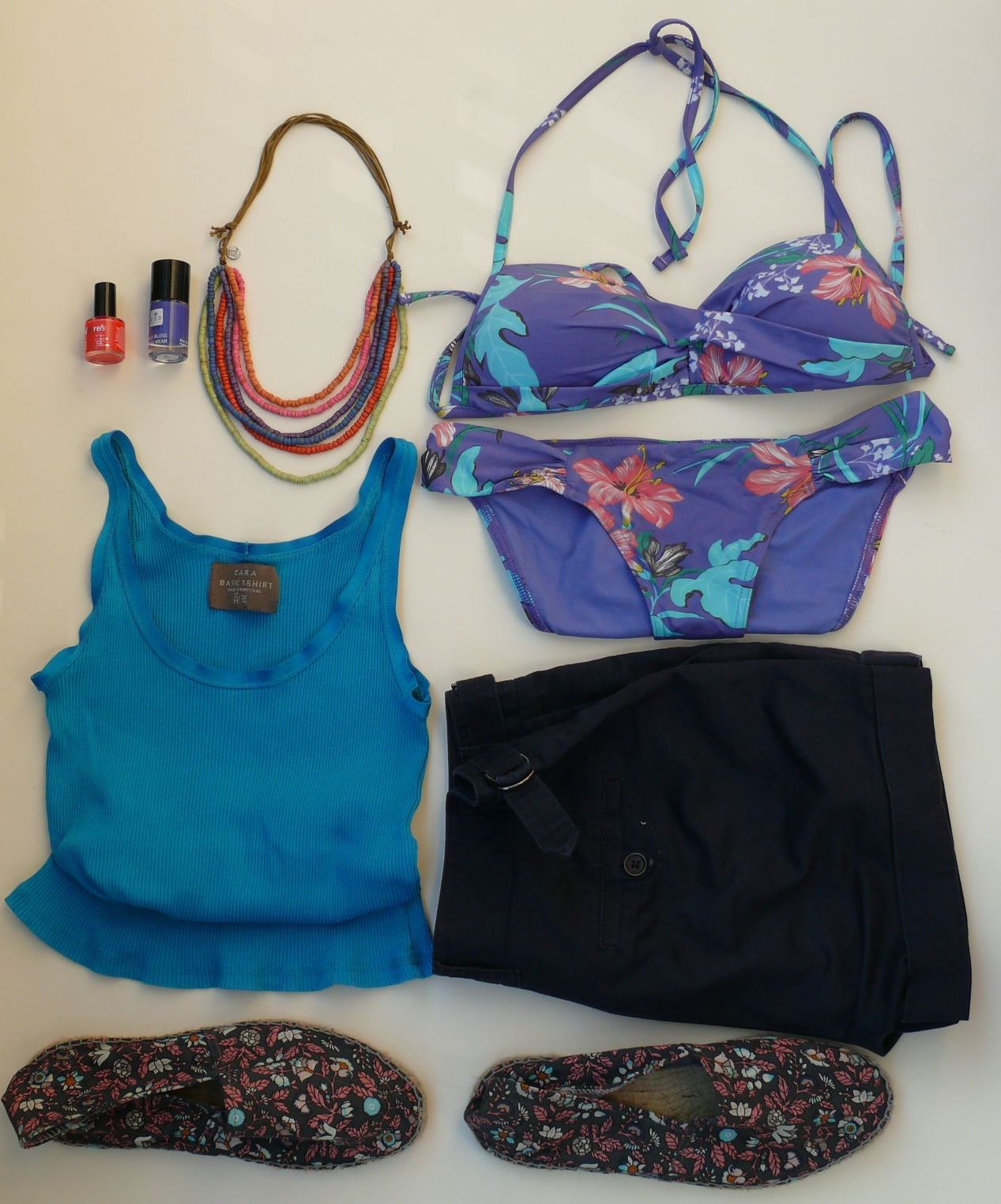 Shorts de Zara (old), camiseta de Zara (old), biquini de Oysho (S/S’13), collar de Day a Day (S/S’13) y alpargatas de Natura (S/S’13)