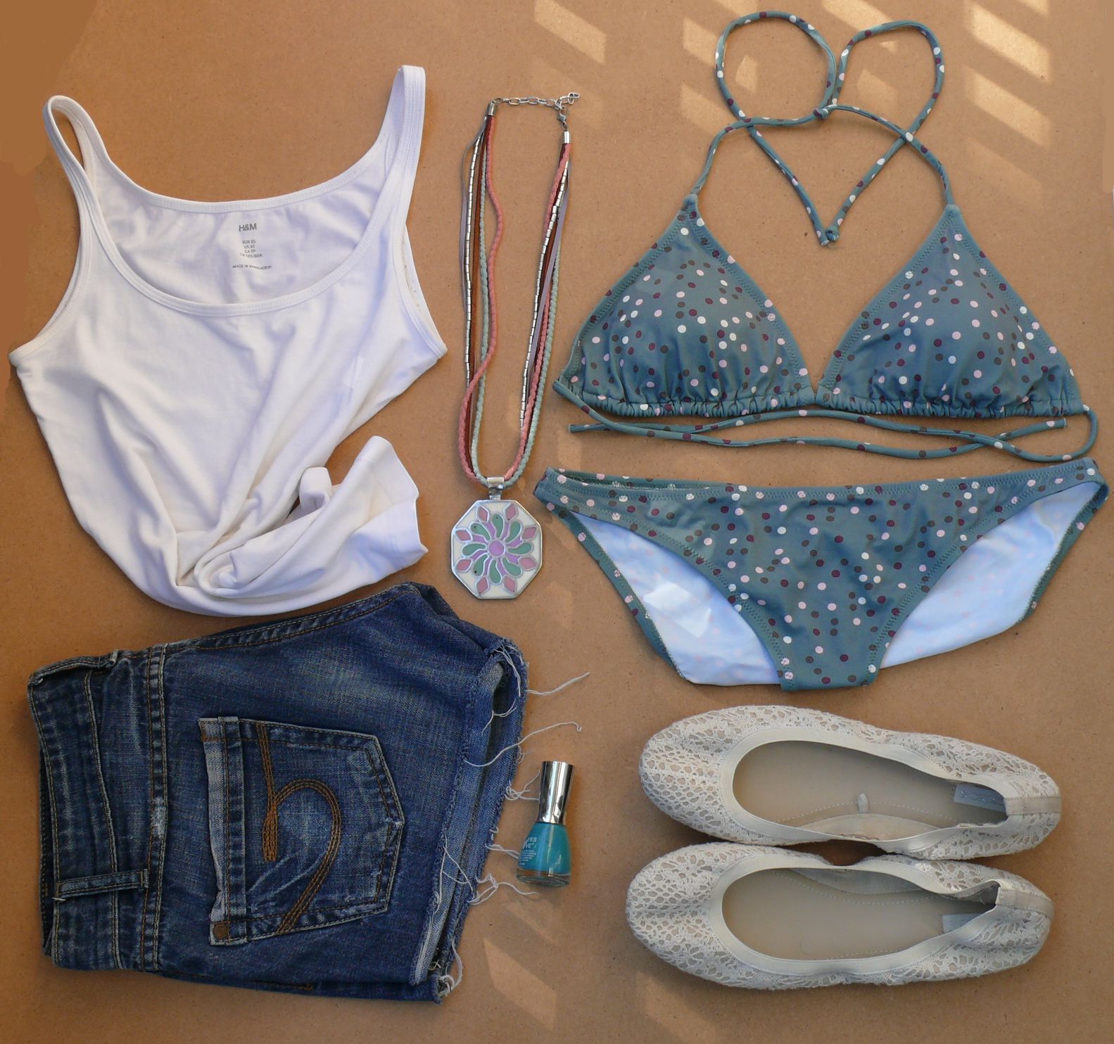 Shorts denim de Stradivarius (old), camiseta básica de H&M (S/S’12), biquini de Nice Things (S/S’11), collar de tienda local (S/S’13) y bailarinas de Oysho (S/S’13).