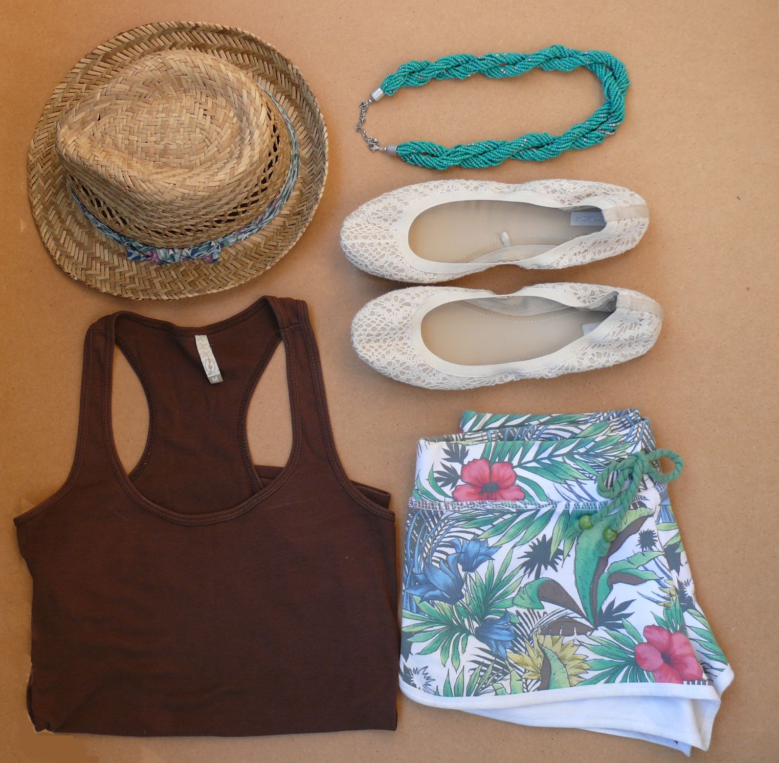 Camiseta de Stradivarius (S/S’11), shorts de Bershka (S/S’11), collar de H&M (S/S’13), sombrero de Sfera (S/S’12) y bailarinas de Oysho (S/S’13).