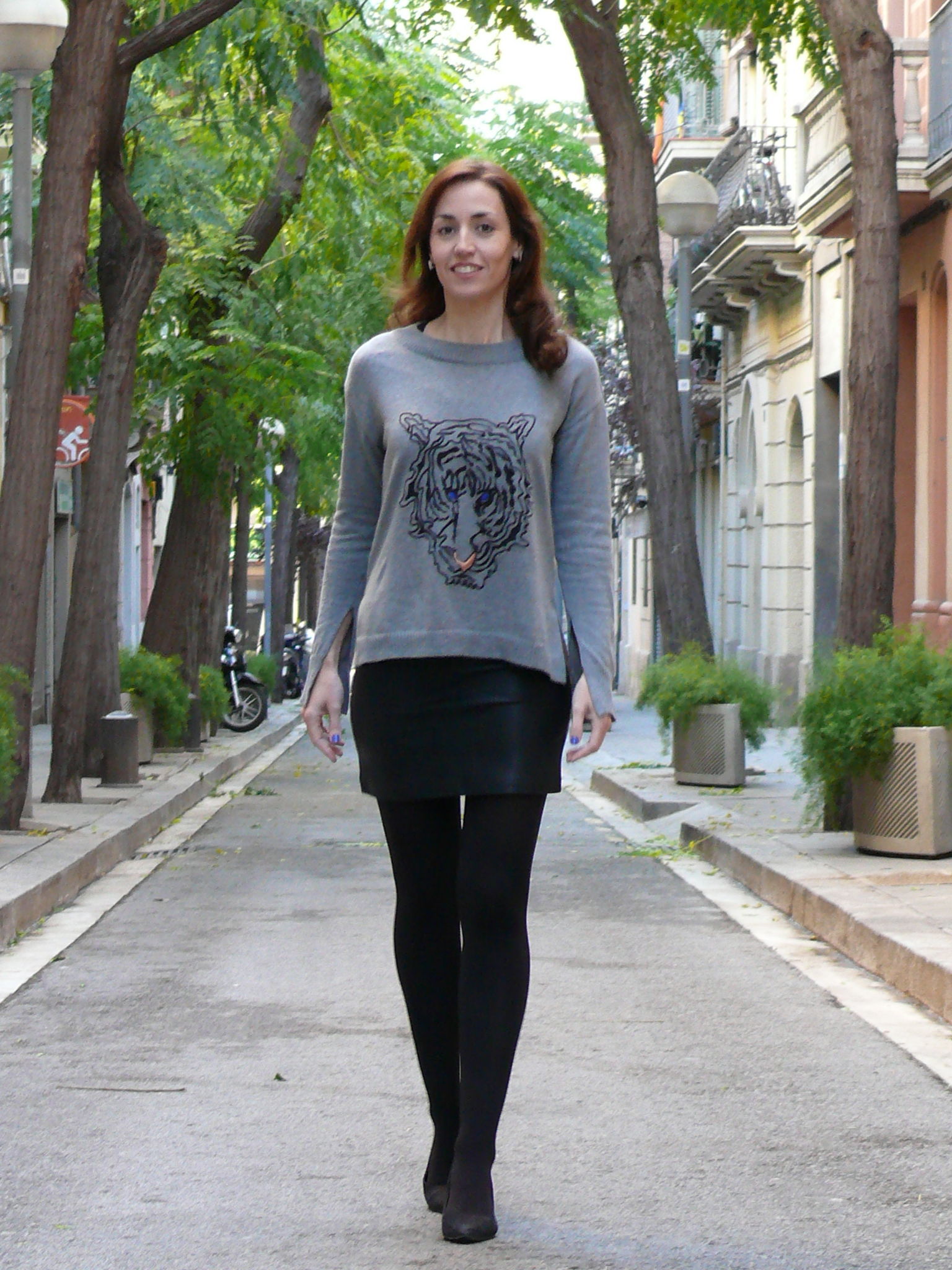 Hola!! Hoy os muestro otro look en el que predomina el negro, en este caso combinado con gris. Tanto la falda como el jersey fueron dos chollos que encontré en las pasadas rebajas. ¿Qué os parece? Sí sí, me refiero a las rebajas del pasado verano. Y os preguntaréis, ¿éstas prendas son de la colección de verano? Pues la verdad es que no lo sé, me imagino que serían de primavera o quizás de la temporada de invierno anterior. Una falda mini de cuero ya es como un básico, no podía fallar ni perder mucho comprándola, y en el otro caso, como ya sabía que muchos jerseys y sudaderas de este otoño/invierno venían con dibujo similar (cabeza de tigre, leopardo, pantera, cebra, etc), pensé que sería una buena compra. Y acerté! 😉