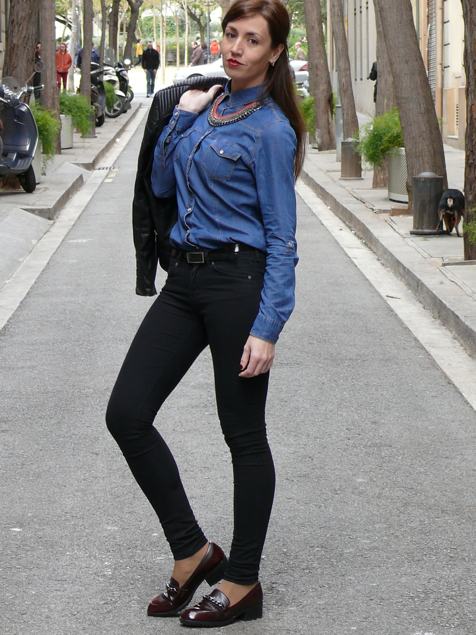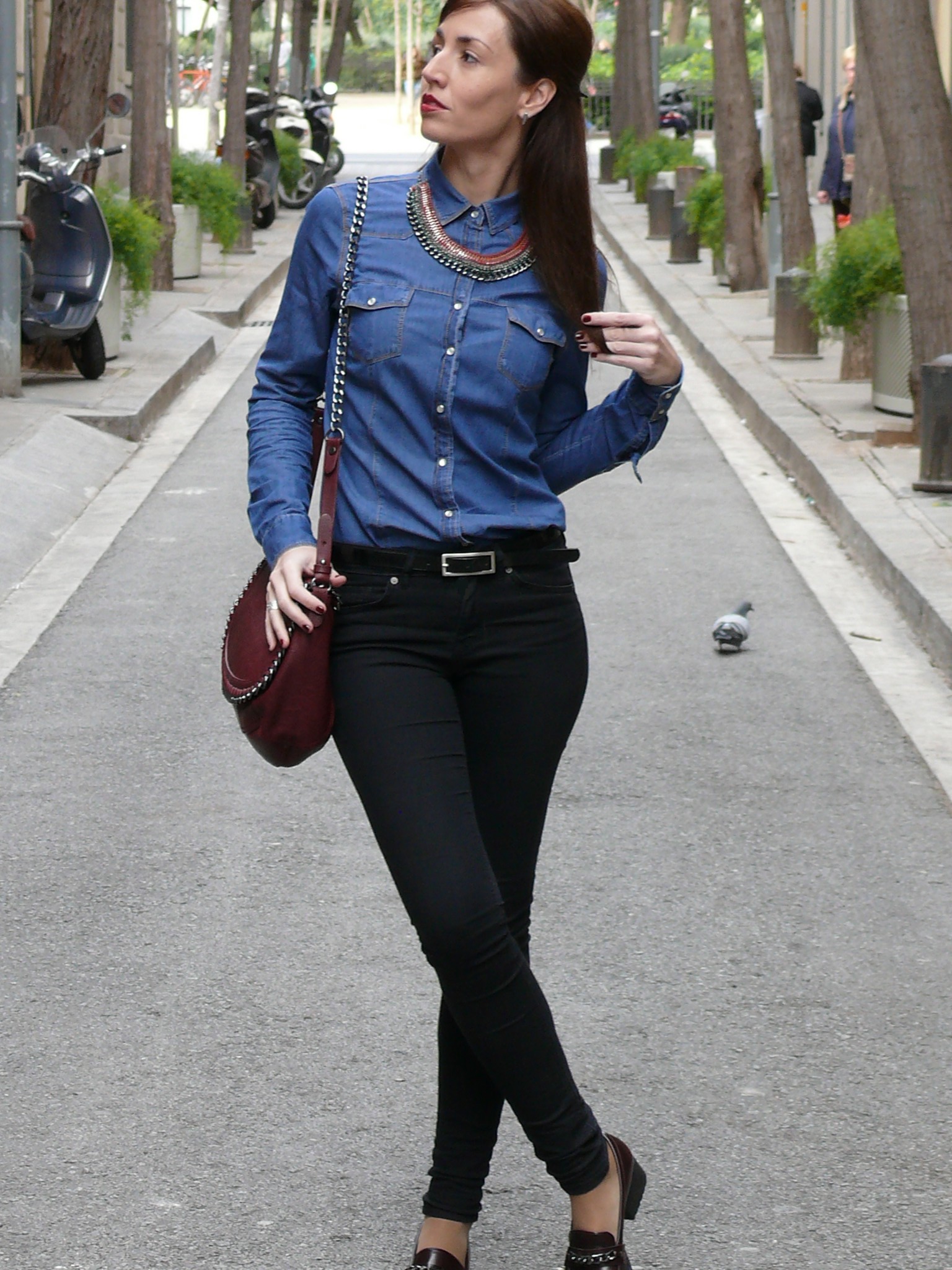 ¡Hola! Hoy toca un look en el que combino una camisa denim con el resto de prendas en negro y complementos en burgundy -o granate de toda la vida-. Una mezcla fácil y que funciona sobre todo en otoño/invierno.