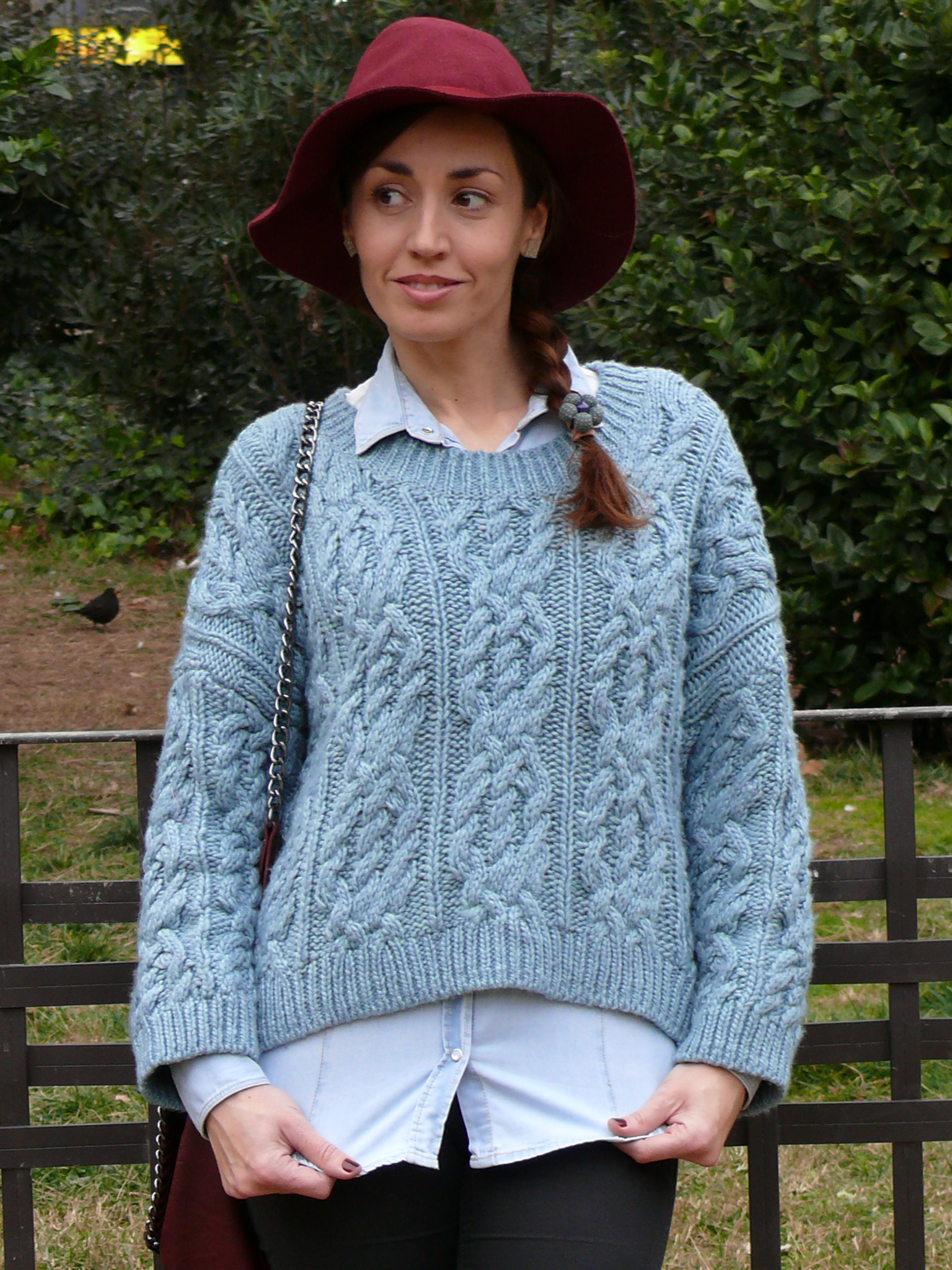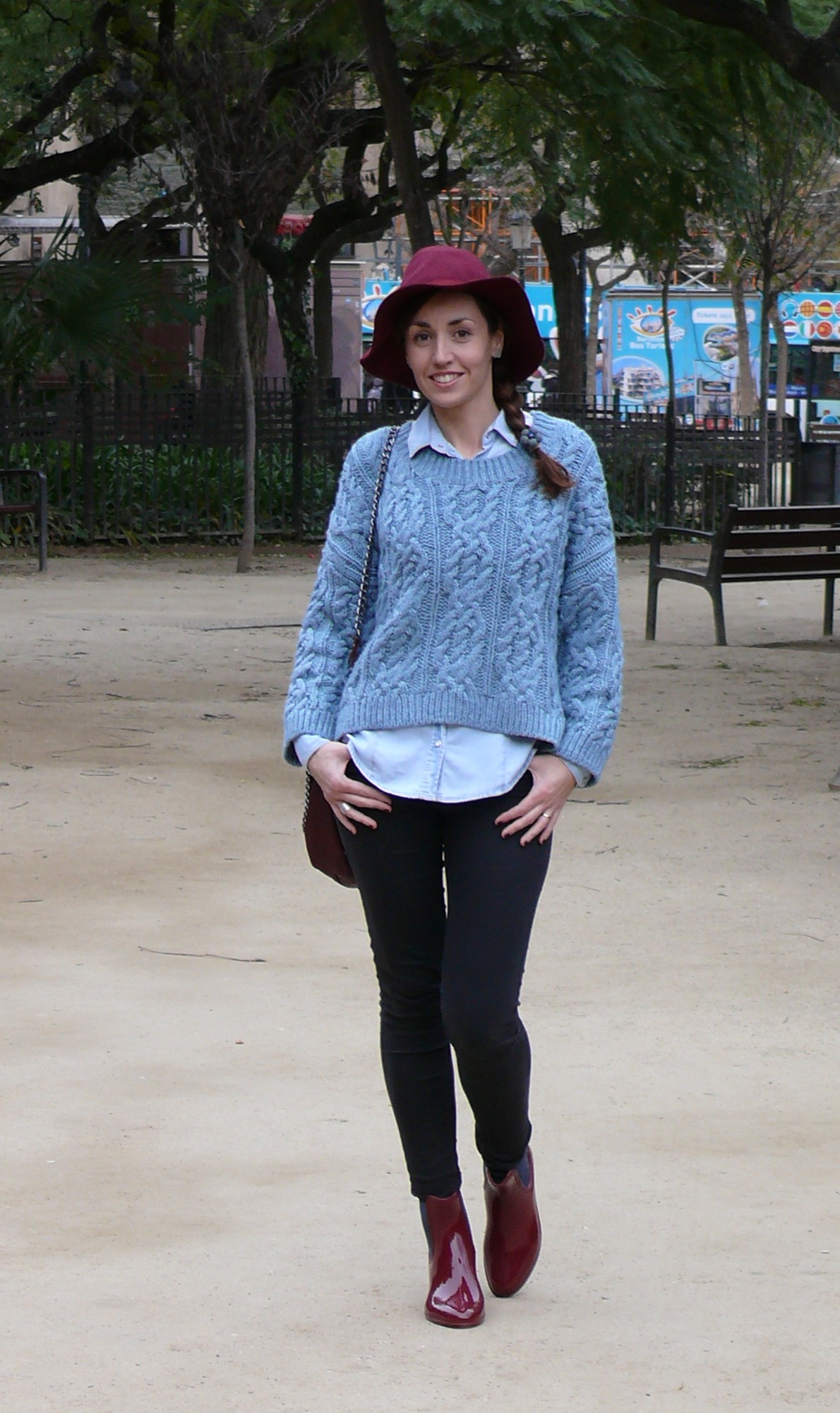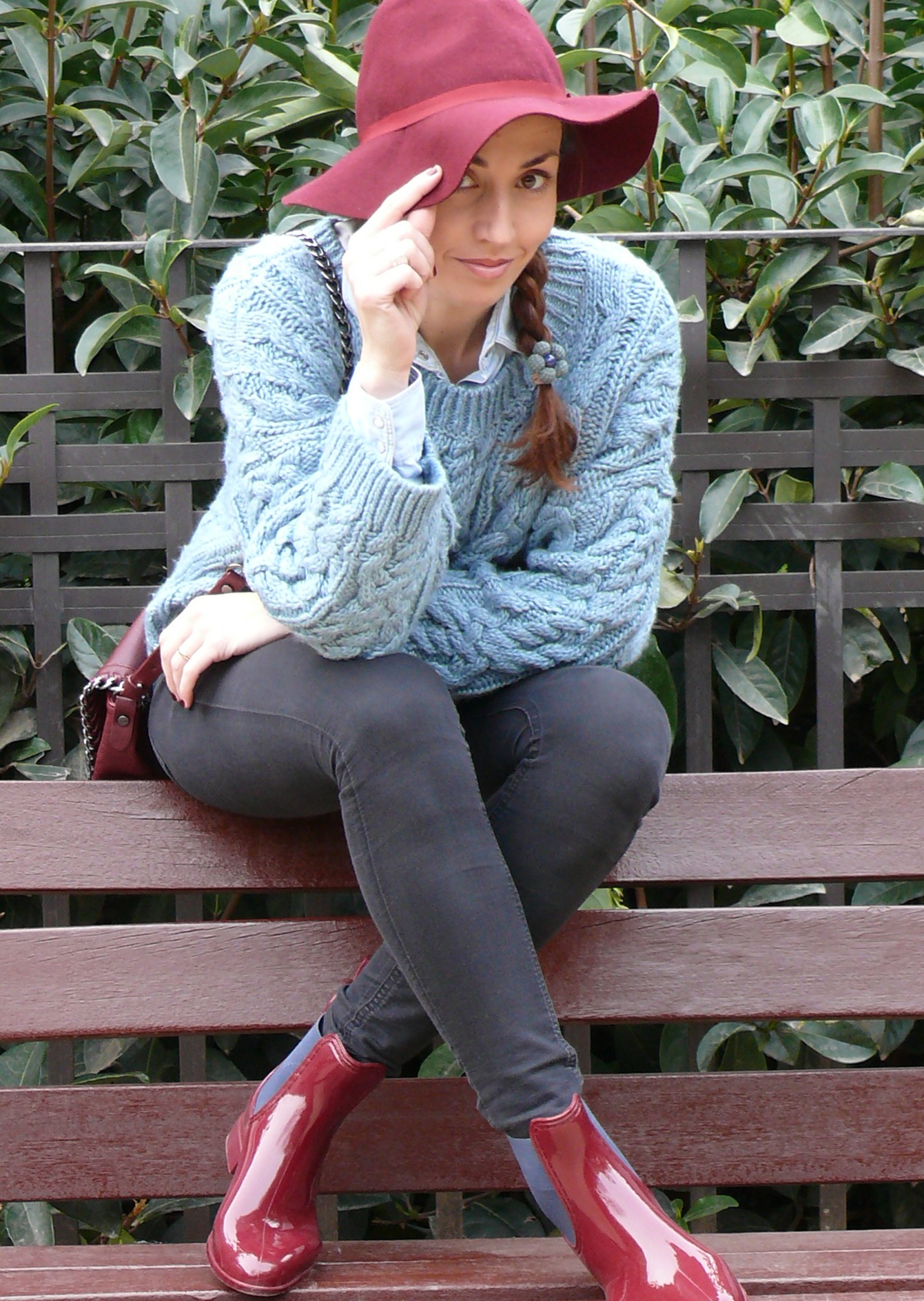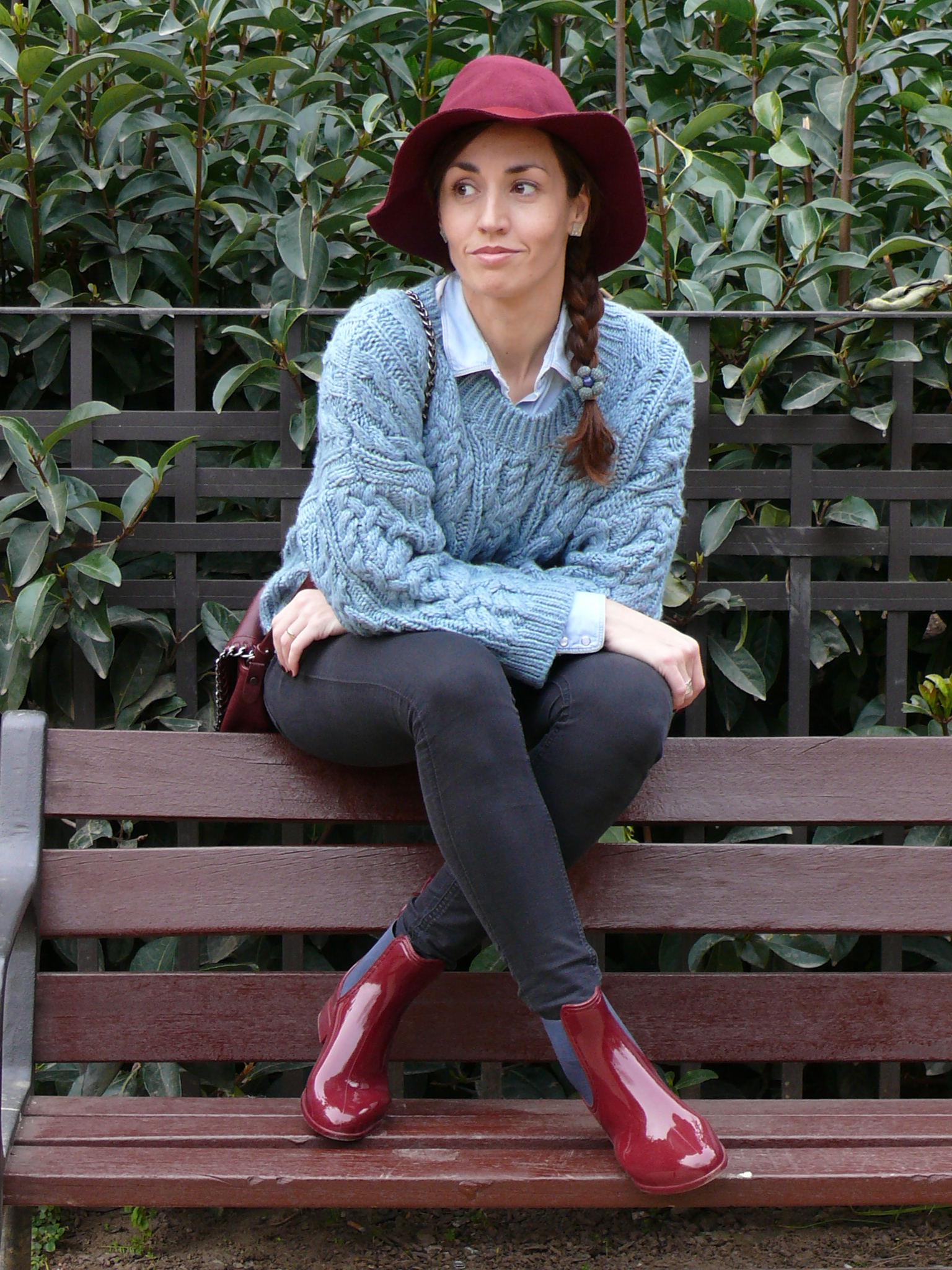 ¡Hola! Para terminar la semana, un look muy cómodo compuesto por vaqueros, jersey oversize, mini botas de agua (regalito de Reyes que tenía pendiente enseñaros), y sombrero para darle el toque chic. Recurro otra vez al tono burgundy como protagonista principal de los complementos, porque claro está que tengo que amortizarlos, y sólo falta que ahora me caigan del cielo estos botines del mismo color… 🙂