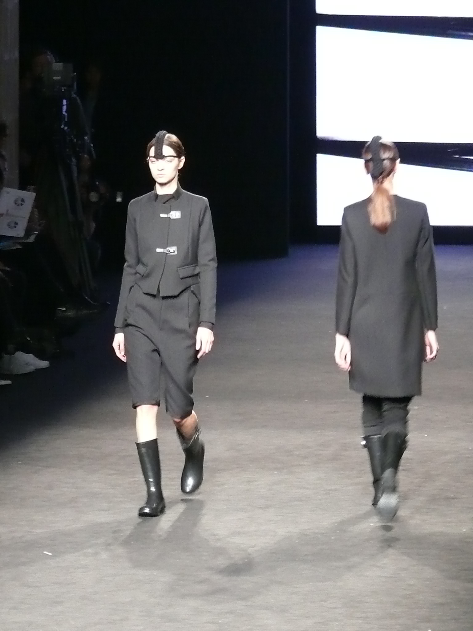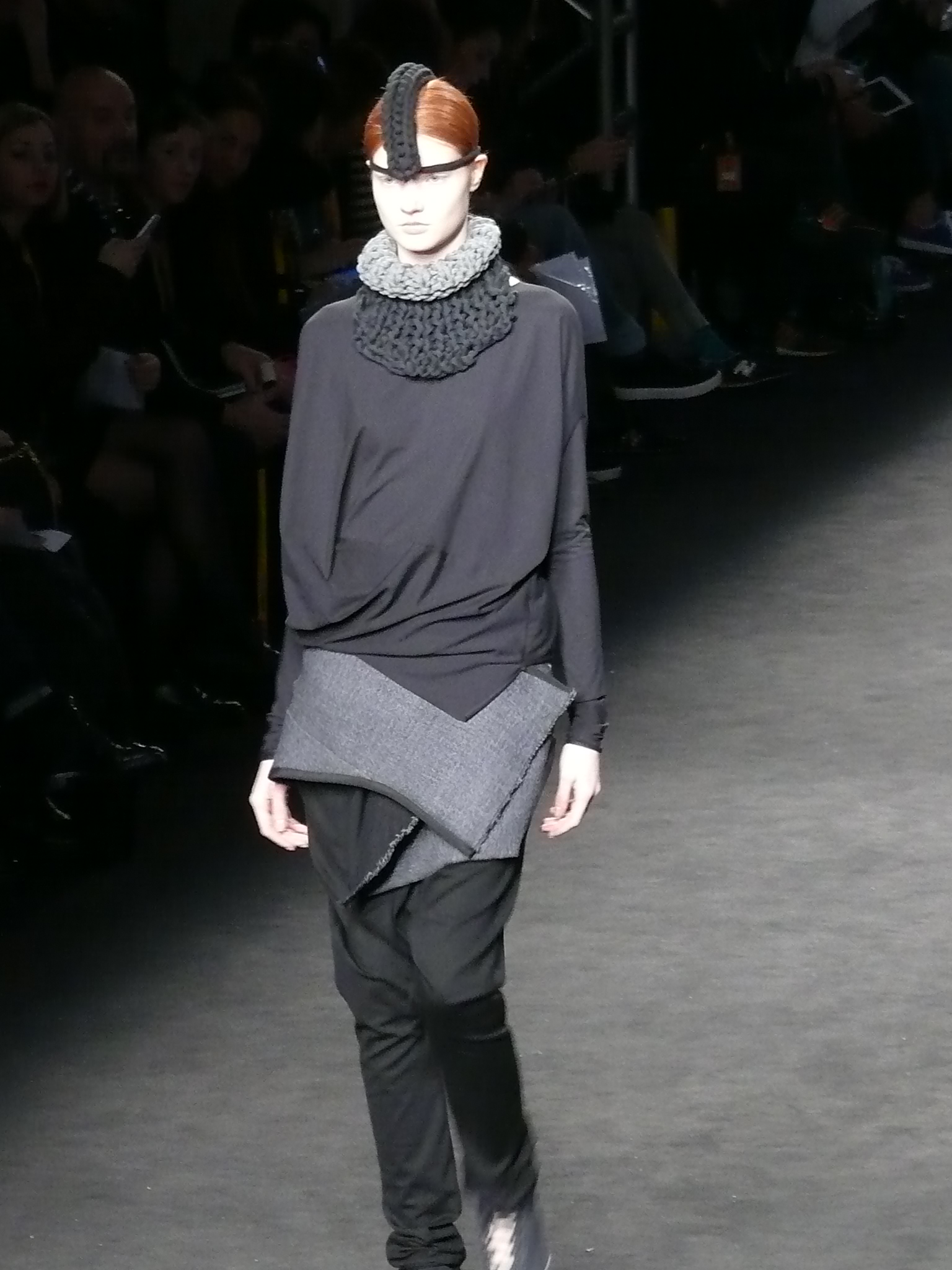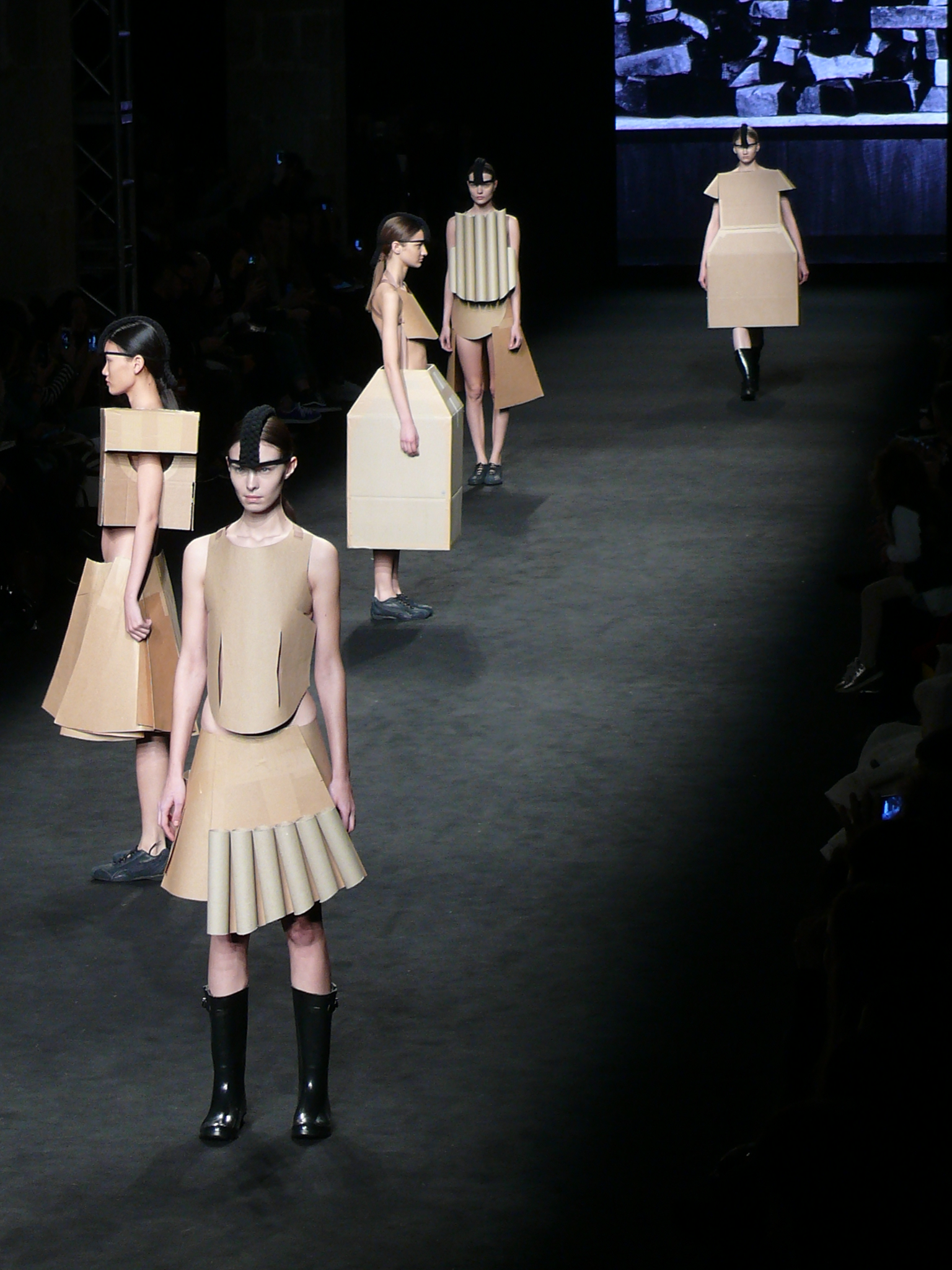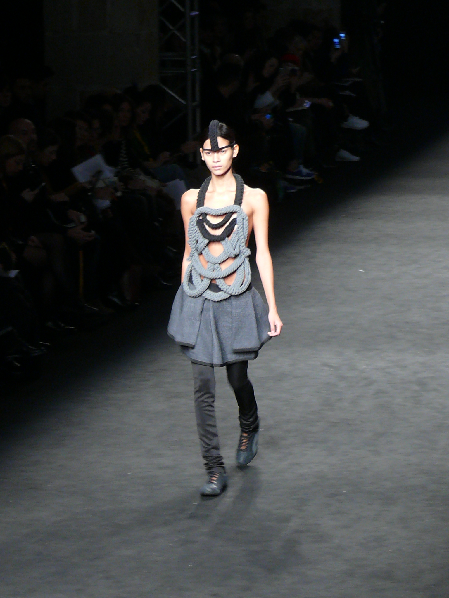 Por una parte el de la diseñadora Txell Miras, con creaciones que combinan materiales técnicos y materiales nobles naturales (com el cartón), predominando los colores burdeos, gris, blanco y negro.