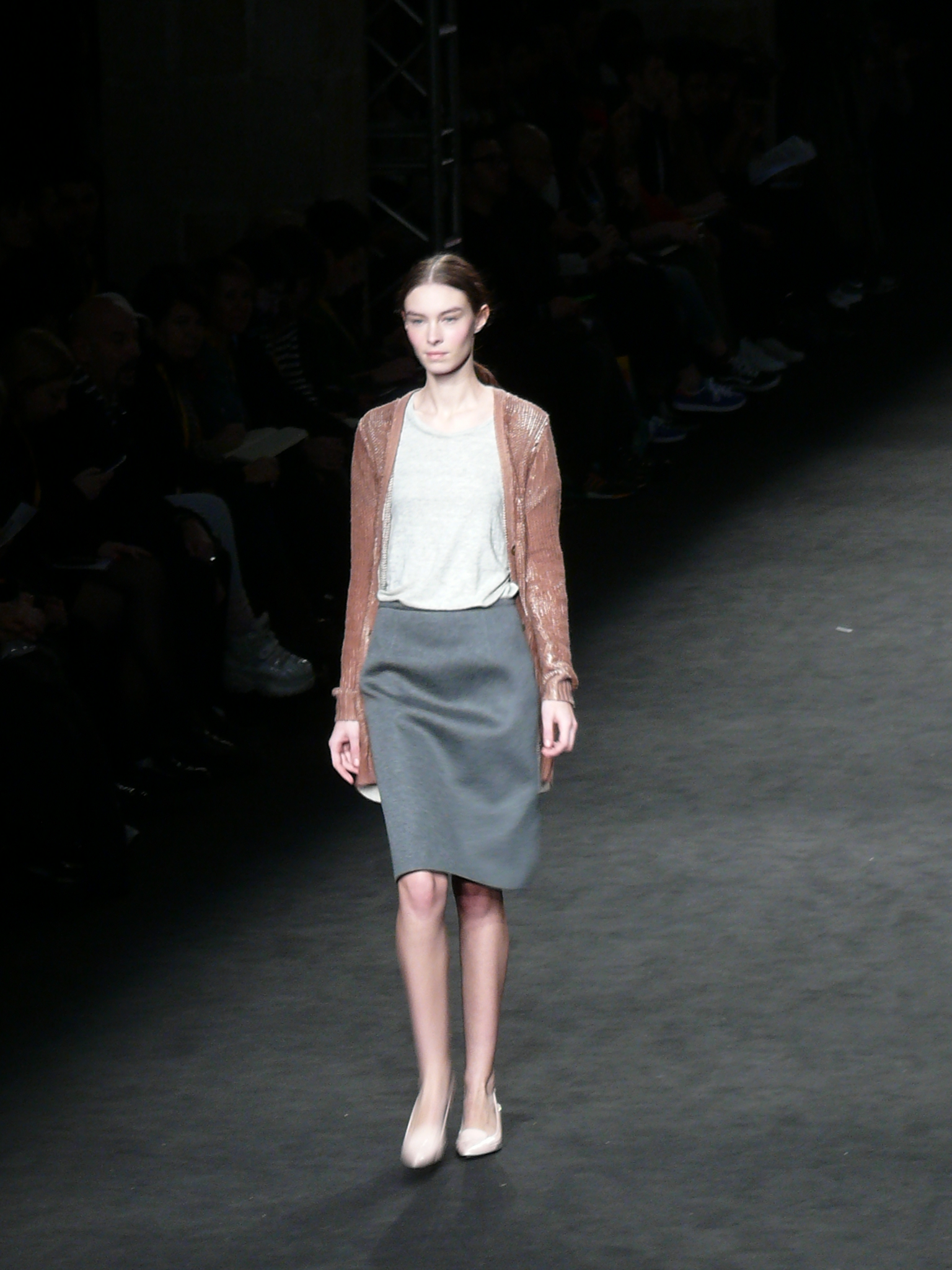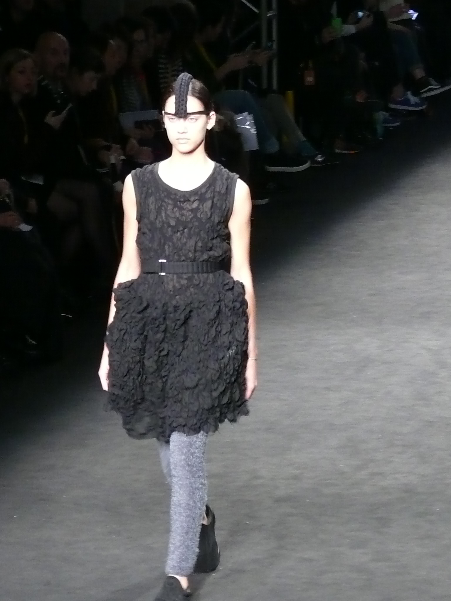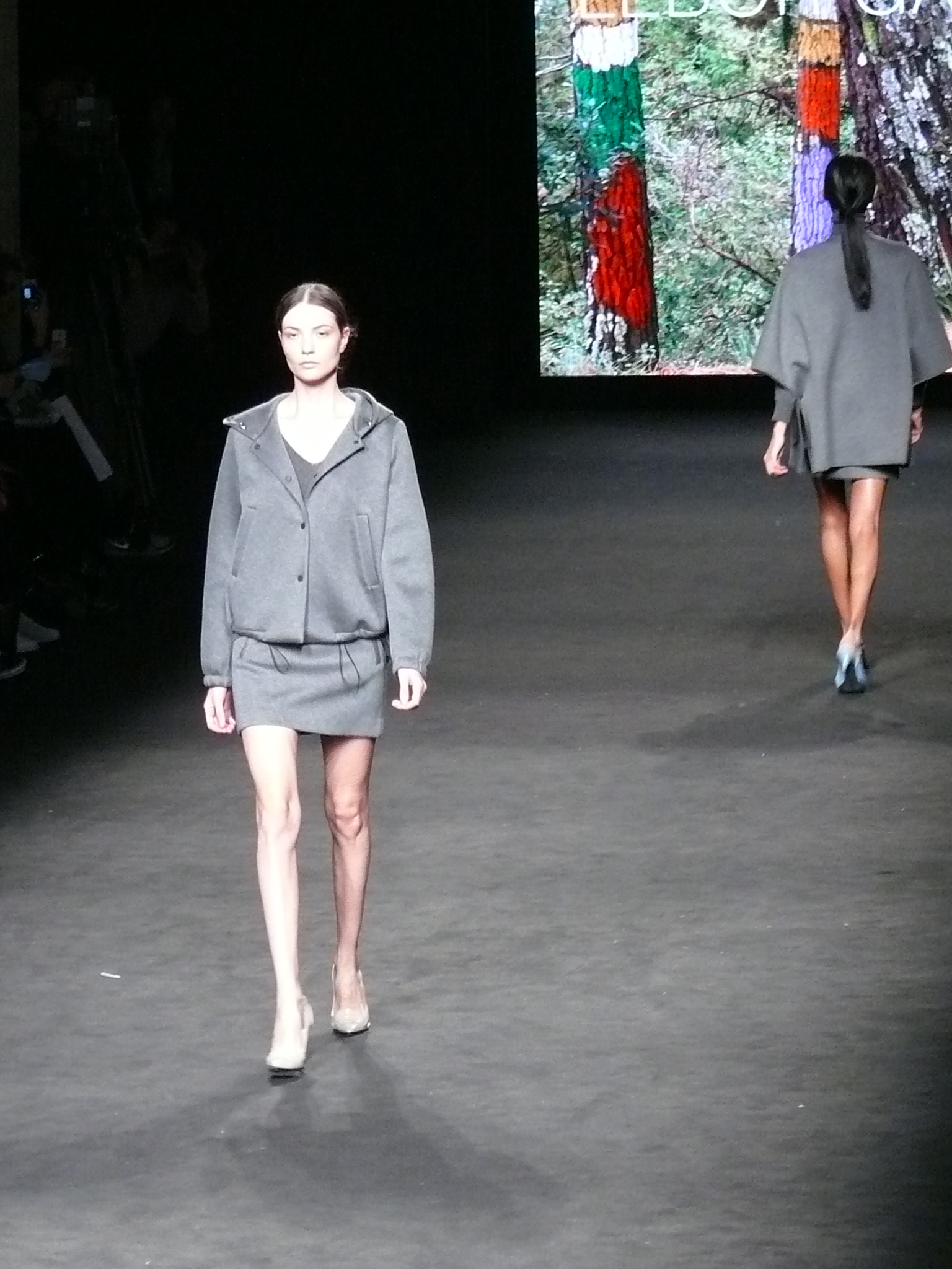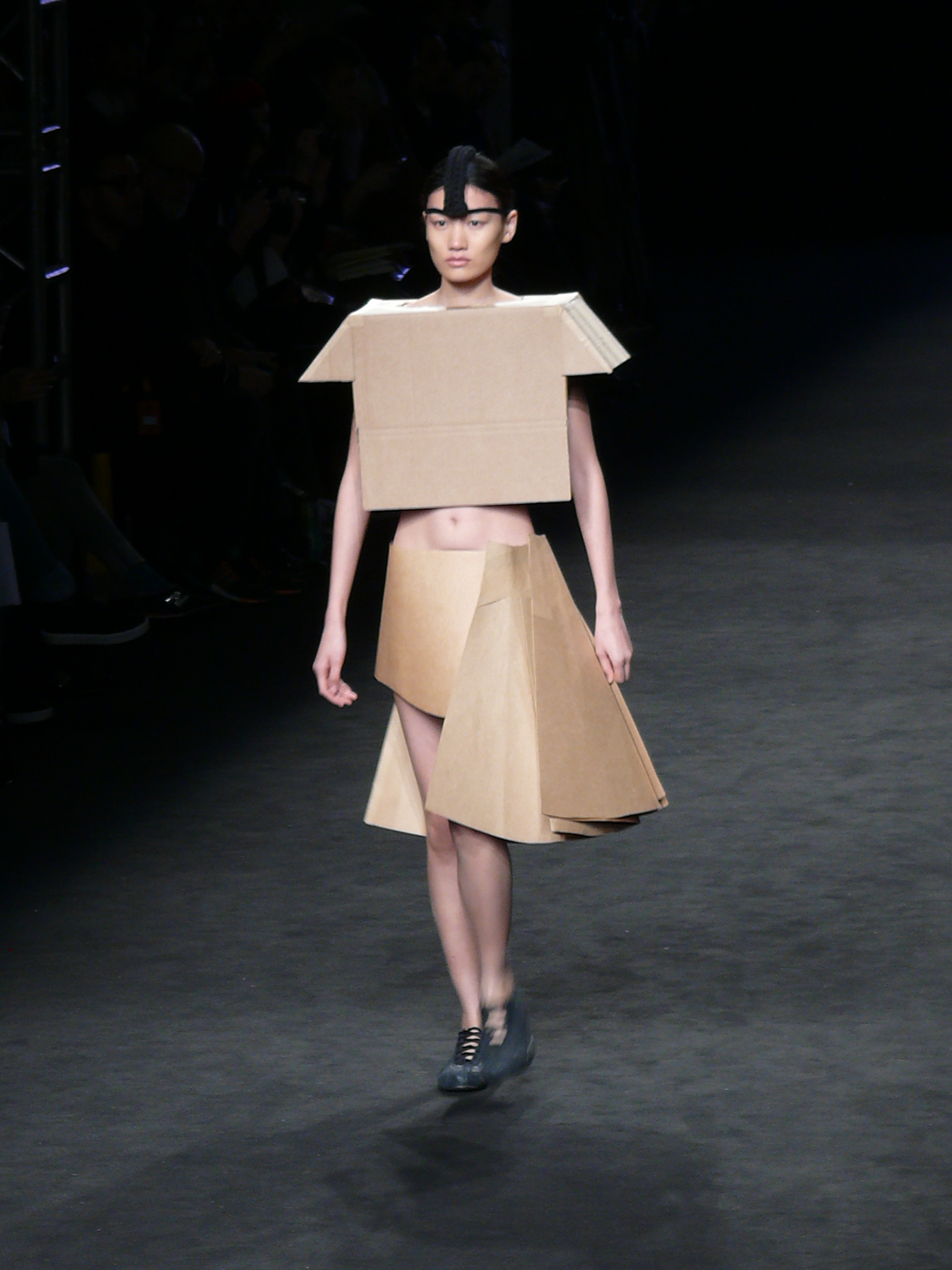Por una parte el de la diseñadora Txell Miras, con creaciones que combinan materiales técnicos y materiales nobles naturales (com el cartón), predominando los colores burdeos, gris, blanco y negro.