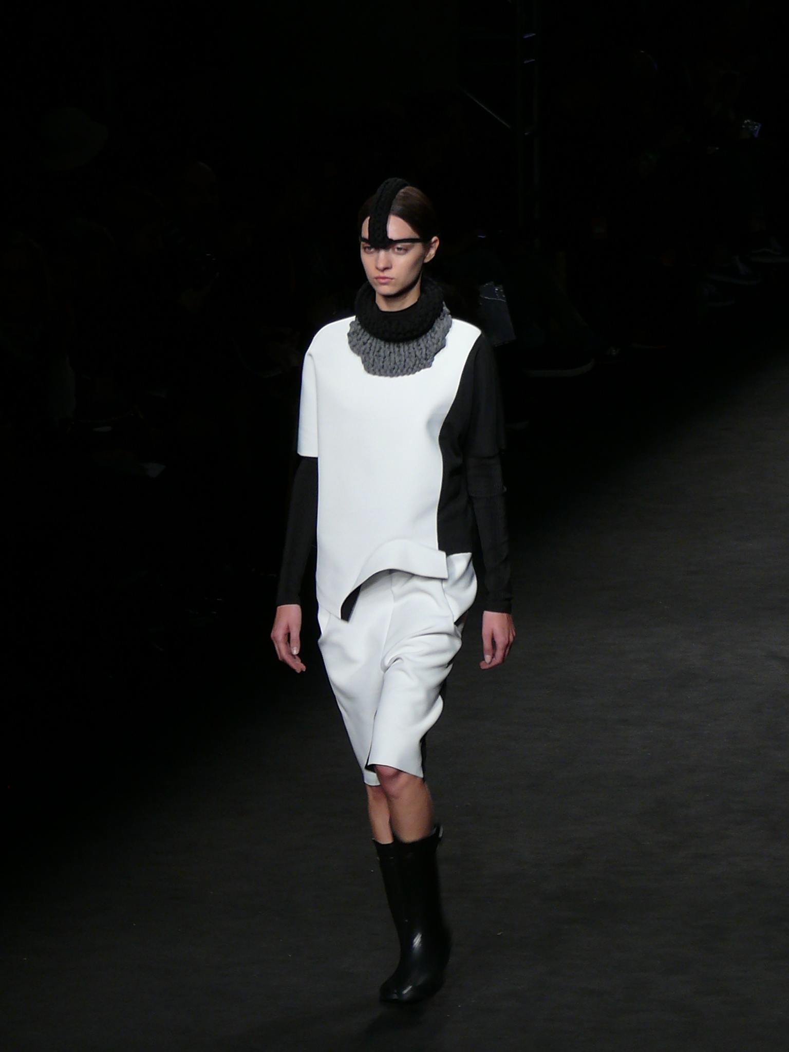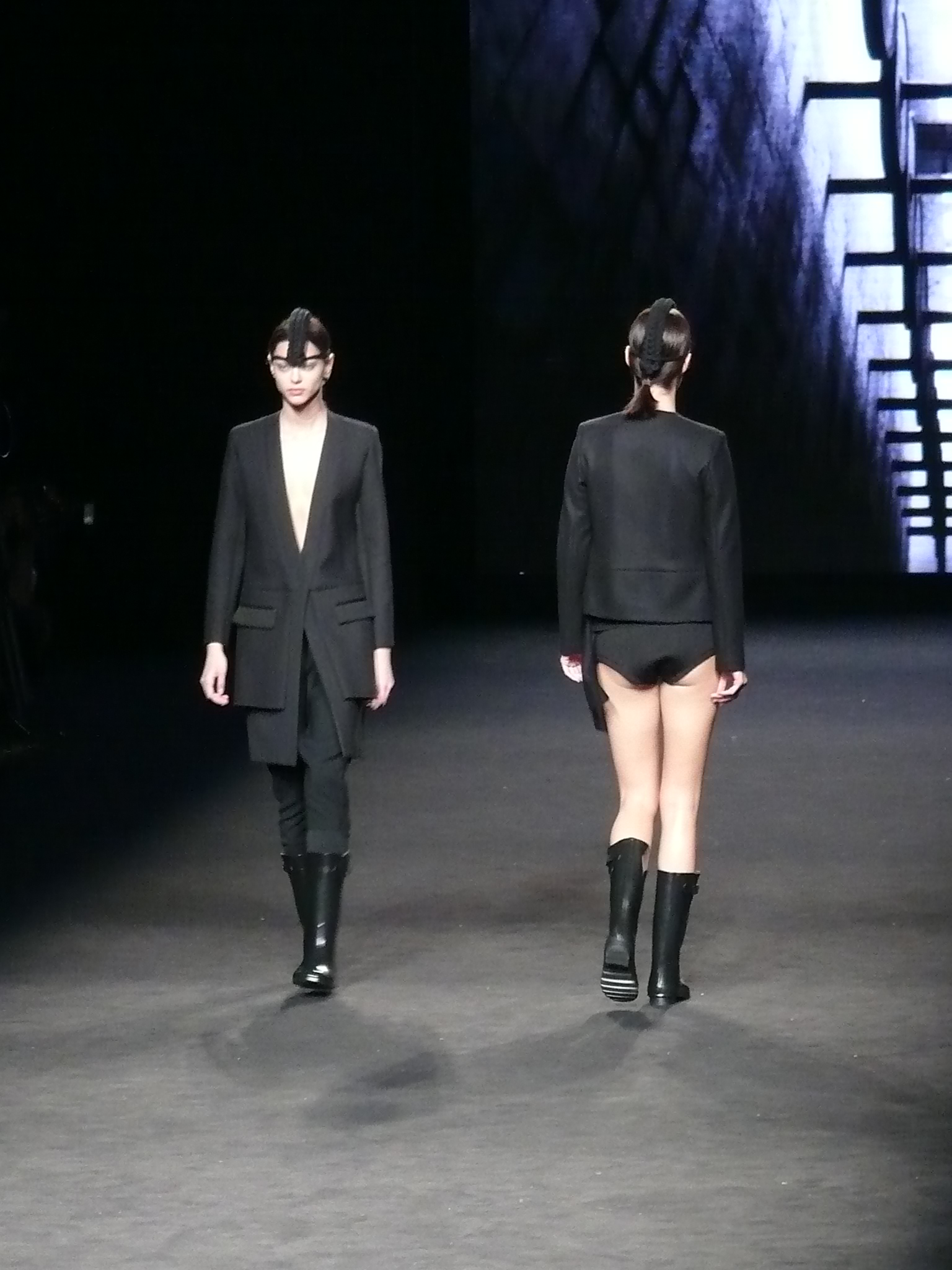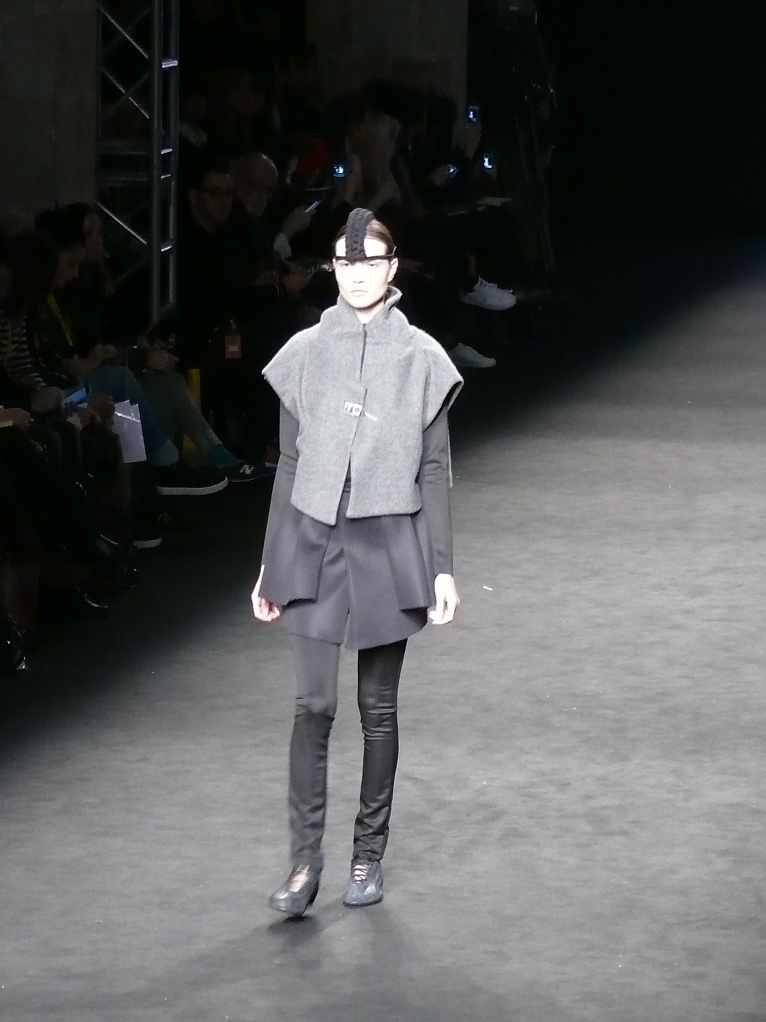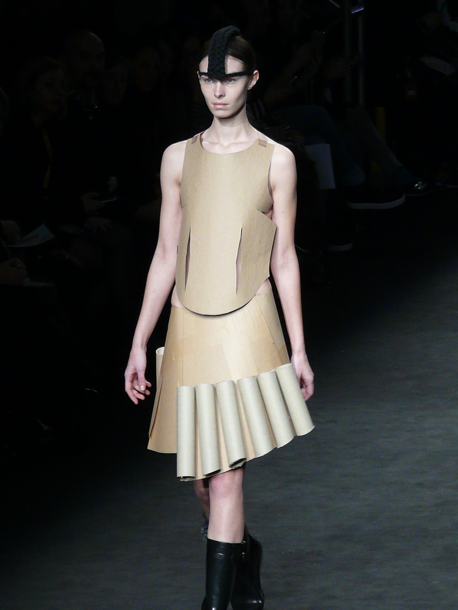 Por una parte el de la diseñadora Txell Miras, con creaciones que combinan materiales técnicos y materiales nobles naturales (com el cartón), predominando los colores burdeos, gris, blanco y negro.