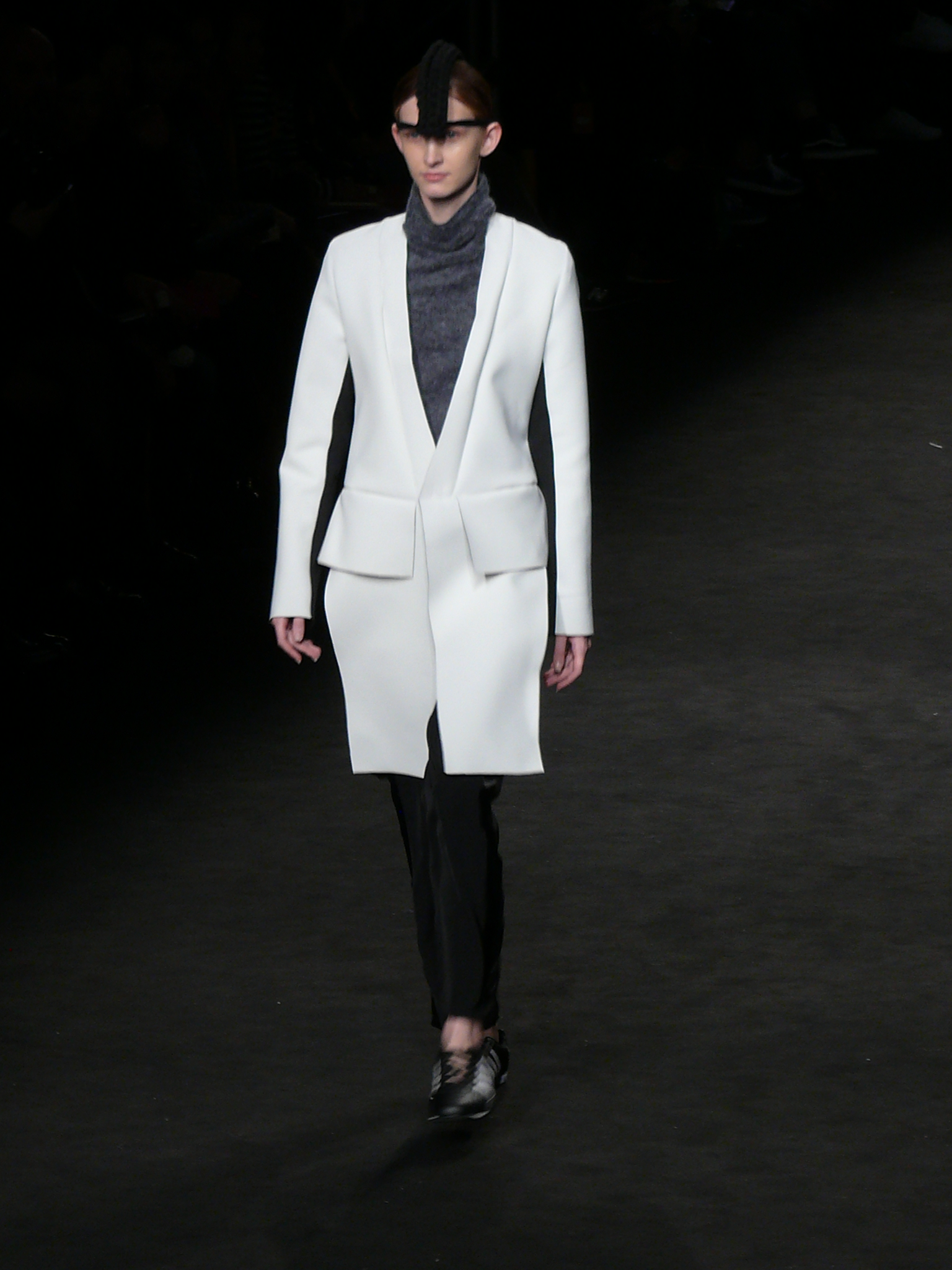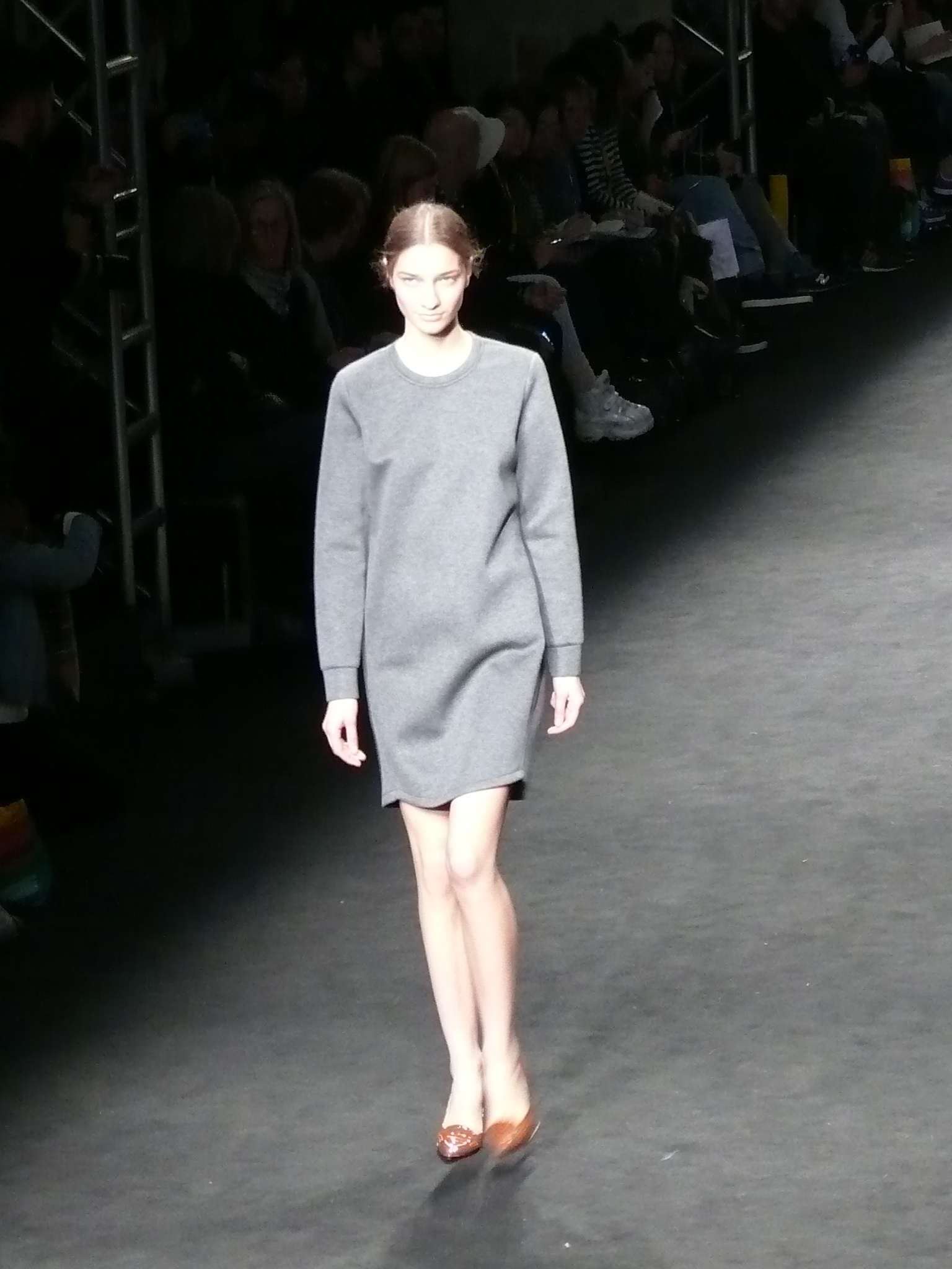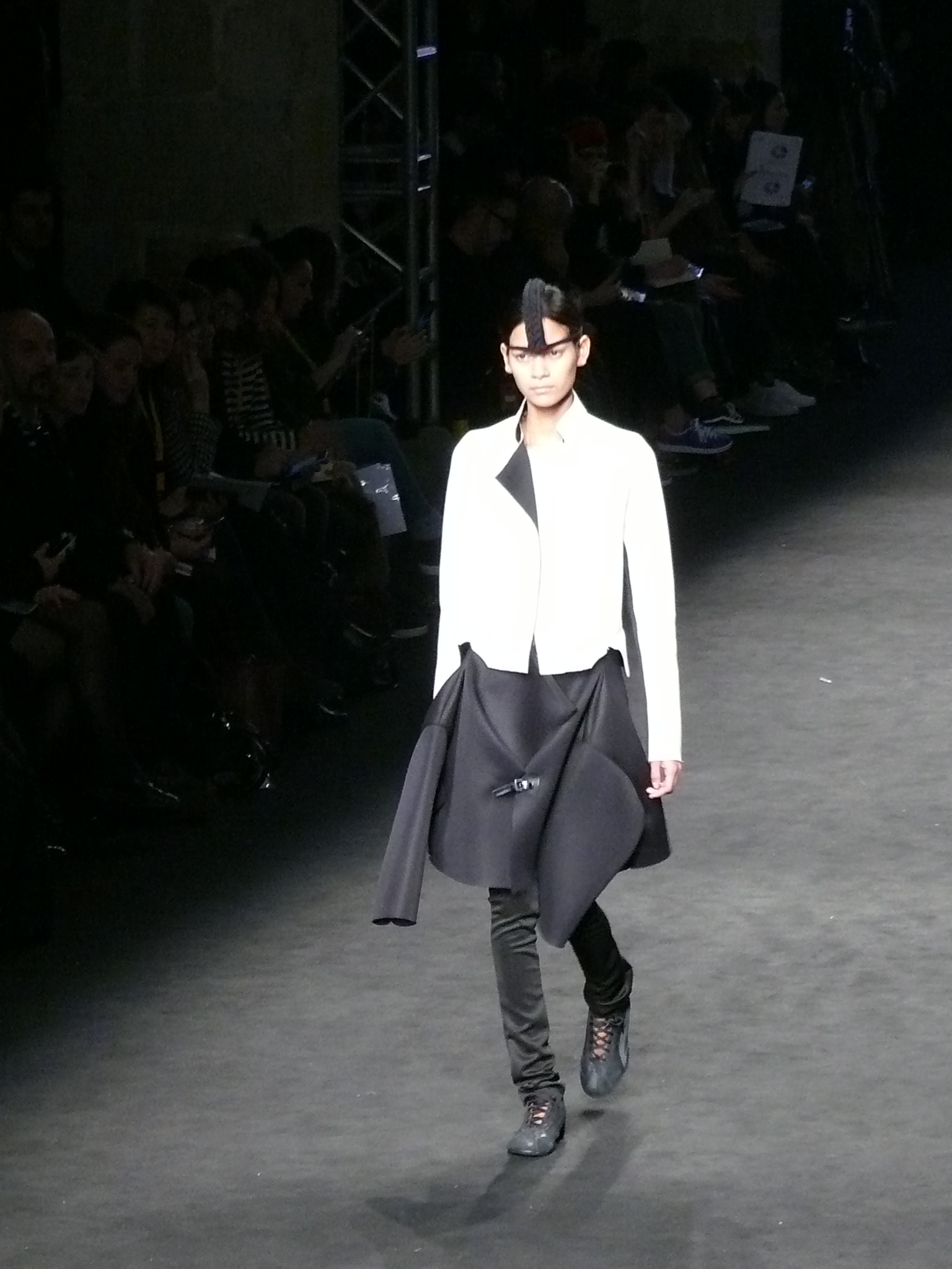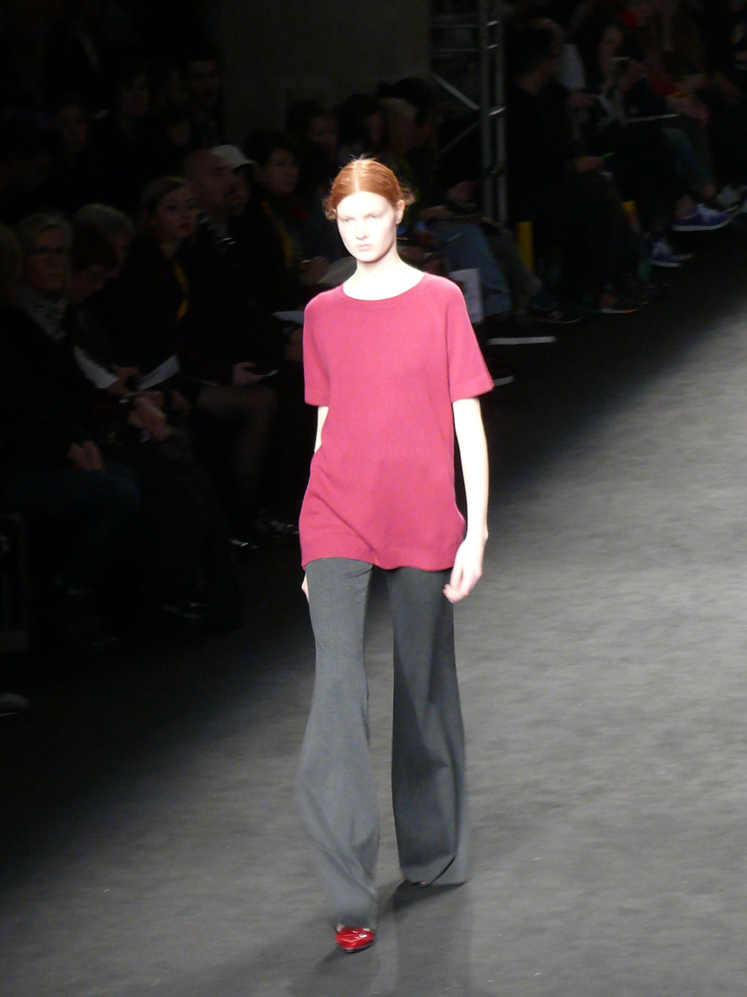 Por una parte el de la diseñadora Txell Miras, con creaciones que combinan materiales técnicos y materiales nobles naturales (com el cartón), predominando los colores burdeos, gris, blanco y negro.