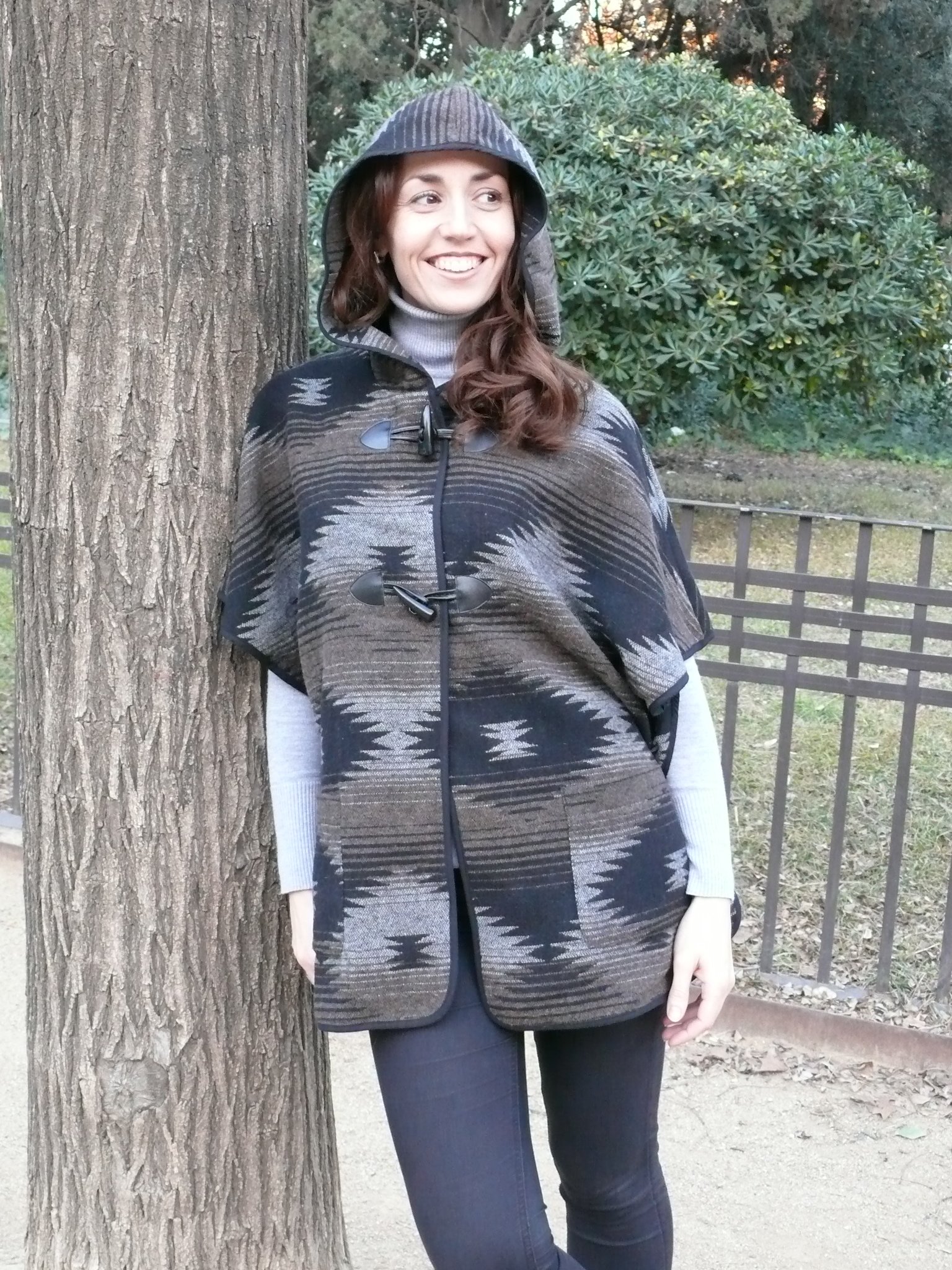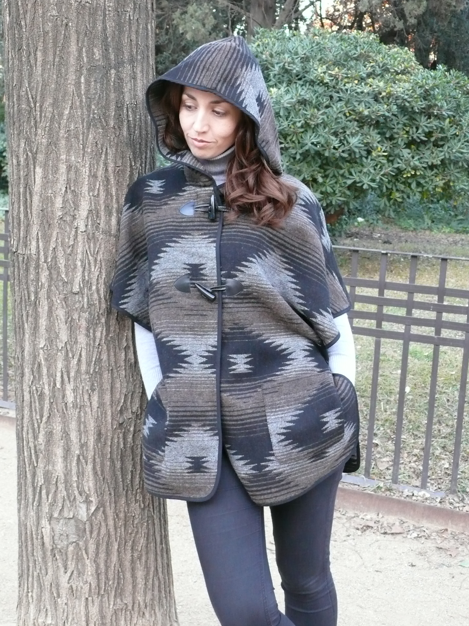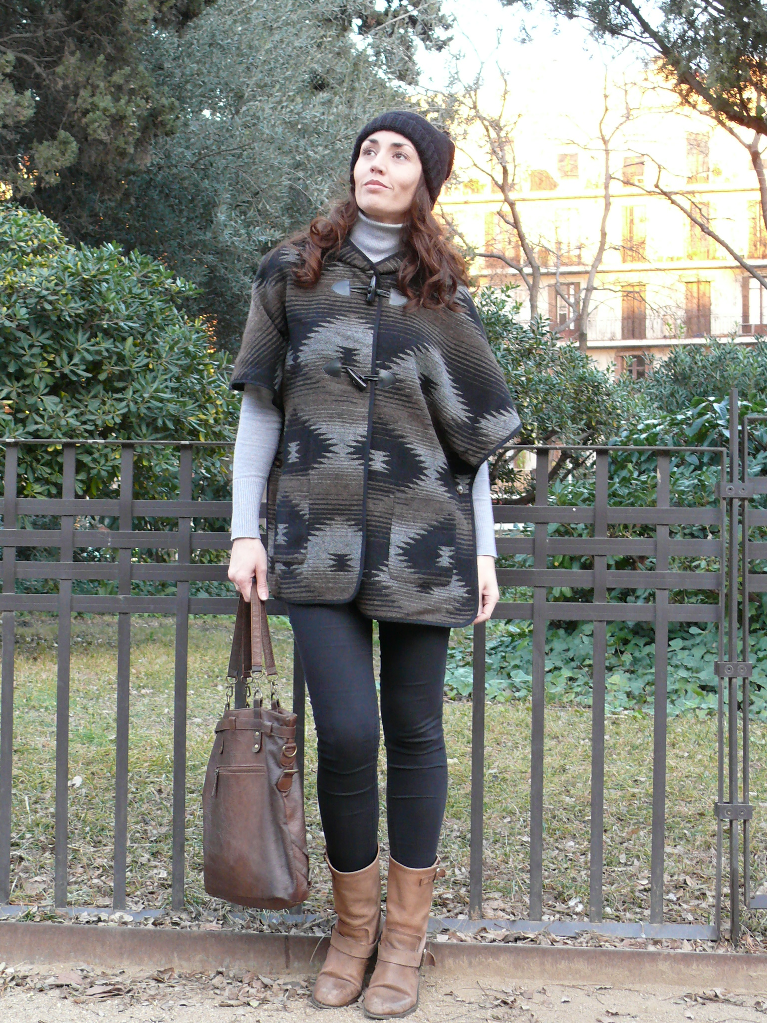 ¡Hola! Empezamos la semana con un look para esos días que parece que ya dejamos atrás el frío pero que, cuando se esconde el sol, nos recuerda que el invierno todavía sigue presente. Capa/poncho de estilo étnico (de mi hermana 😉 ), combinado con básicos en negro y gris y complementos en marrón.
