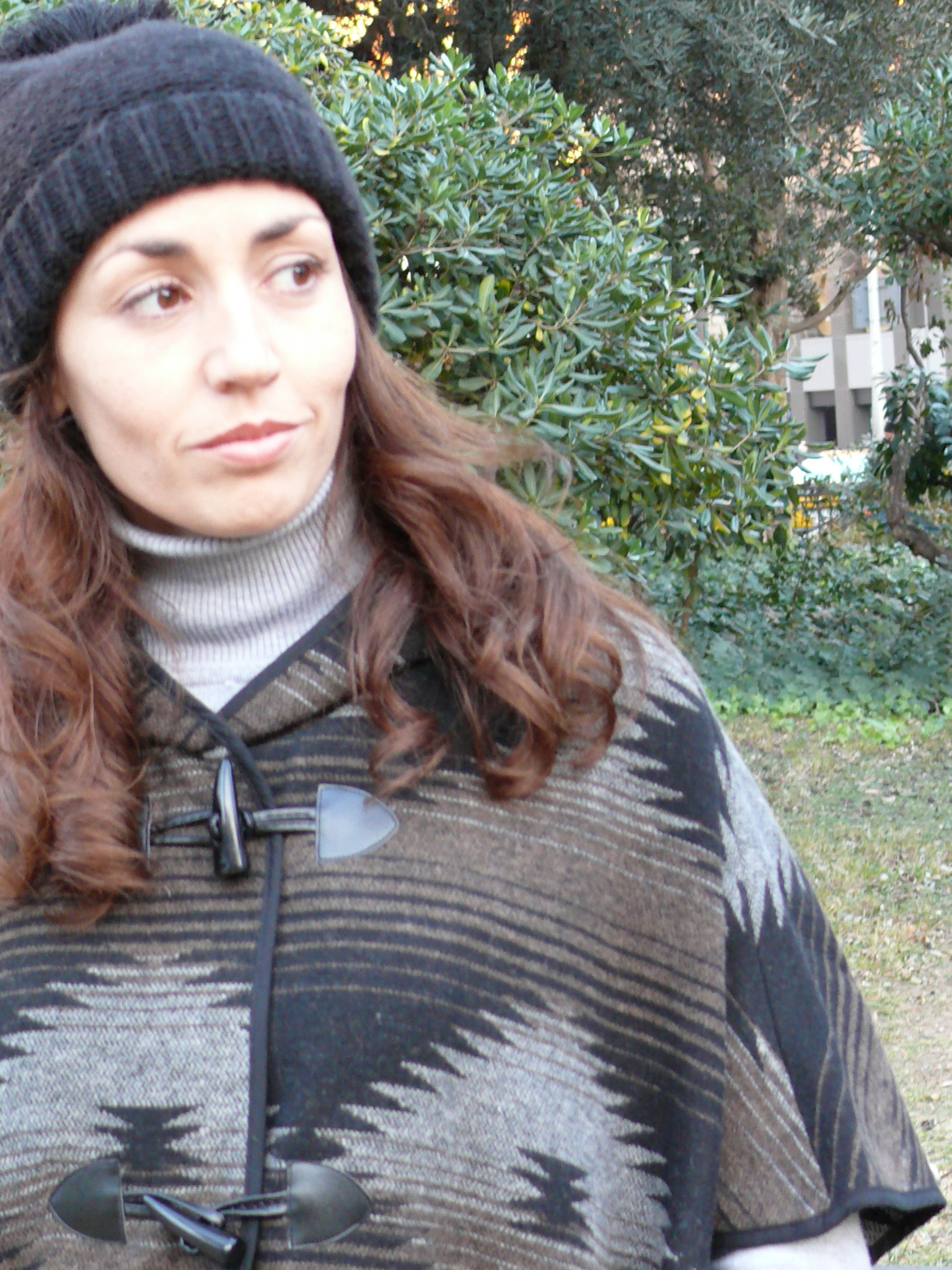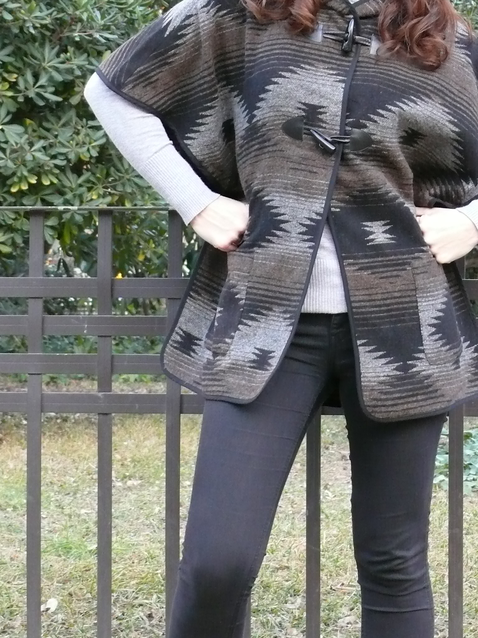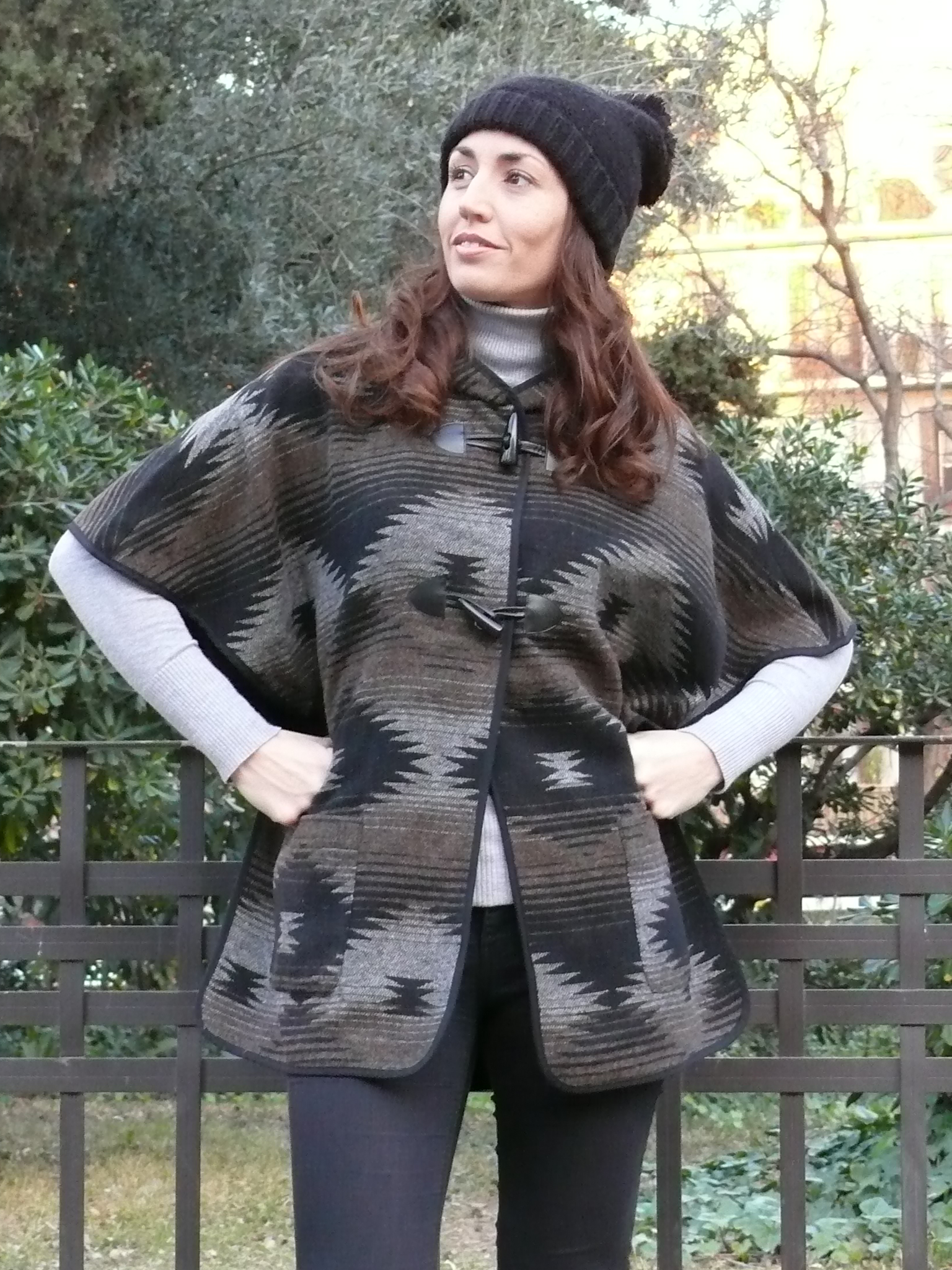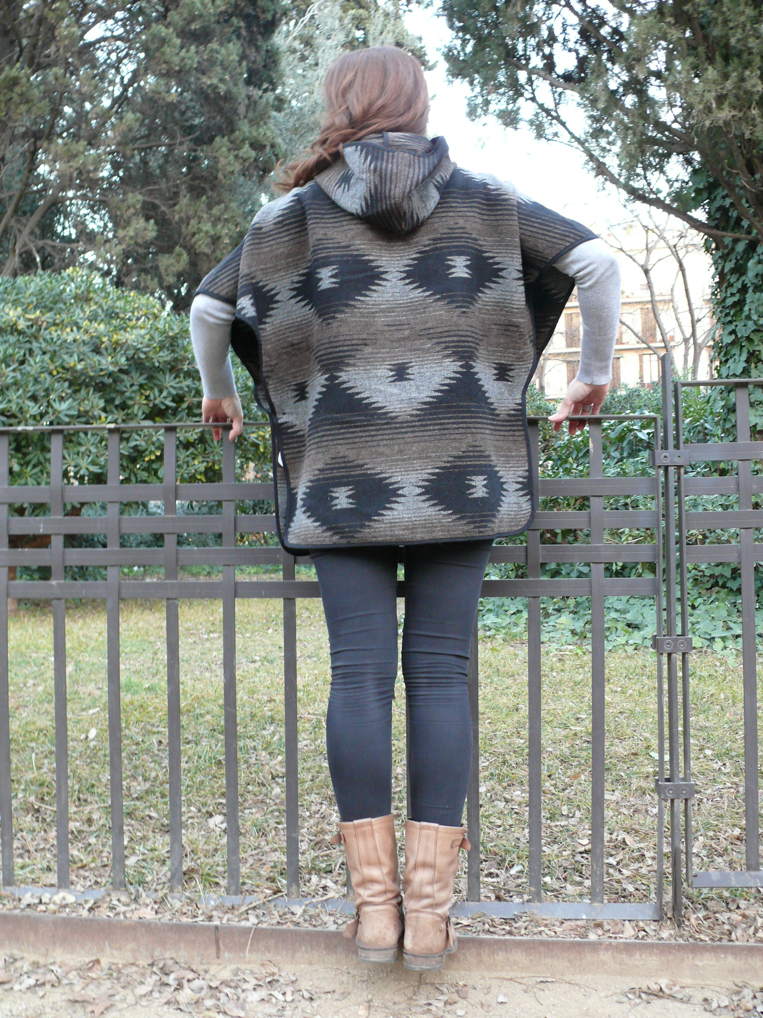 ¡Hola! Empezamos la semana con un look para esos días que parece que ya dejamos atrás el frío pero que, cuando se esconde el sol, nos recuerda que el invierno todavía sigue presente. Capa/poncho de estilo étnico (de mi hermana 😉 ), combinado con básicos en negro y gris y complementos en marrón.