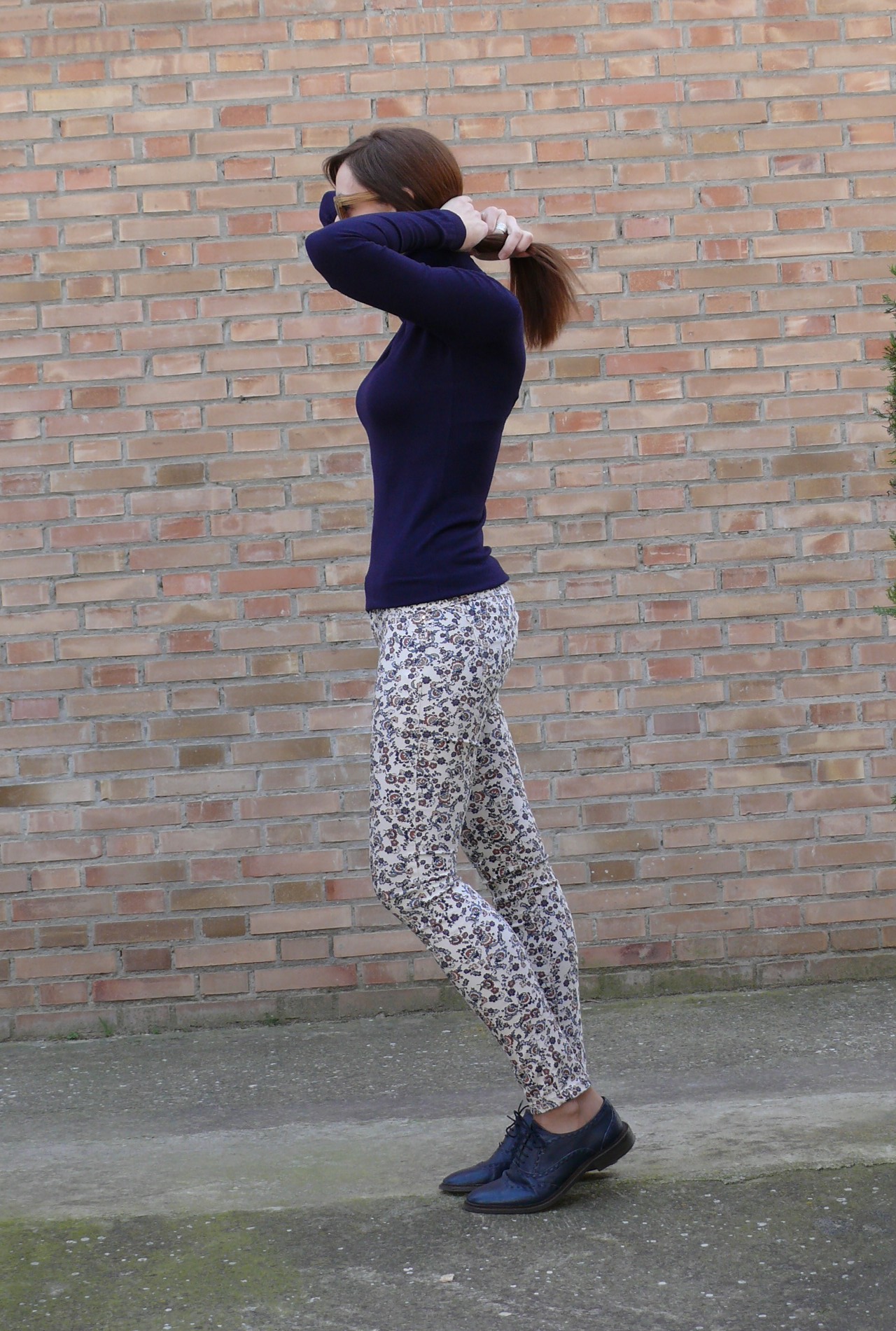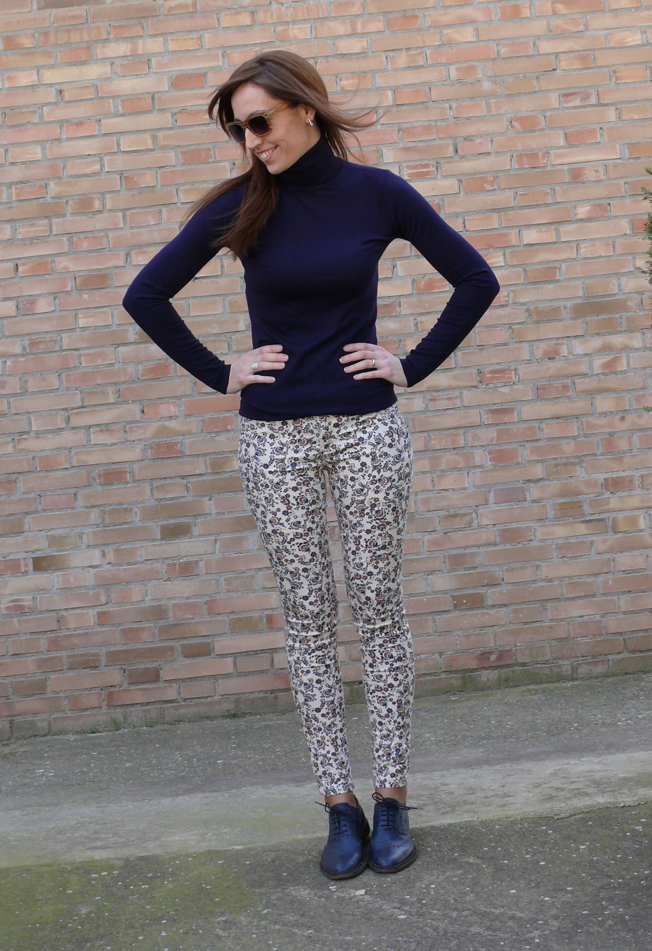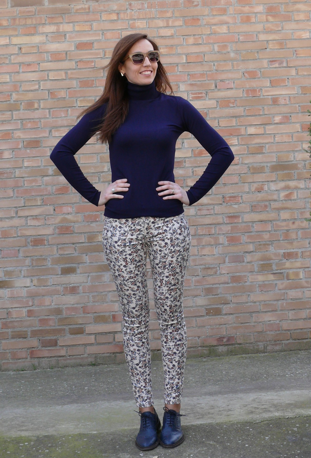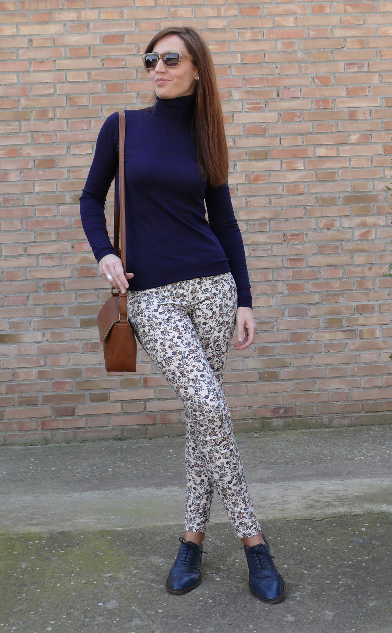 Hoy os dejo con un look cuyo protagonismo recae sobre estos pantalones en print floral, que combino con un jersey básico liso de cuello alto, y con los zapatos oxford que ya habéis visto por aquí y que tanto me gustan. Un look casual, comodísimo para un día de working.