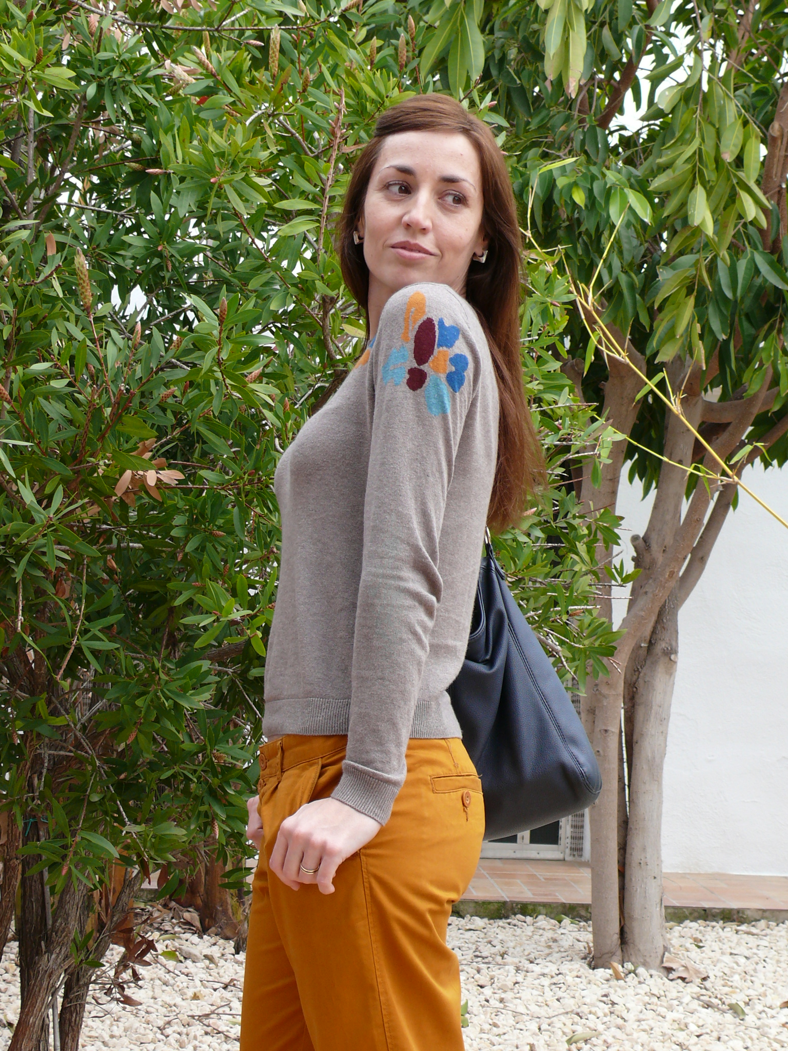 Destaco el pantalón mostaza de este look como poco favorecedor, porque es un poco «anchote» casi bombacho y bajo de cintura, por lo tanto acorta y ensancha la figura. Creo que lo voy a echar del armario… 🙂