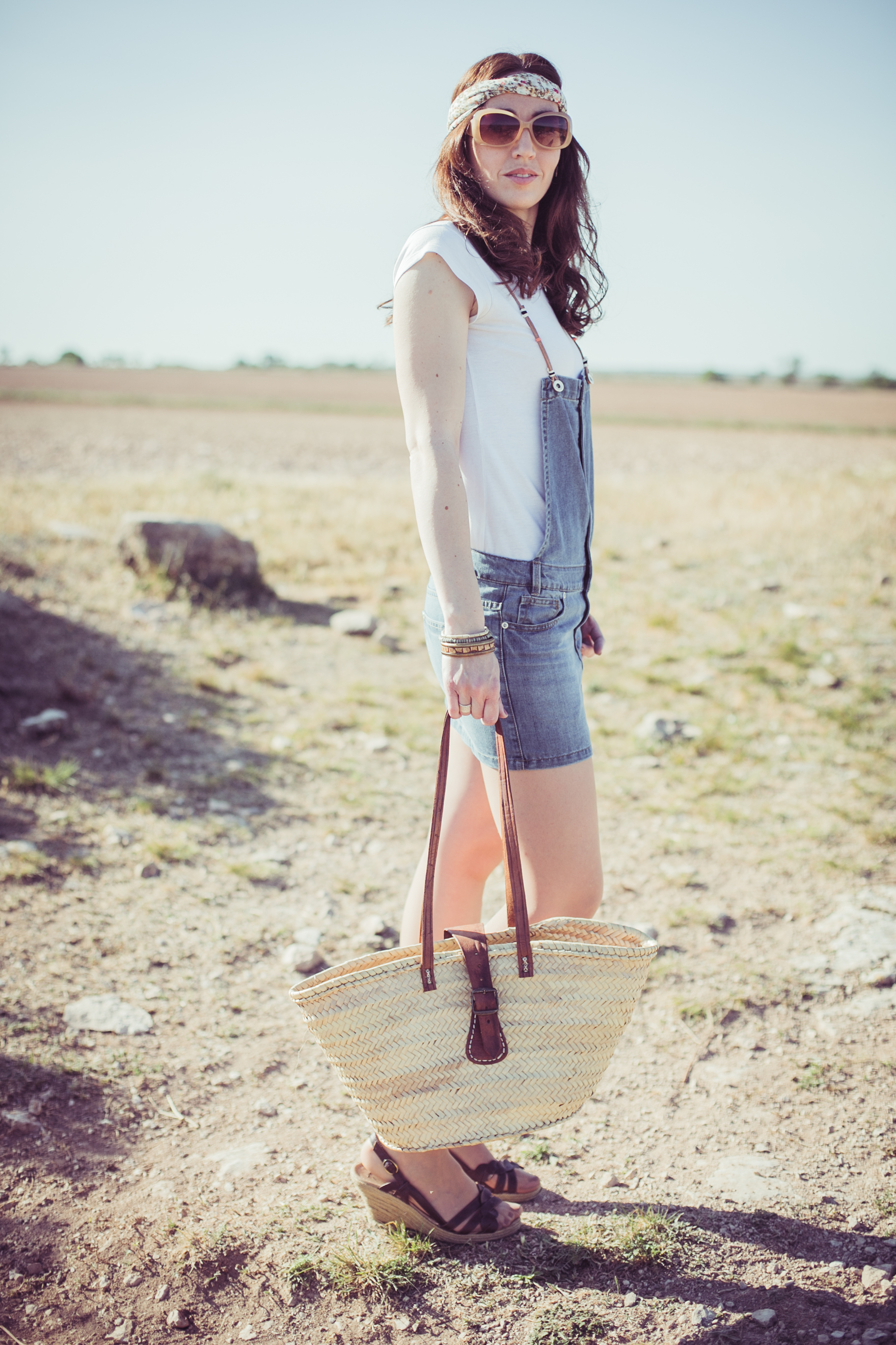 En esta ocasión el look es más campestre, con peto vaquero -una de las tendencias más «in» de la temporada-. En unas imágenes lo combino con sombrero y botines, y en las otras con bandana, cuñas y cesta de mimbre.