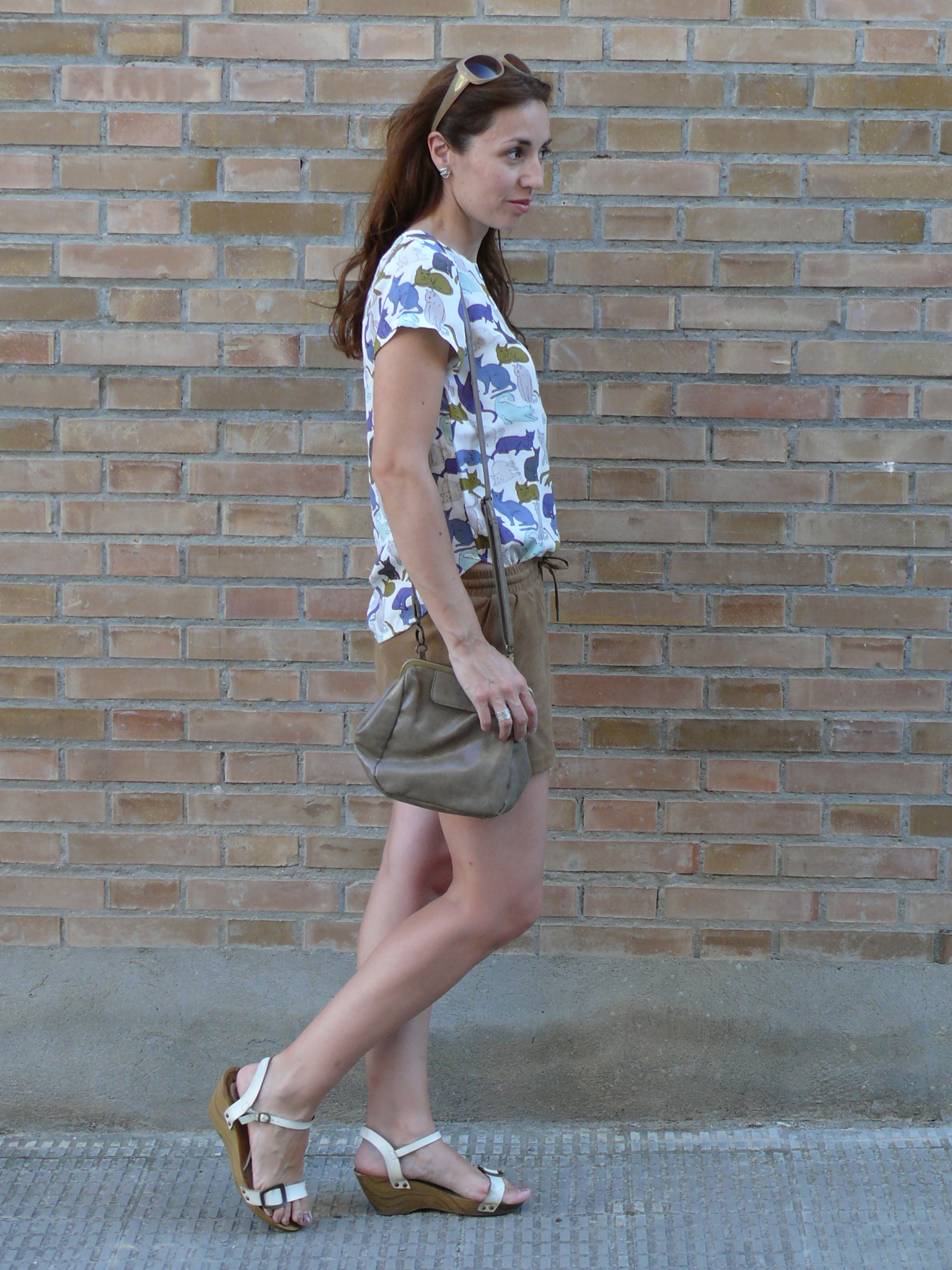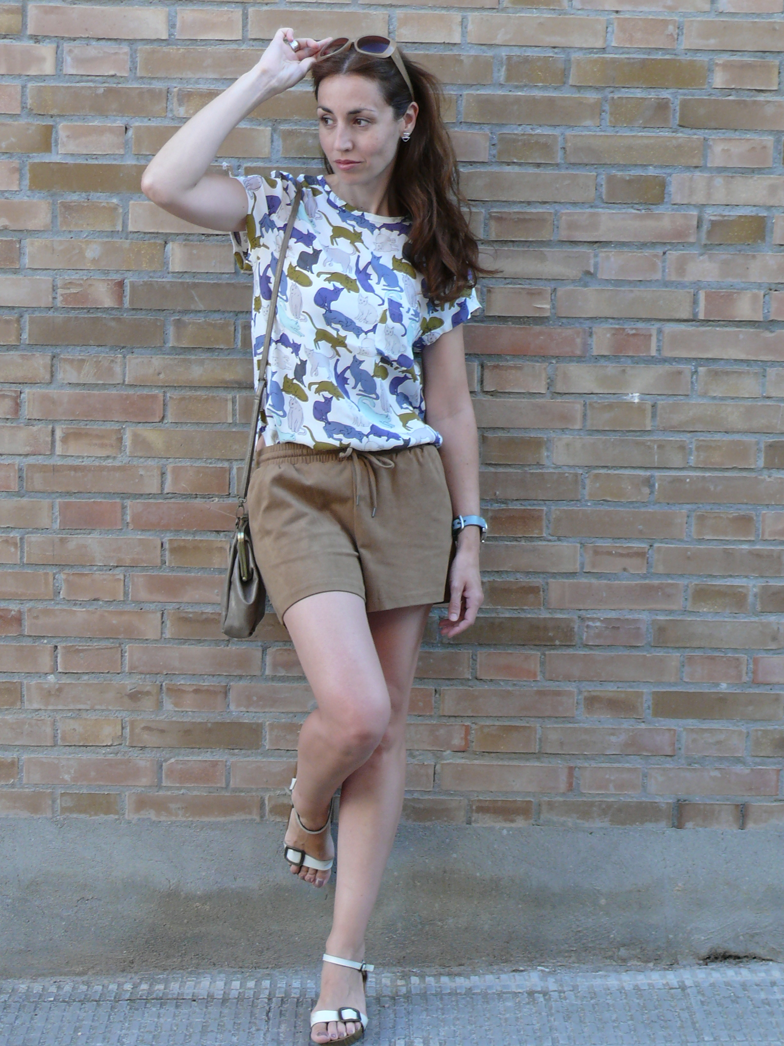 Hoy os dejo con un look, en el que predomina esta blusa estampada de gatitos. La combino con unos shorts en tono camel, que ya habéis visto con otras combis por aquí. A ver si os gusta el resultado! 😉