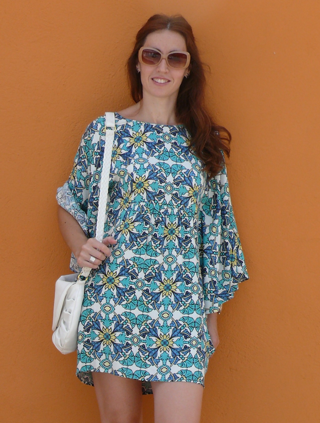 ¡Hola! Empiezo la semana con un look muy colorido! Un vestido corto, estampado, con mangas «murciélago» y de un tejido muy fresquito, ideal para el verano. Los complementos en blanco combinan genial al ser el color base del vestido.