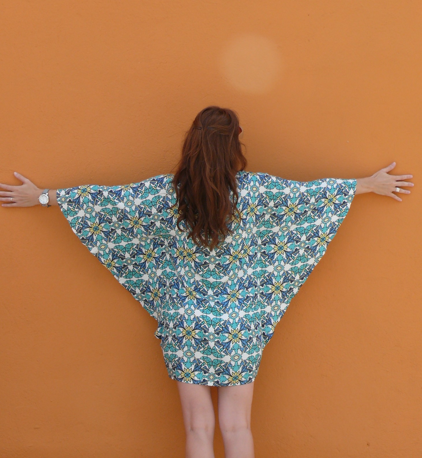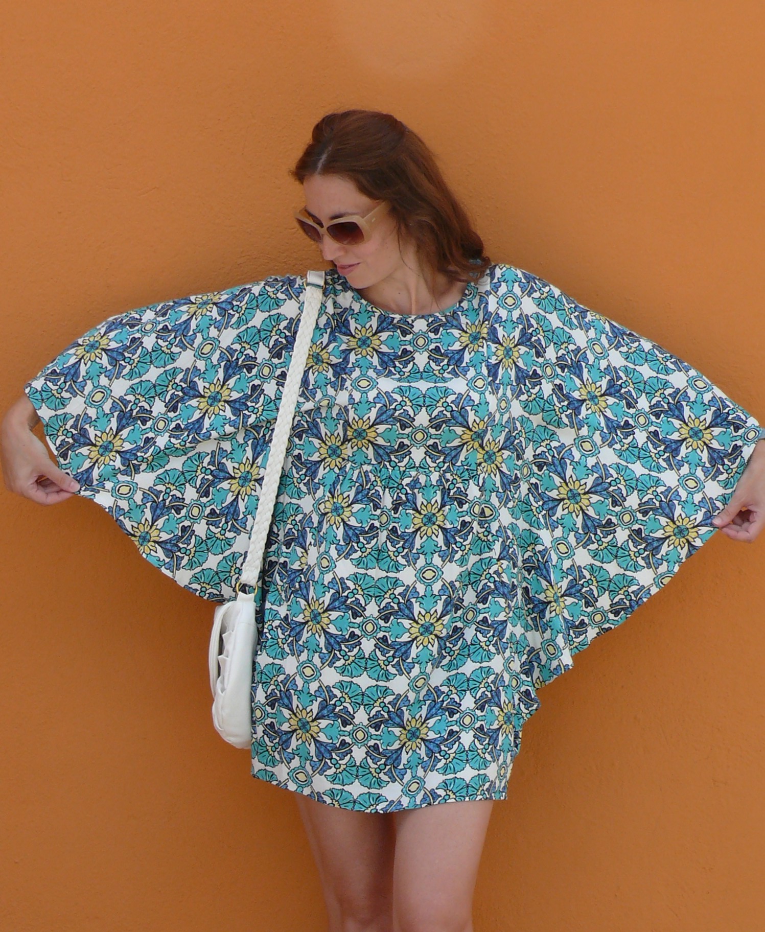 ¡Hola! Empiezo la semana con un look muy colorido! Un vestido corto, estampado, con mangas «murciélago» y de un tejido muy fresquito, ideal para el verano. Los complementos en blanco combinan genial al ser el color base del vestido.