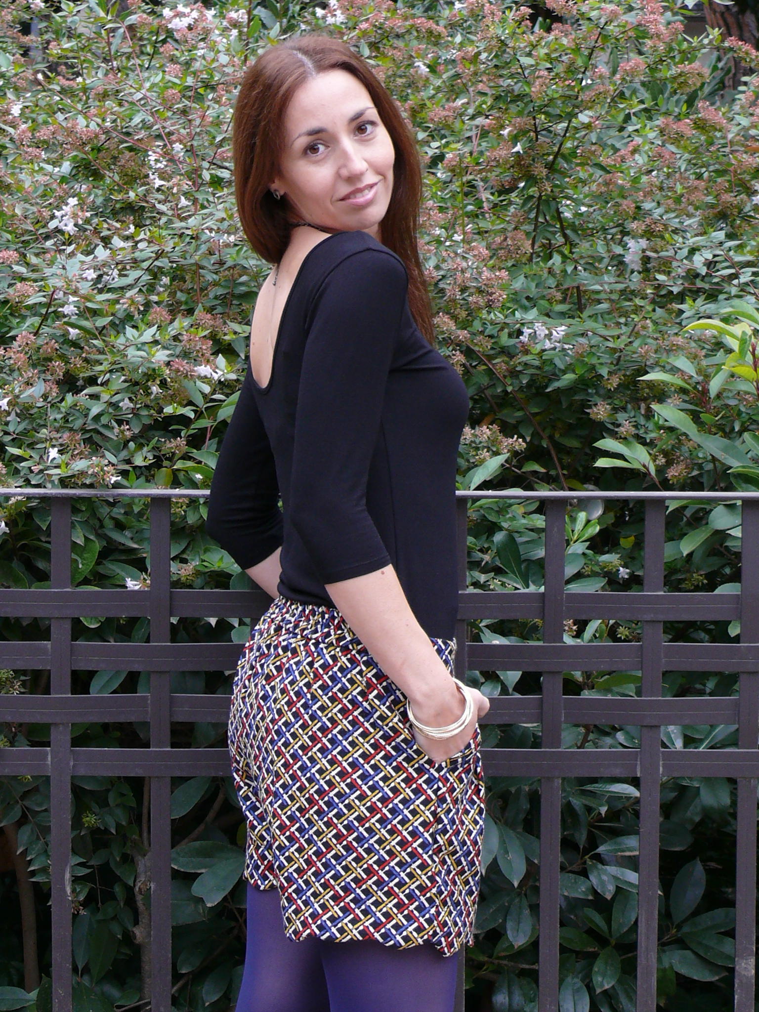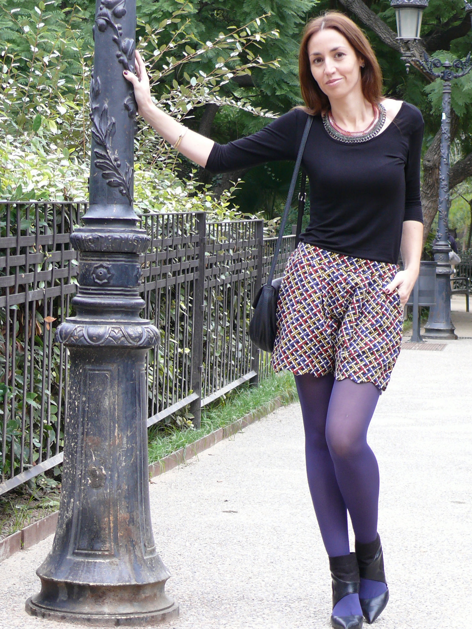 Aquí lo combino con medias de color azulón y zapato de tacón negro, pero a diario lo suelo combinar con media negra y zapatos oxford planos de color azul oscuro.