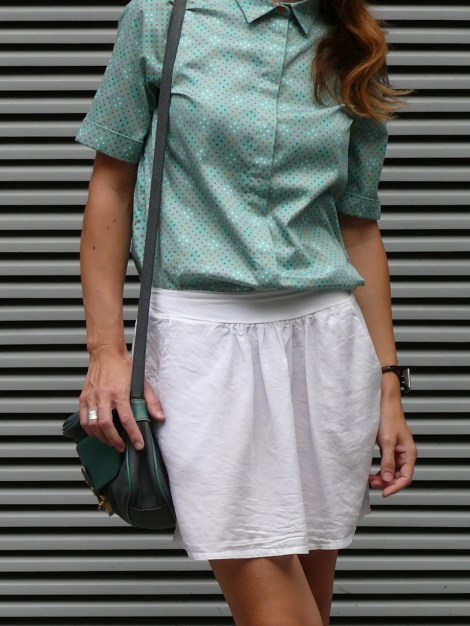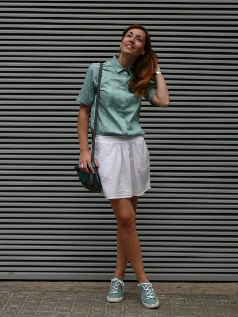 ¡Hola! Para terminar la semana, os dejo con un look en el que combino una camisa de estilo formal, con falda y complementos de estilo sporty, obteniendo un outfit más informal, que también podría catalogarse como «sporty-chic».