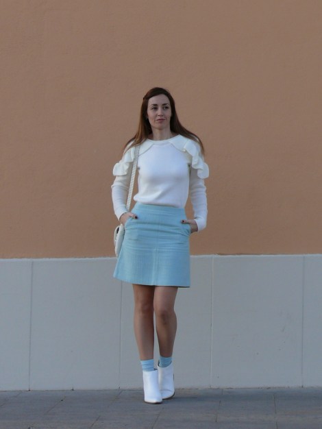 Así que, el estilismo que comparto hoy es un buen ejemplo de ello. Combino jersey, bolso y botines blancos con falda y calcetines en tono verde mint; una combinación que me encanta porque aporta mucha luz. Como podréis observar en las imágenes, vuelvo a recurrir al calcetín con botín y falda… 😉 Sé que no es el complemento más favorecedor (como os he dicho en otras ocasiones acorta visualmente la medida de la pierna), pero igualmente me gusta el toque que da al look. ¡A ver que os parece a vosotr@s!