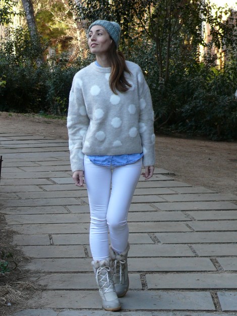 Hoy comparto este look que se quedó en el tintero hace unas semanas. Es de un sábado que teníamos pensado ir a la nieve y como la previsión del tiempo era malísima, decidimos anular el plan; aún así, me calcé las botas y me puse este jersey «efecto nieve» para disfrutar del día en la ciudad… 😉