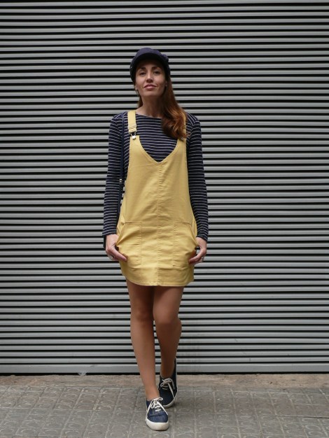 ¡Hola! Empiezo la semana con un look cuyo protagonista principal es un peto en tejido «denim» de color amarillo, uno de los colores tendencia de esta primavera/verano. Lo combino con una camiseta y gorra de estilo marinero, zapatillas cómodas de tela y un mini bolso, también en tono azul marino, al que creo que le voy a sacar mucho partido porque quedará ideal con muchos estilismos.