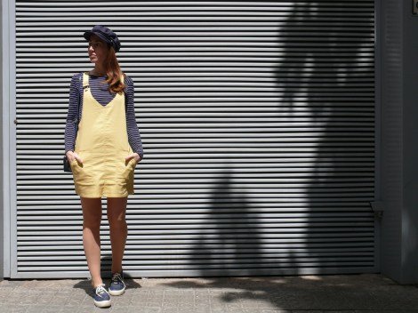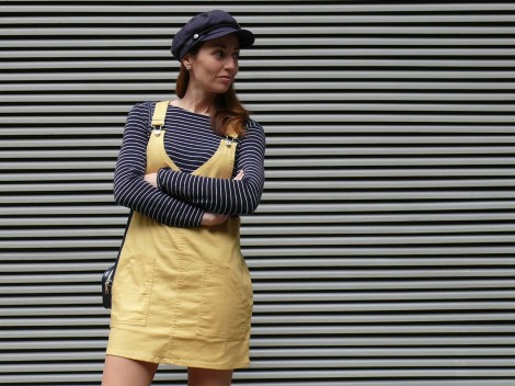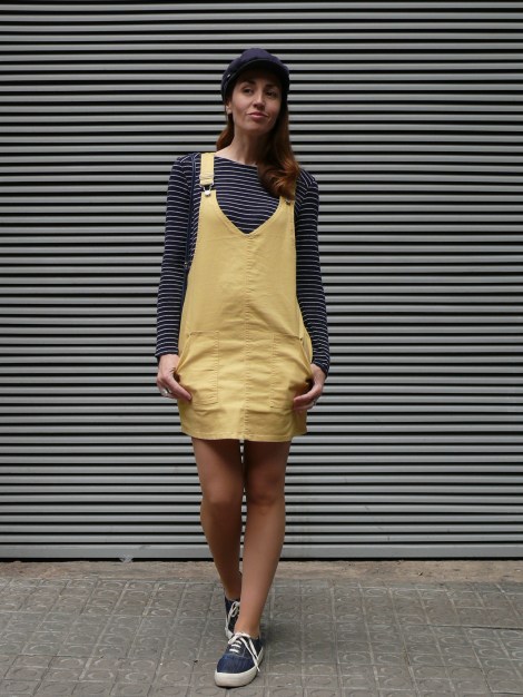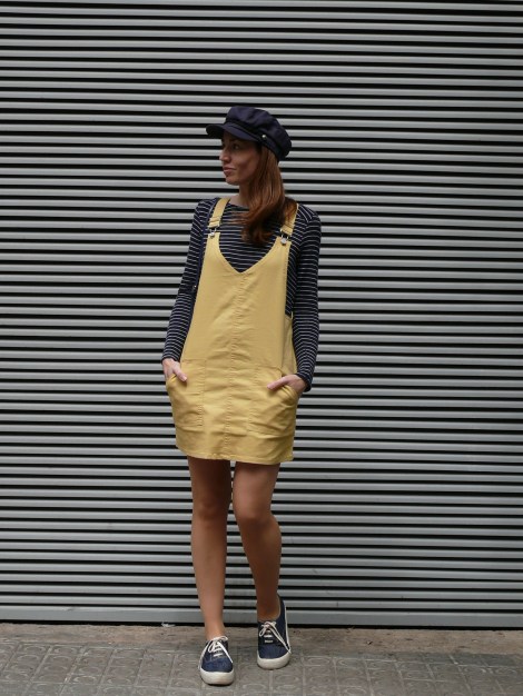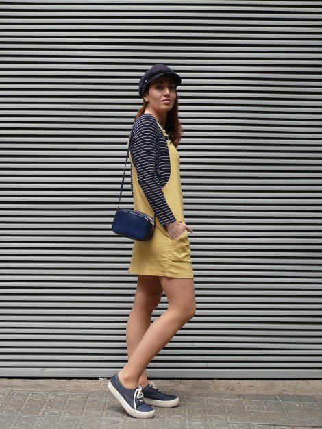 ¡Hola! Empiezo la semana con un look cuyo protagonista principal es un peto en tejido «denim» de color amarillo, uno de los colores tendencia de esta primavera/verano. Lo combino con una camiseta y gorra de estilo marinero, zapatillas cómodas de tela y un mini bolso, también en tono azul marino, al que creo que le voy a sacar mucho partido porque quedará ideal con muchos estilismos.