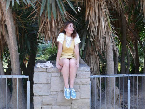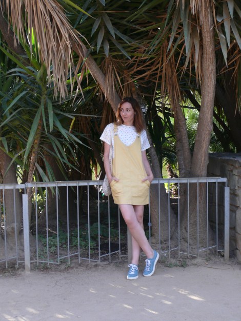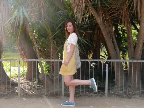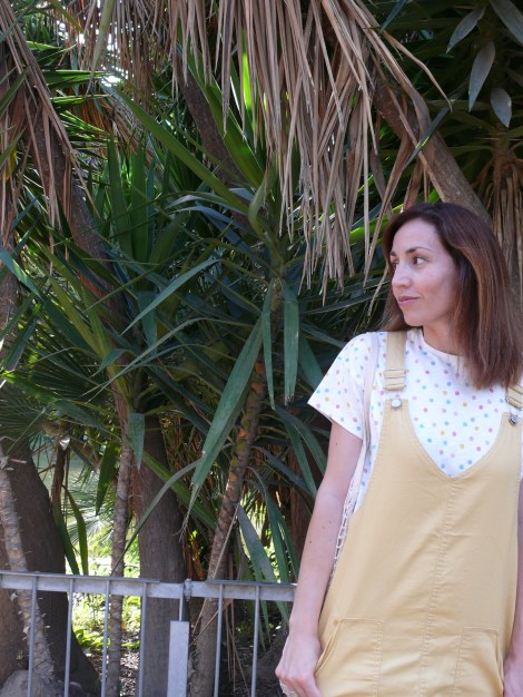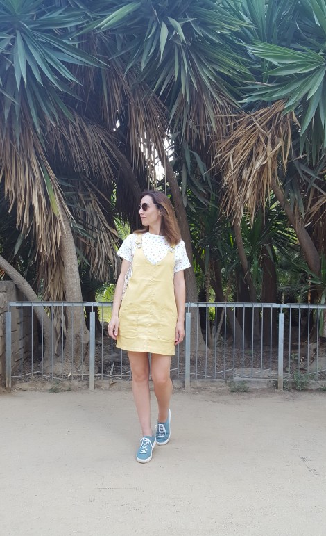 ¡Hola! Empiezo el mes de julio con este look, en el que combino el peto amarillo que compartí hace unas semanas con otra combinación más marinera, pero en esta ocasión con una camiseta de topos de colores y las zapatillas verdes que tanto me gustan.