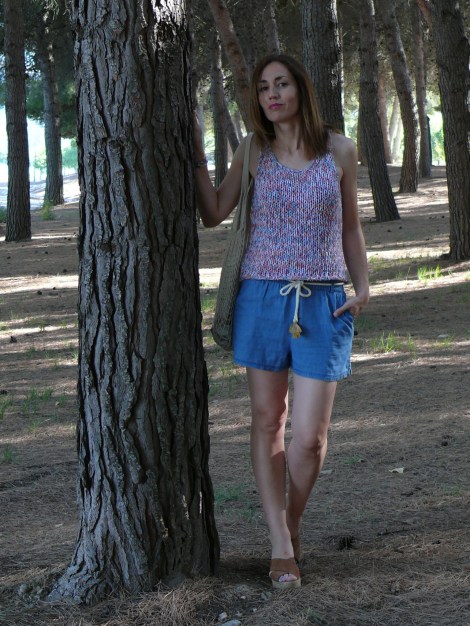 Look: Top de punto de Mango (S/S 18), shorts denim de Lefties (S/S 18), bolso de red de tienda local (S/S 18) y cuñas de Inditex (S/S 16).