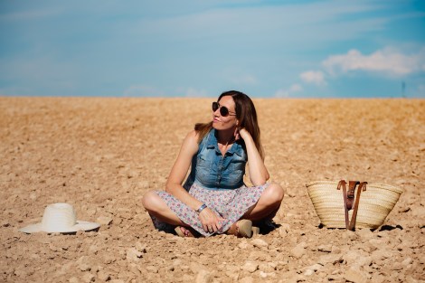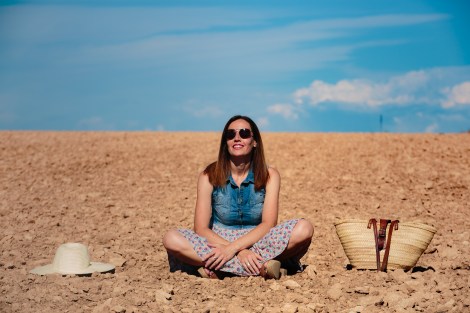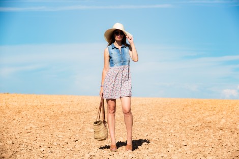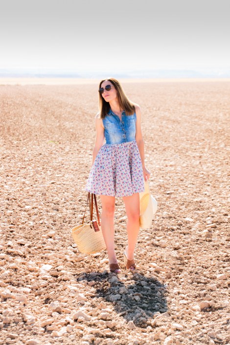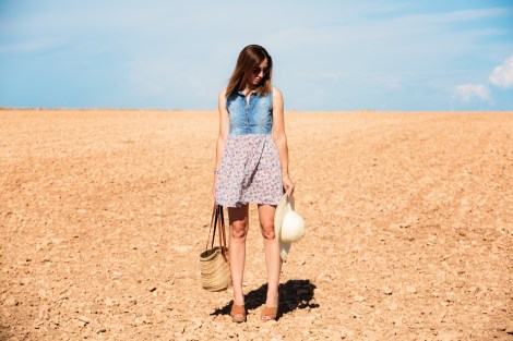 El outfit está formado por un vestido muy sencillo que combina denim con estampado de flores, y complementos de fibras naturales en tonos tierra. Ideal para una sesión en el campo, ¿no os parece?
