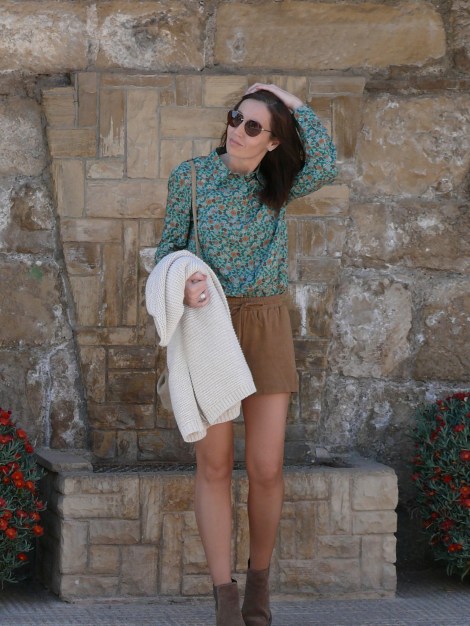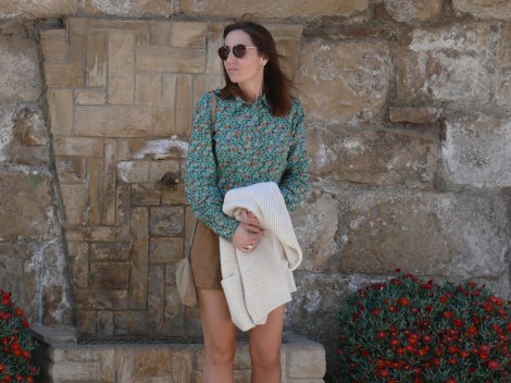 Hoy comparto un look del pasado fin de semana, en el que combino una camisa de flores del pasado invierno (que veo más adecuada para la primavera) con unos shorts en color camel y una chaqueta de punto en color crudo.