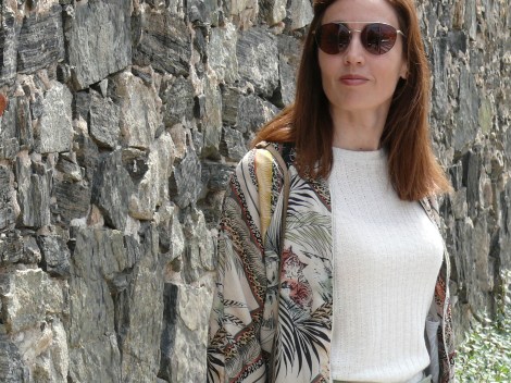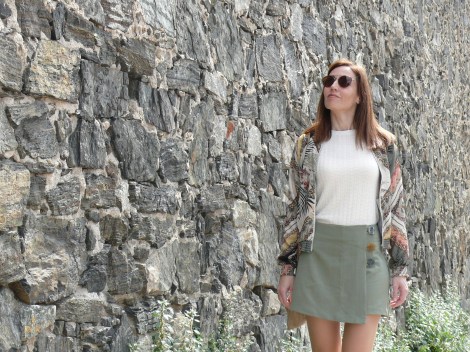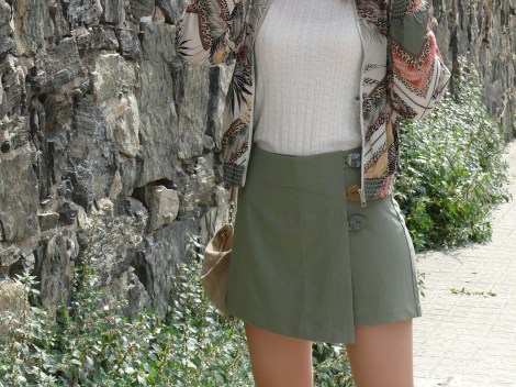 Hoy os comparto un look primaveral en el que combino una falda pantalón de color verde militar, con jersey calado en color crudo y chaqueta de seda que le da el toque estampado al outfit. De complementos, bolso y botines de ante en color camel, que ya habréis visto por el blog con otras combinaciones.