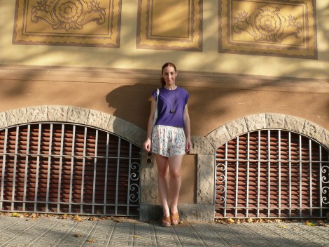 En este post comparto el look de ayer, uno de estos típicos que suelo llevar a diario en verano, compuesto por falda pantalón estampada (de tela fresquita), top de tejido también fluido, sandalias de cuña y bolso de red.