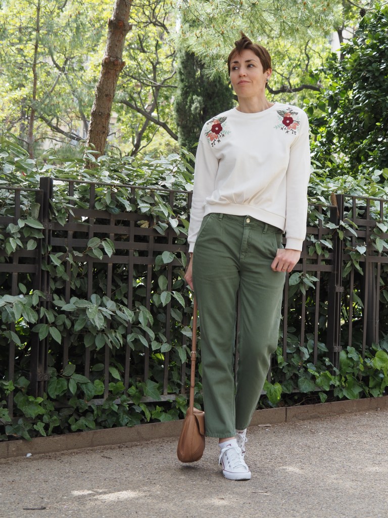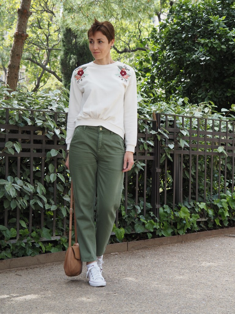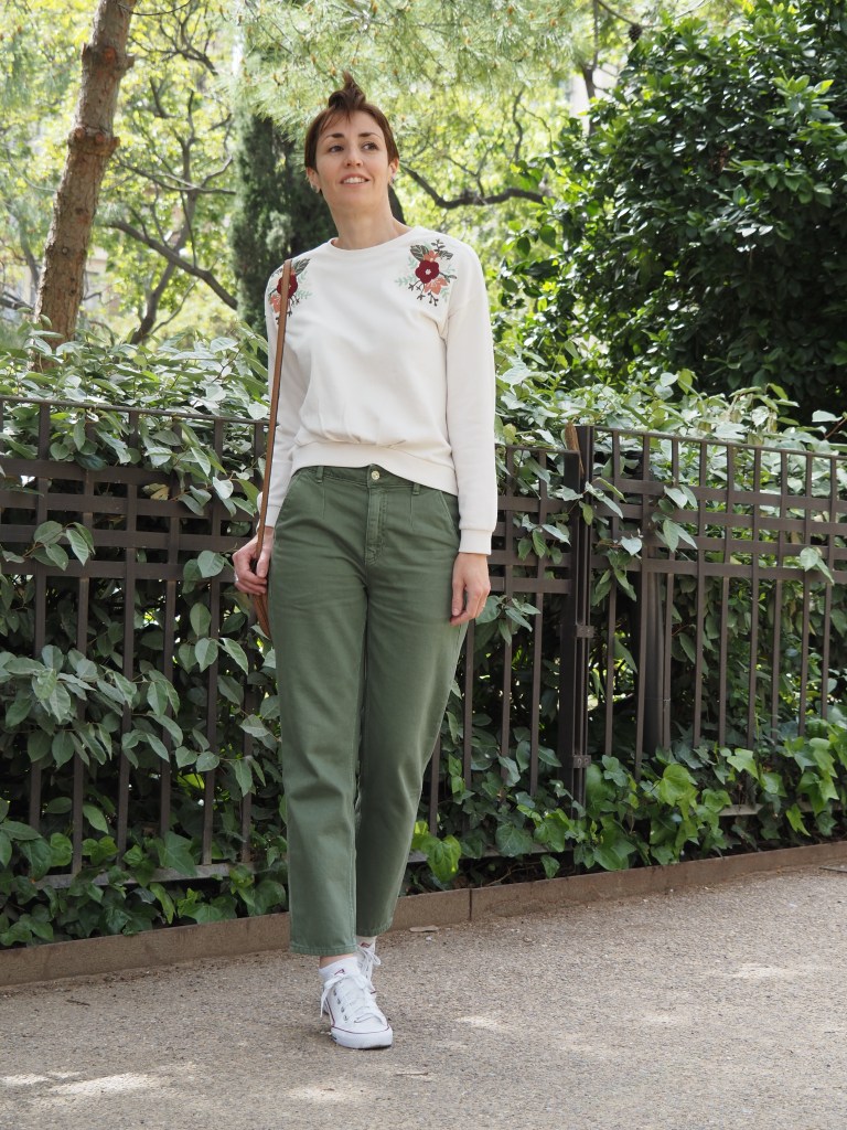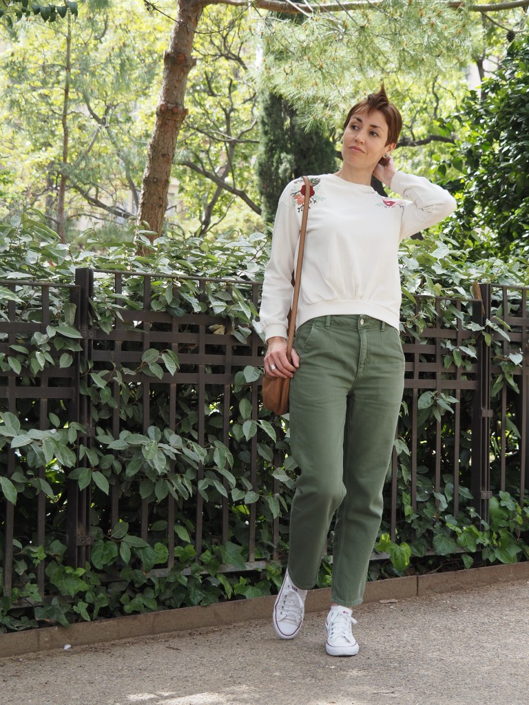 ¡Hola! En este post os comparto un look super cómodo en el que combino un pantalón de corte entre «slouchy» y «mom», una sudadera con detalle de flores bordadas en los hombros y las converse blancas que tanto me gustan para infinidad de looks de primavera y verano.
