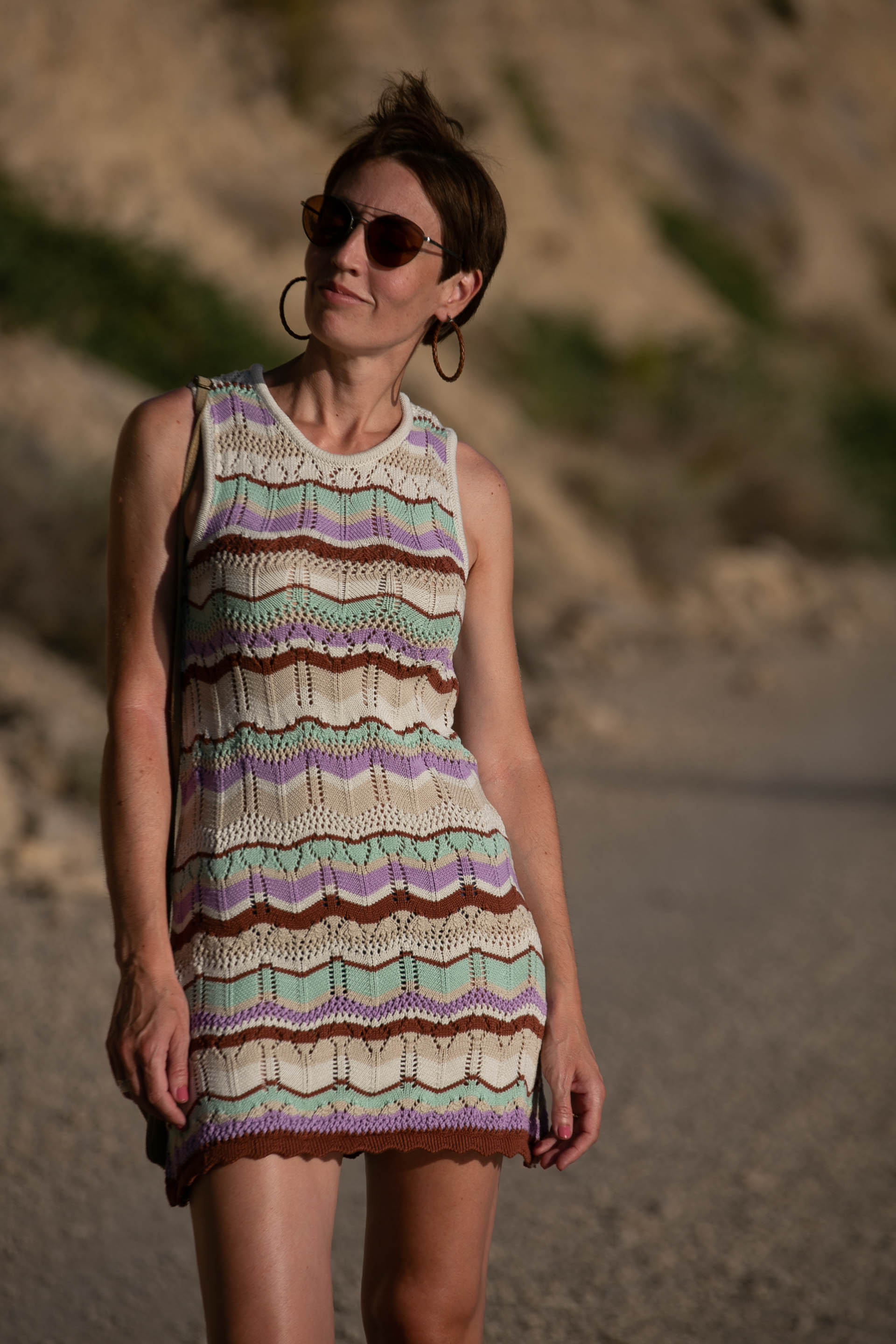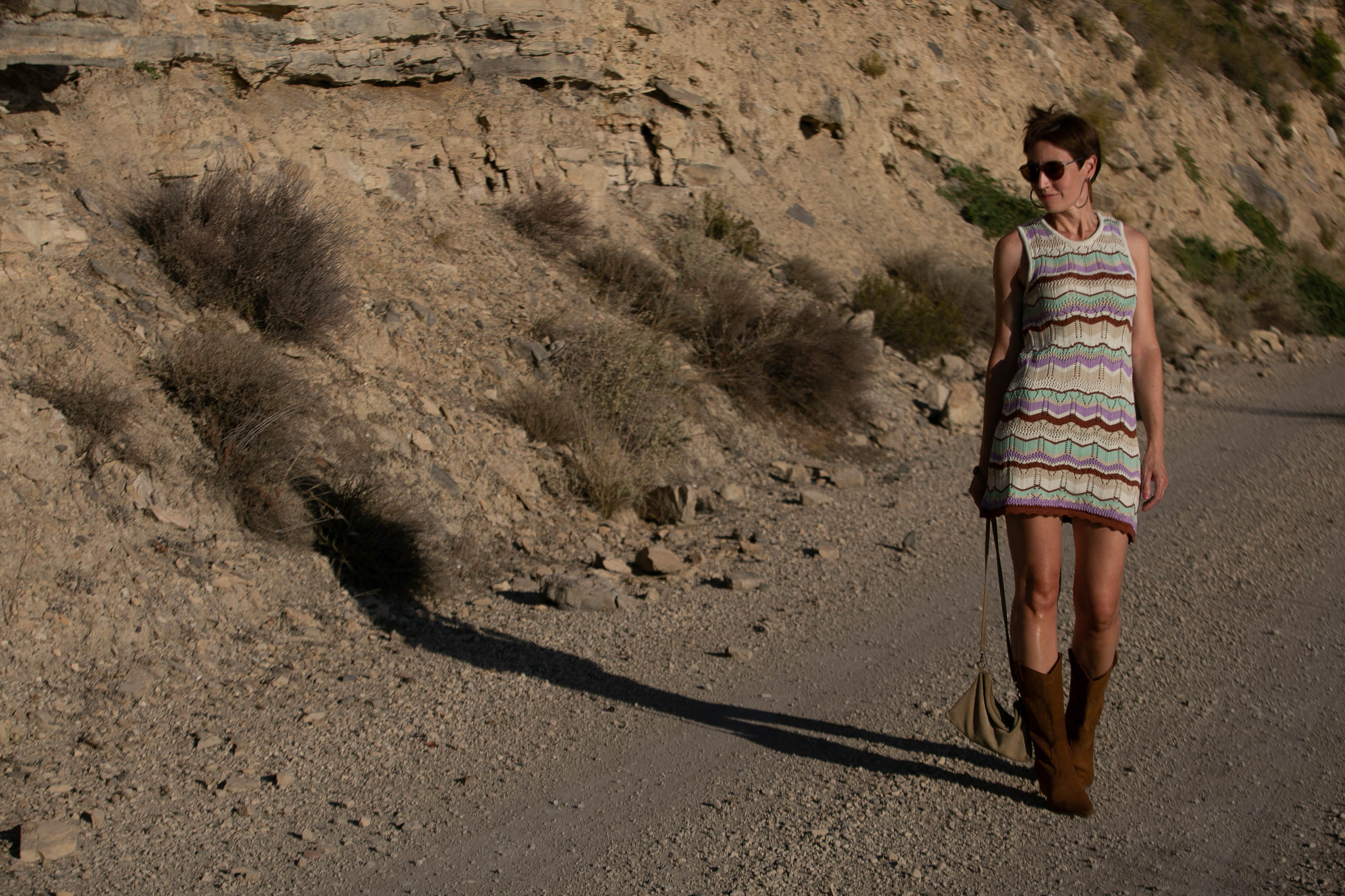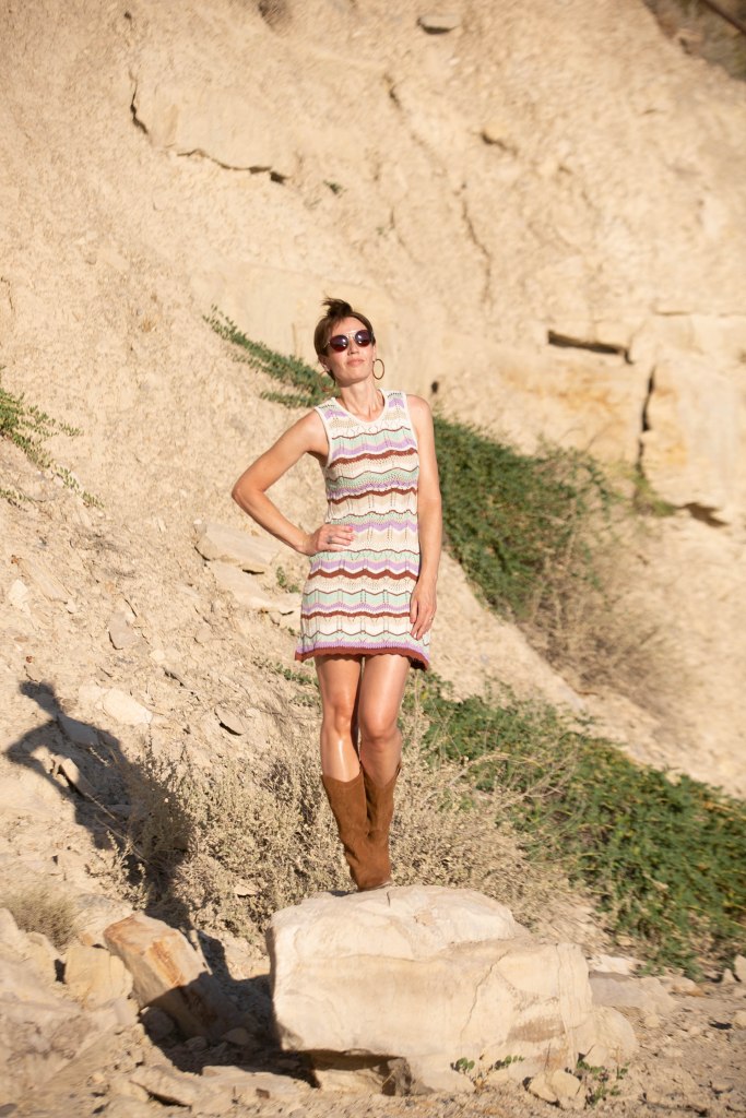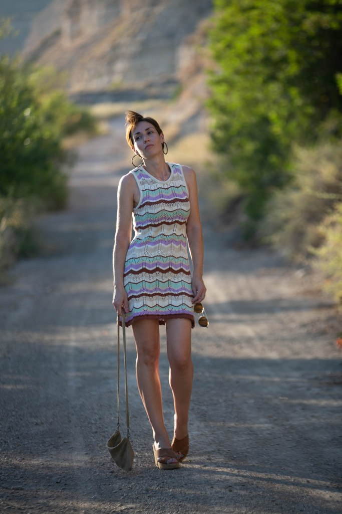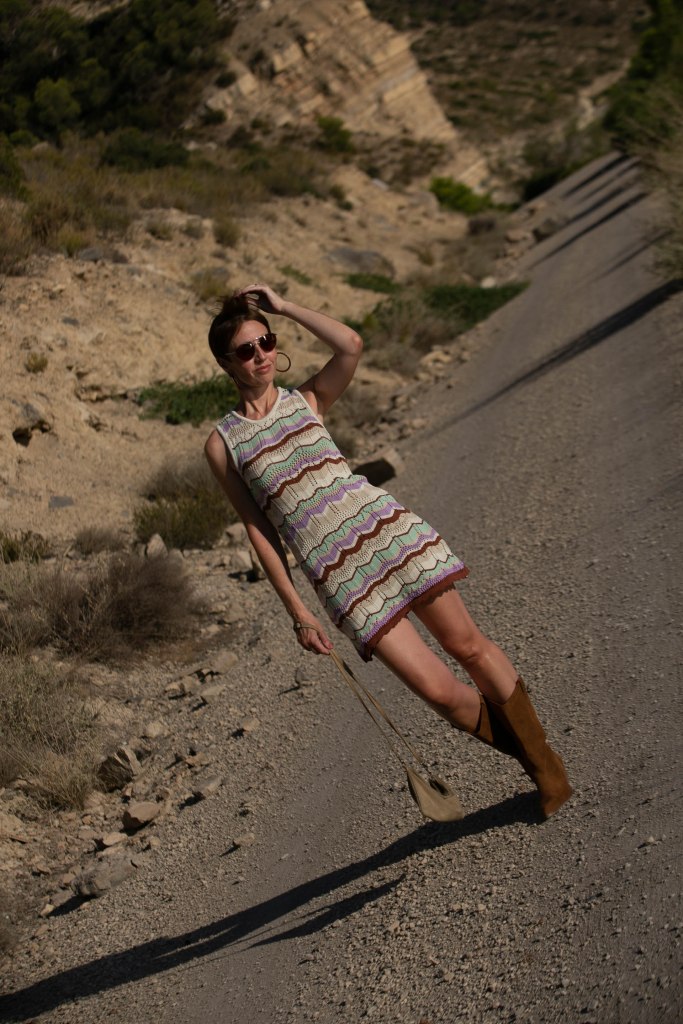 Hoy os comparto uno de los tres looks de la sesión. La tendencia crochet está en auge y es la protagonista absoluta del look. Este vestido de crochet me encantó, aparte de por el tejido, por la combinación de colores y por la forma. Además, lo veo versátil para llevar tanto con sandalias de cuña o de otros estilos, como con botas camperas. Y también quedará genial con una cazadora vaquera cuando empiece a refrescar.