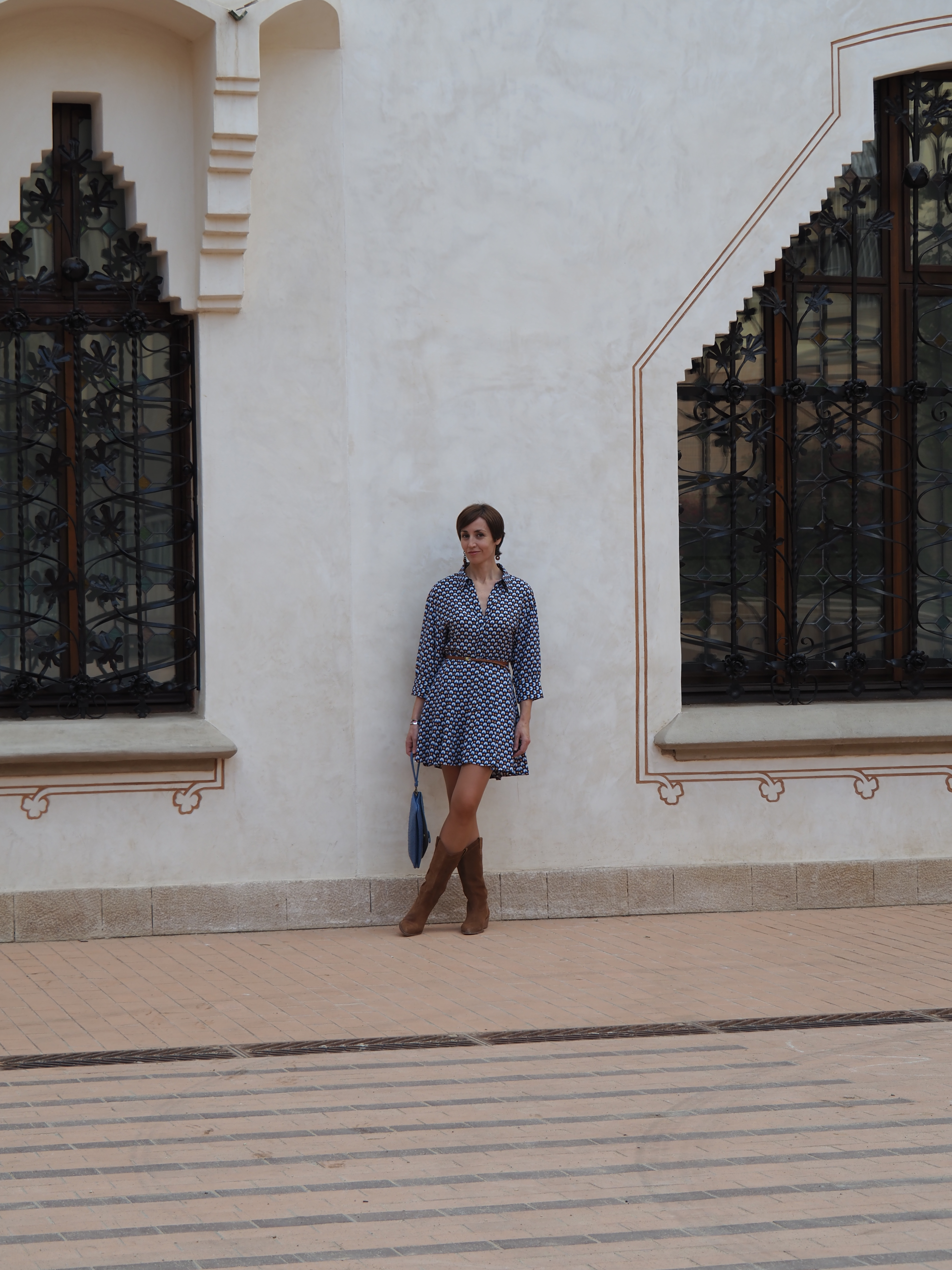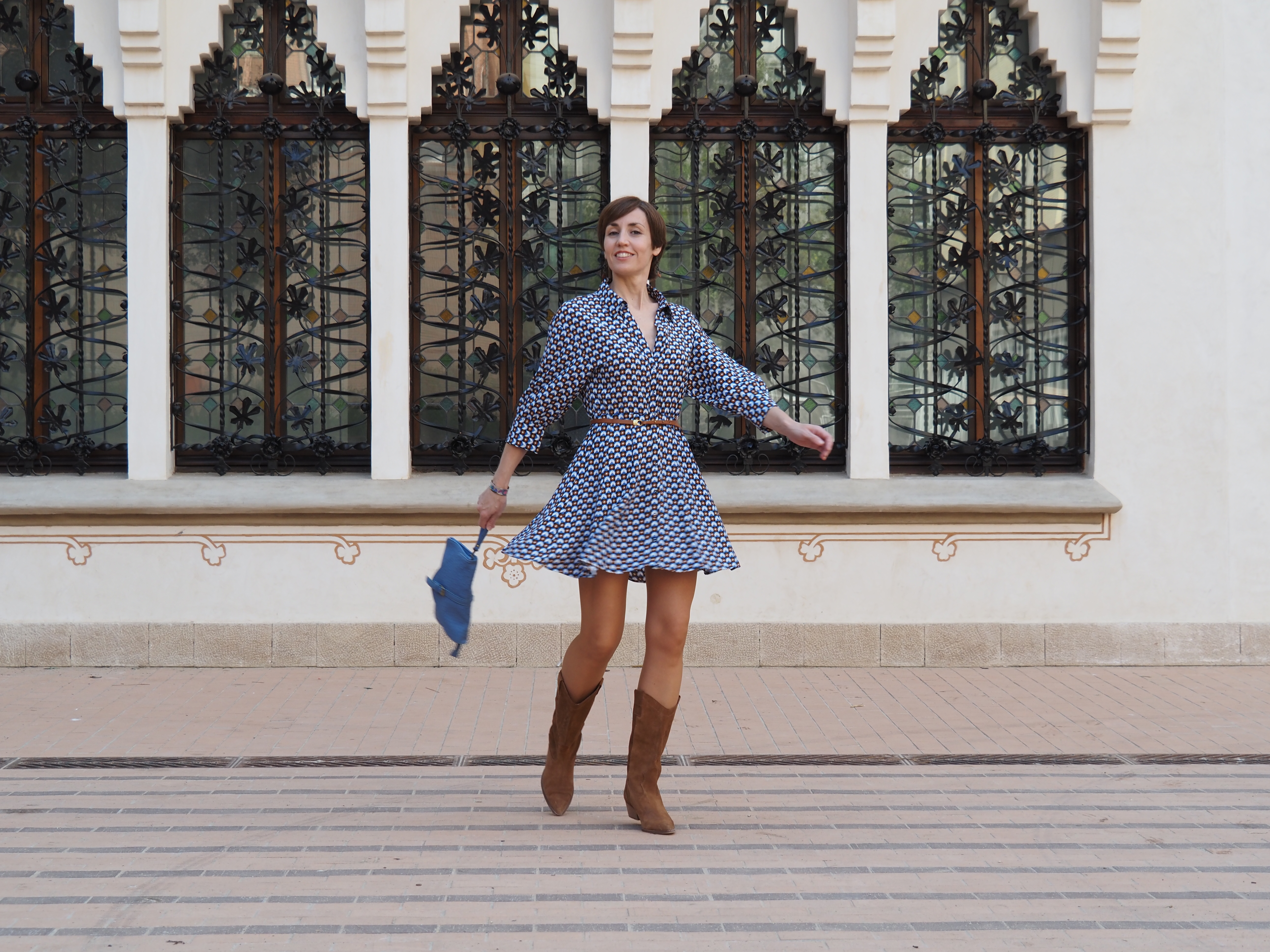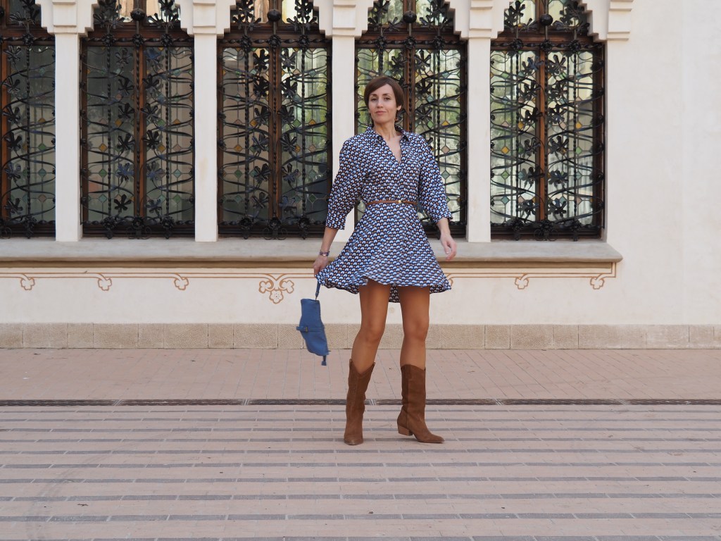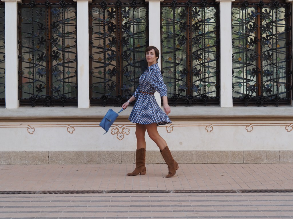 Este vestido, entallado de cintura, corto y con vuelo, lo he combinado con las botas Cowboy y un bolso/clutch azul. ¡A ver qué os parece la combi!