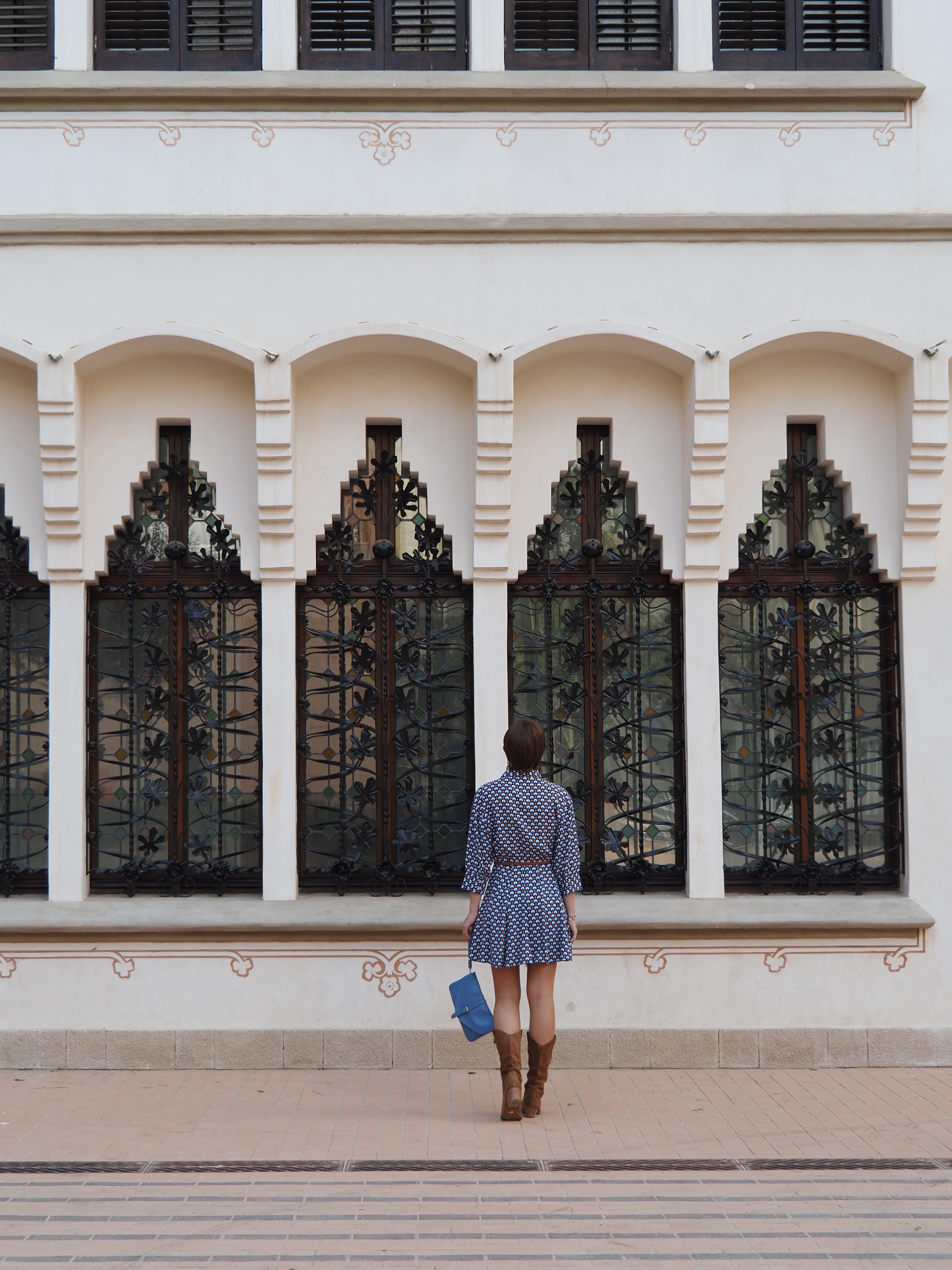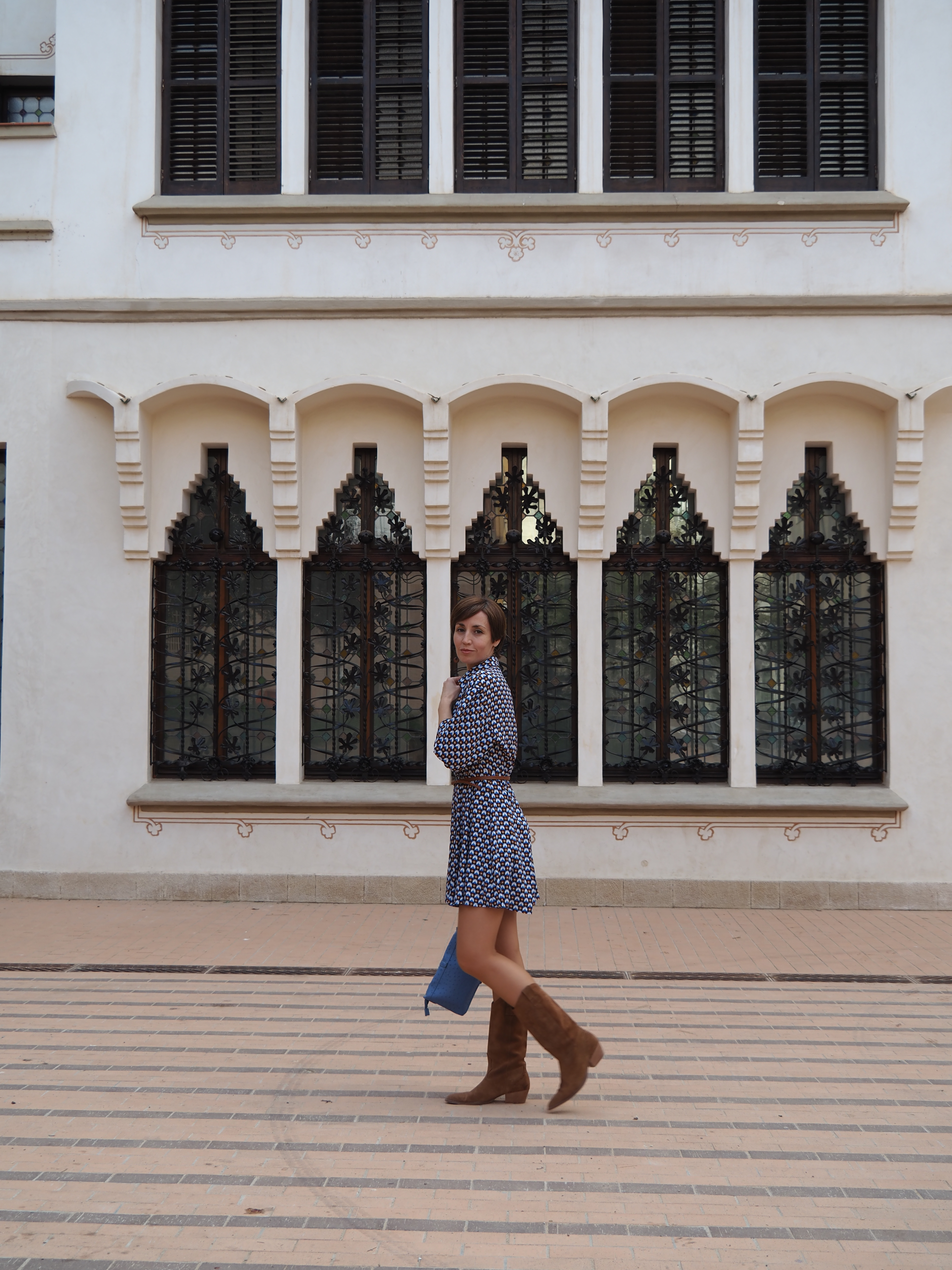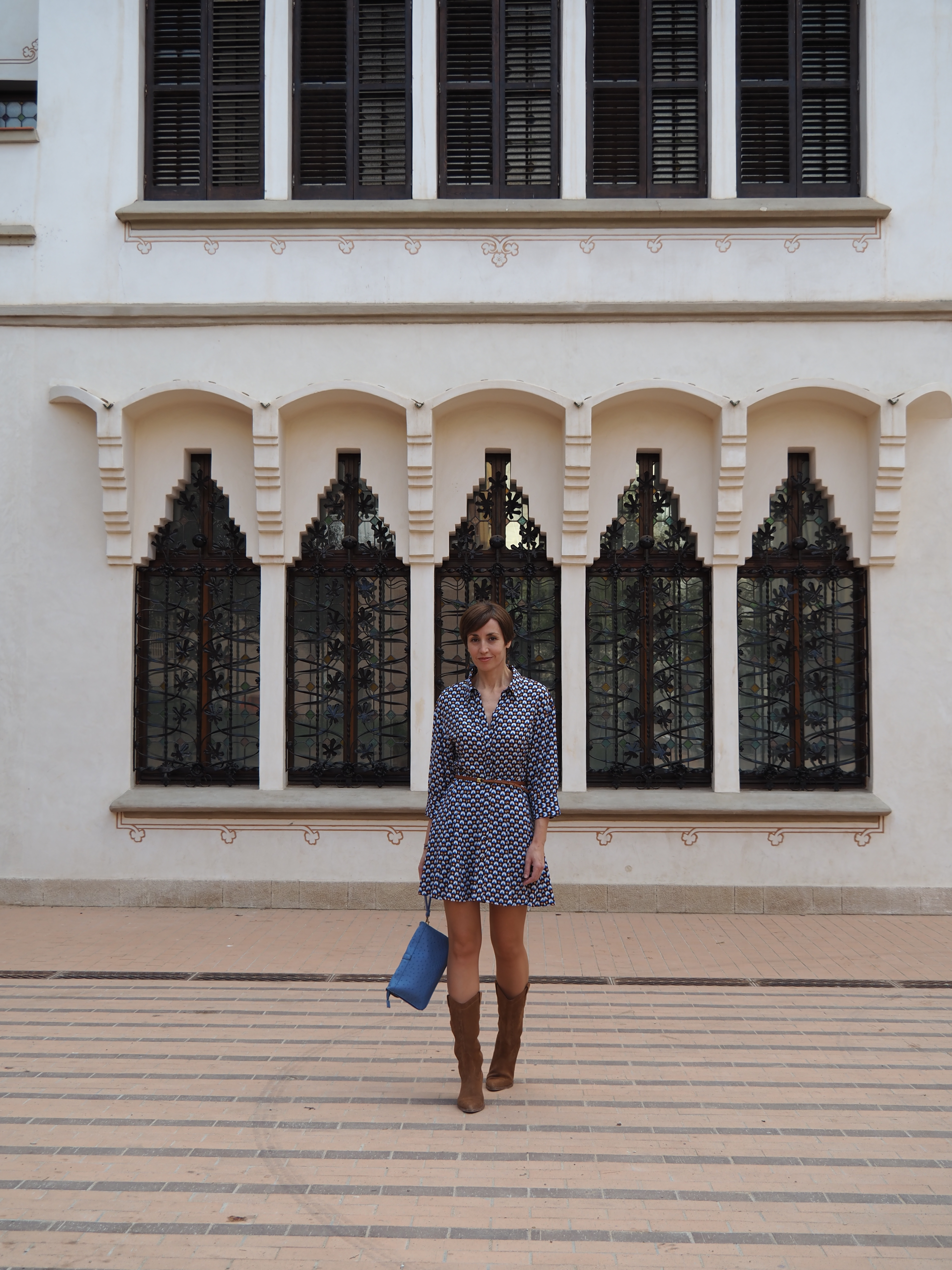 Este vestido, entallado de cintura, corto y con vuelo, lo he combinado con las botas Cowboy y un bolso/clutch azul. ¡A ver qué os parece la combi!