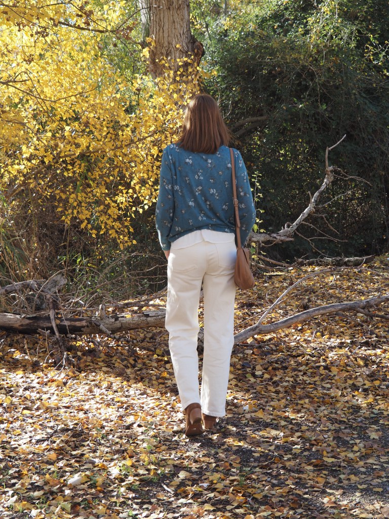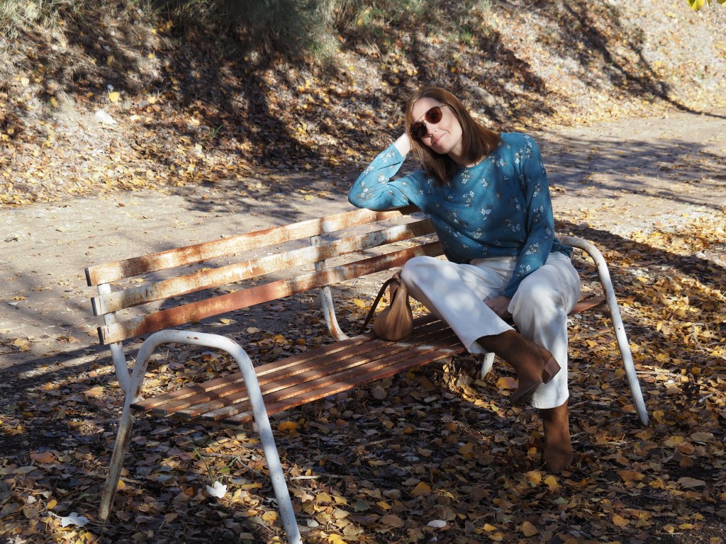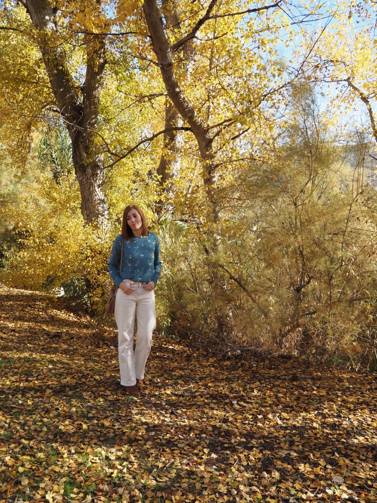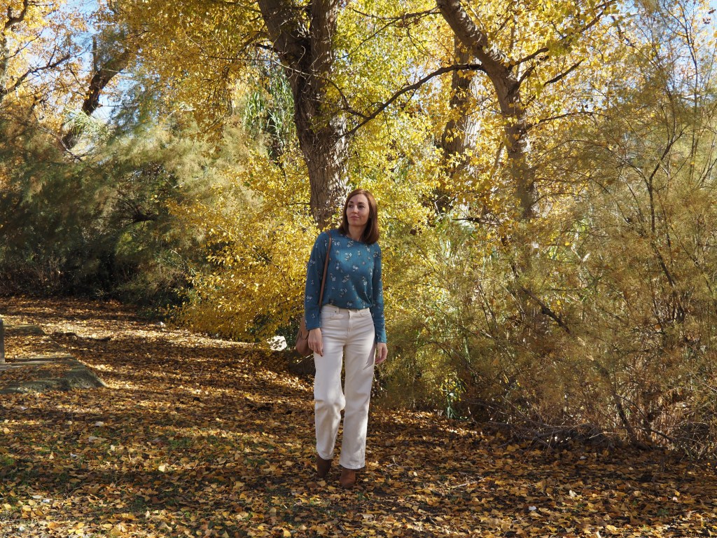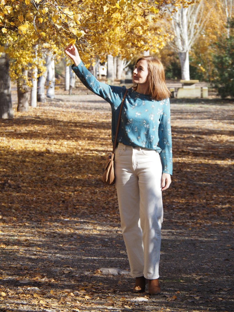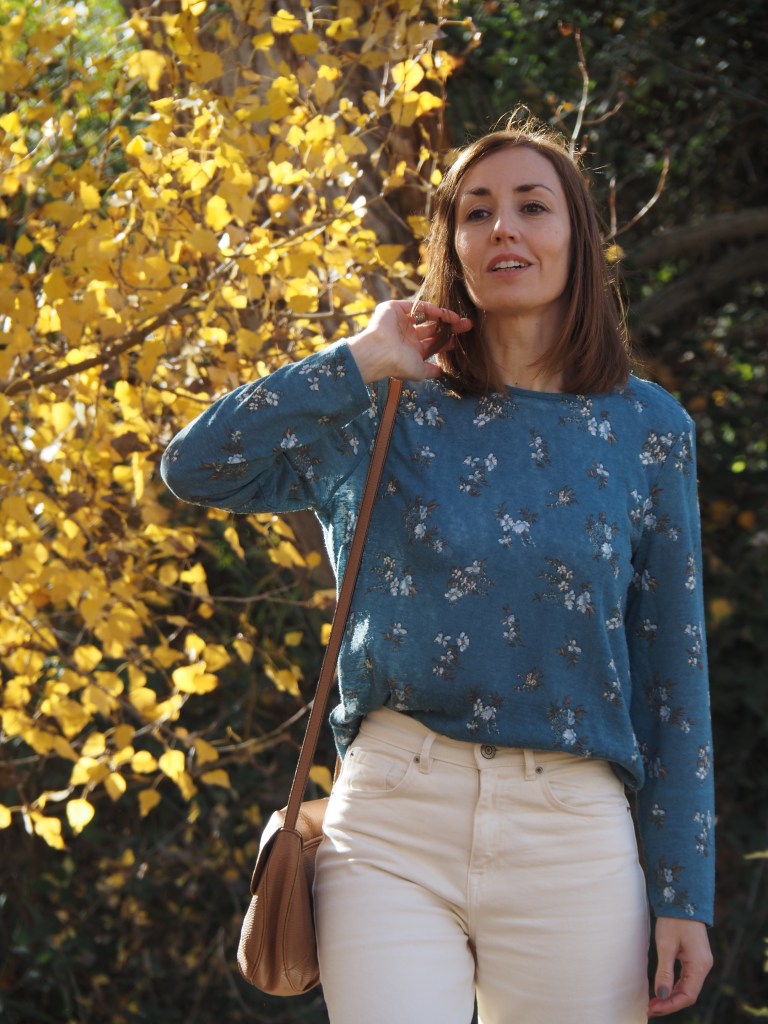 Hoy comparto un post breve en el que os muestro un look muy sencillo en un entorno otoñal, aprovechando que ya son los últimos días de la estación. Jeans de color crudo, jersey fino con estampado de flores, y bolso y botas cowboy de color camel.