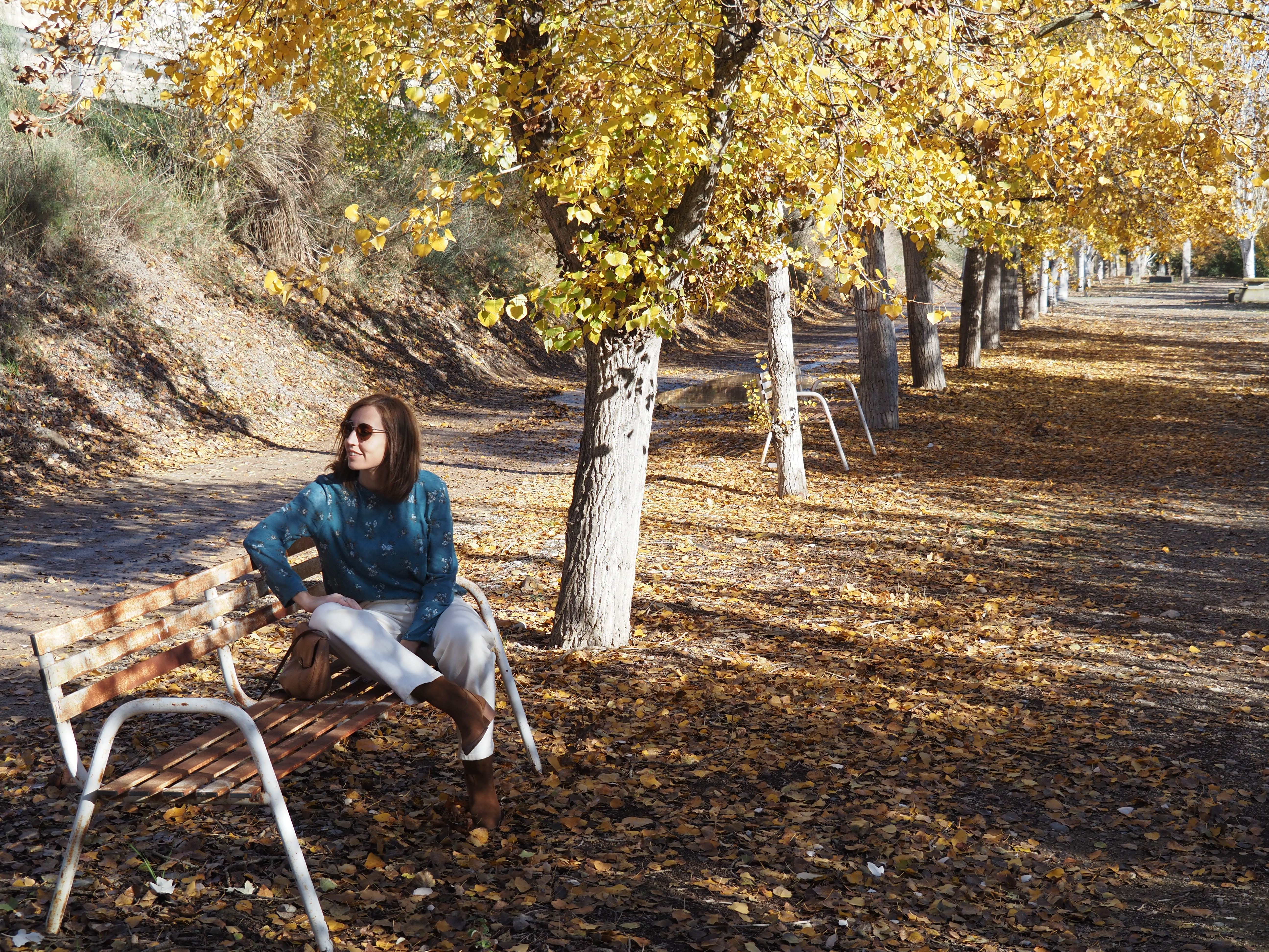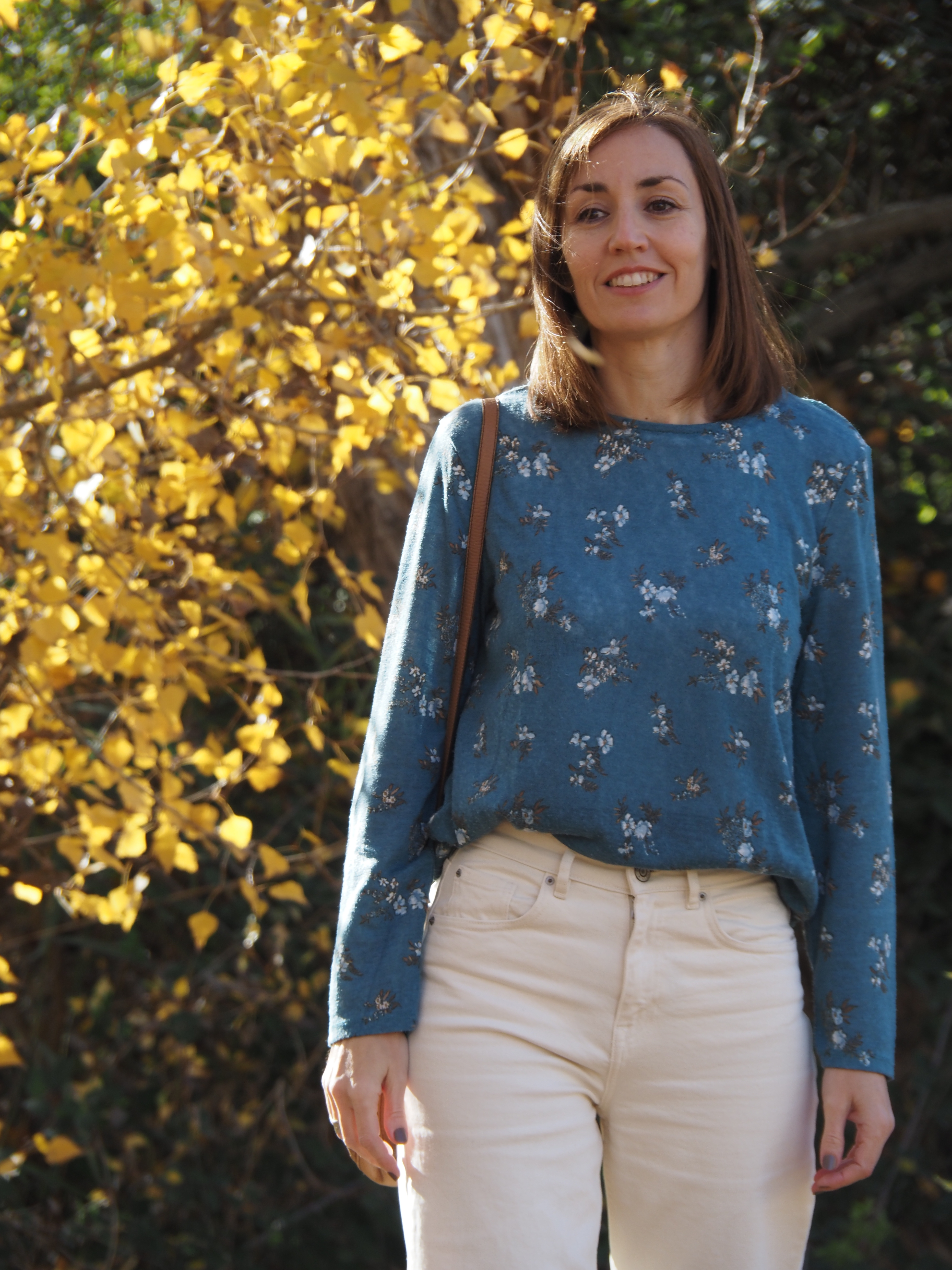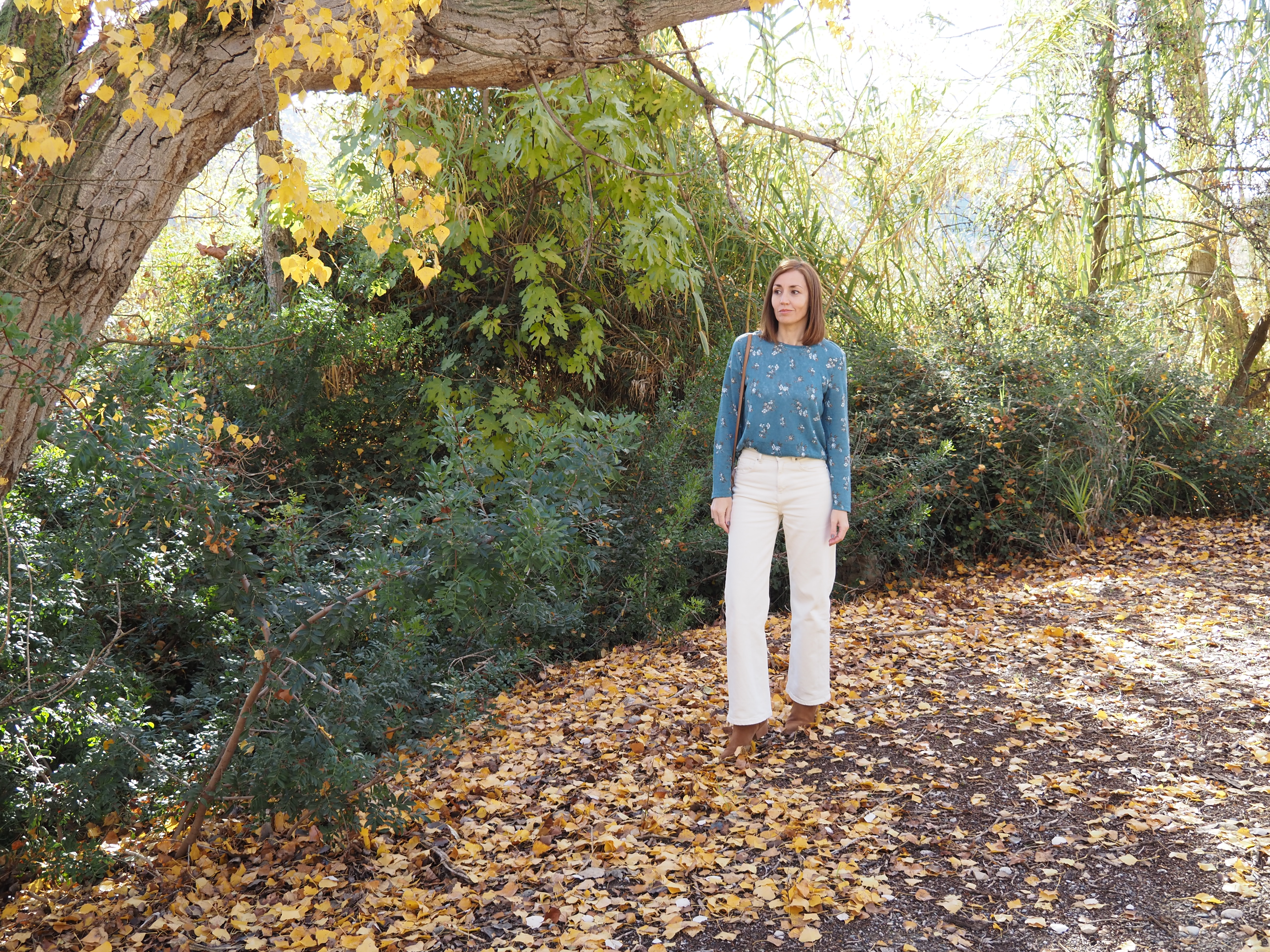 Hoy comparto un post breve en el que os muestro un look muy sencillo en un entorno otoñal, aprovechando que ya son los últimos días de la estación. Jeans de color crudo, jersey fino con estampado de flores, y bolso y botas cowboy de color camel.