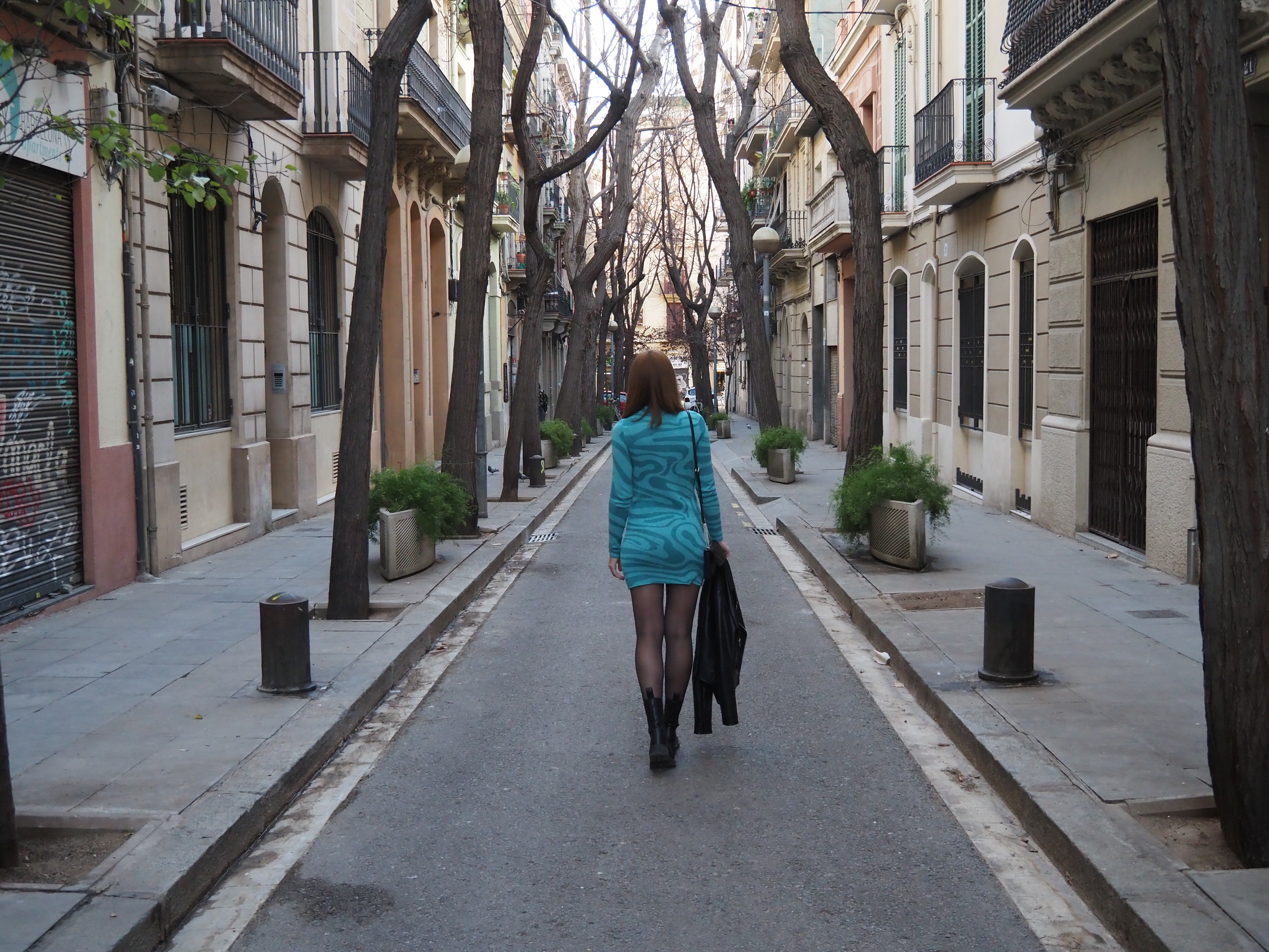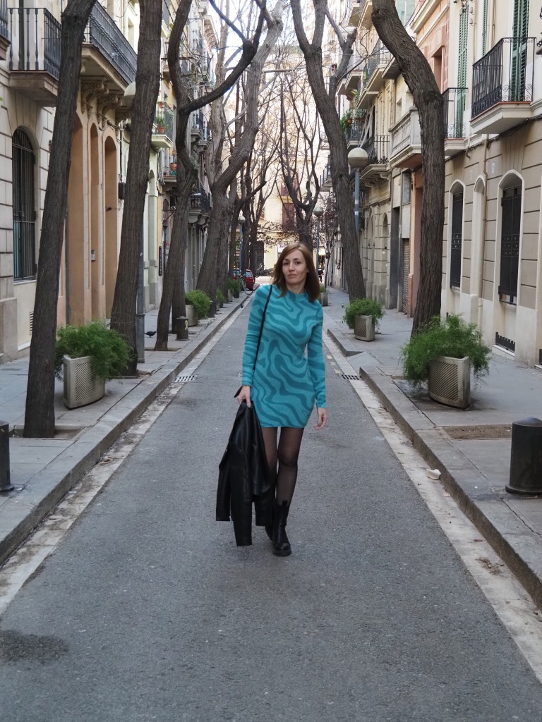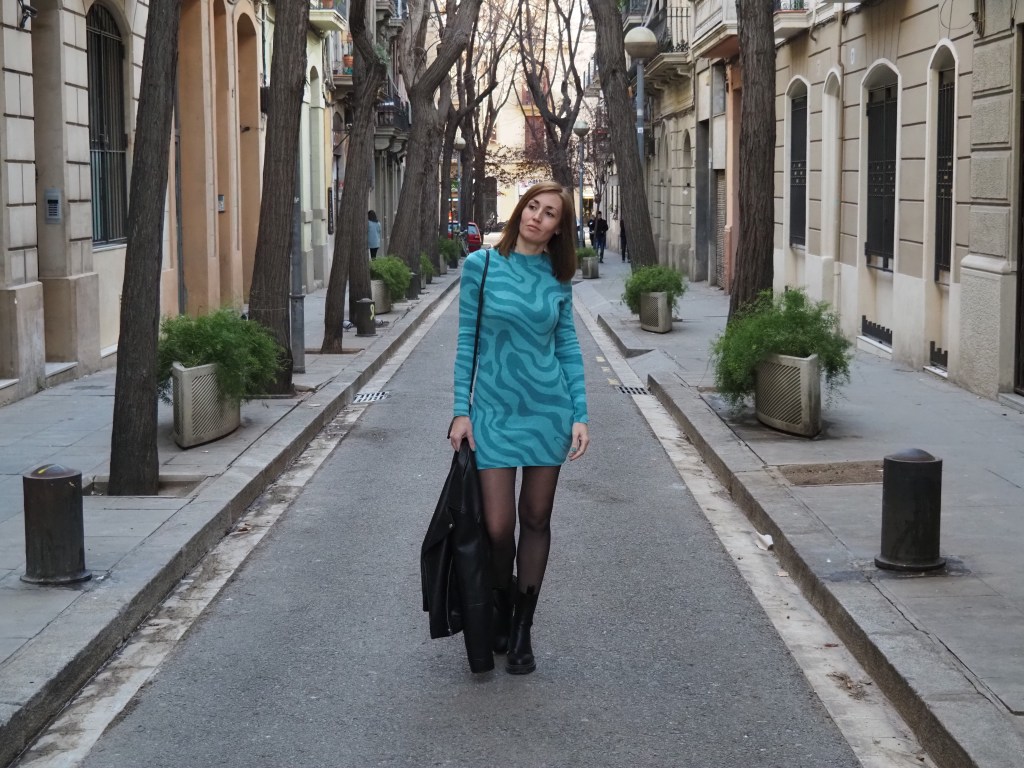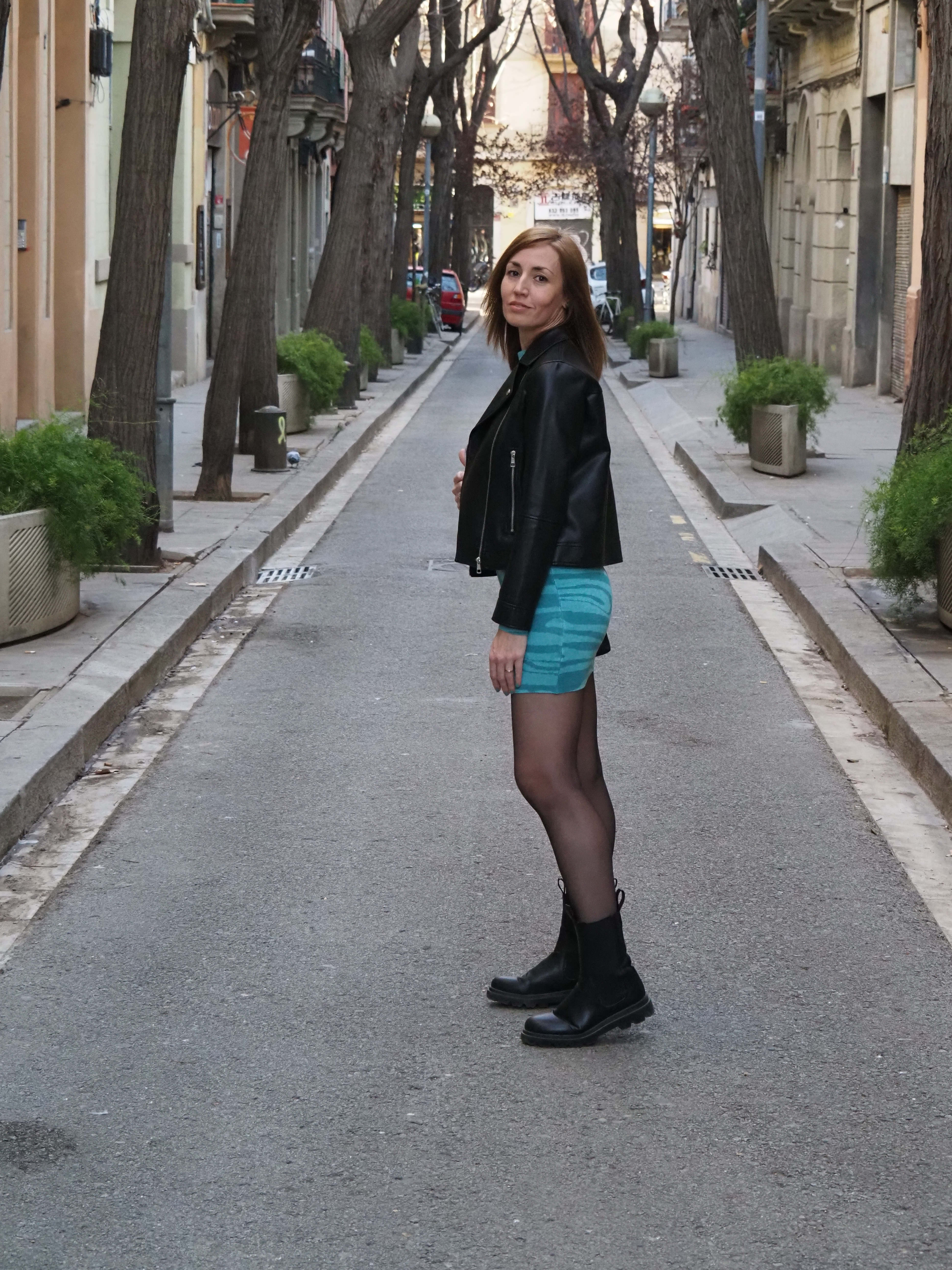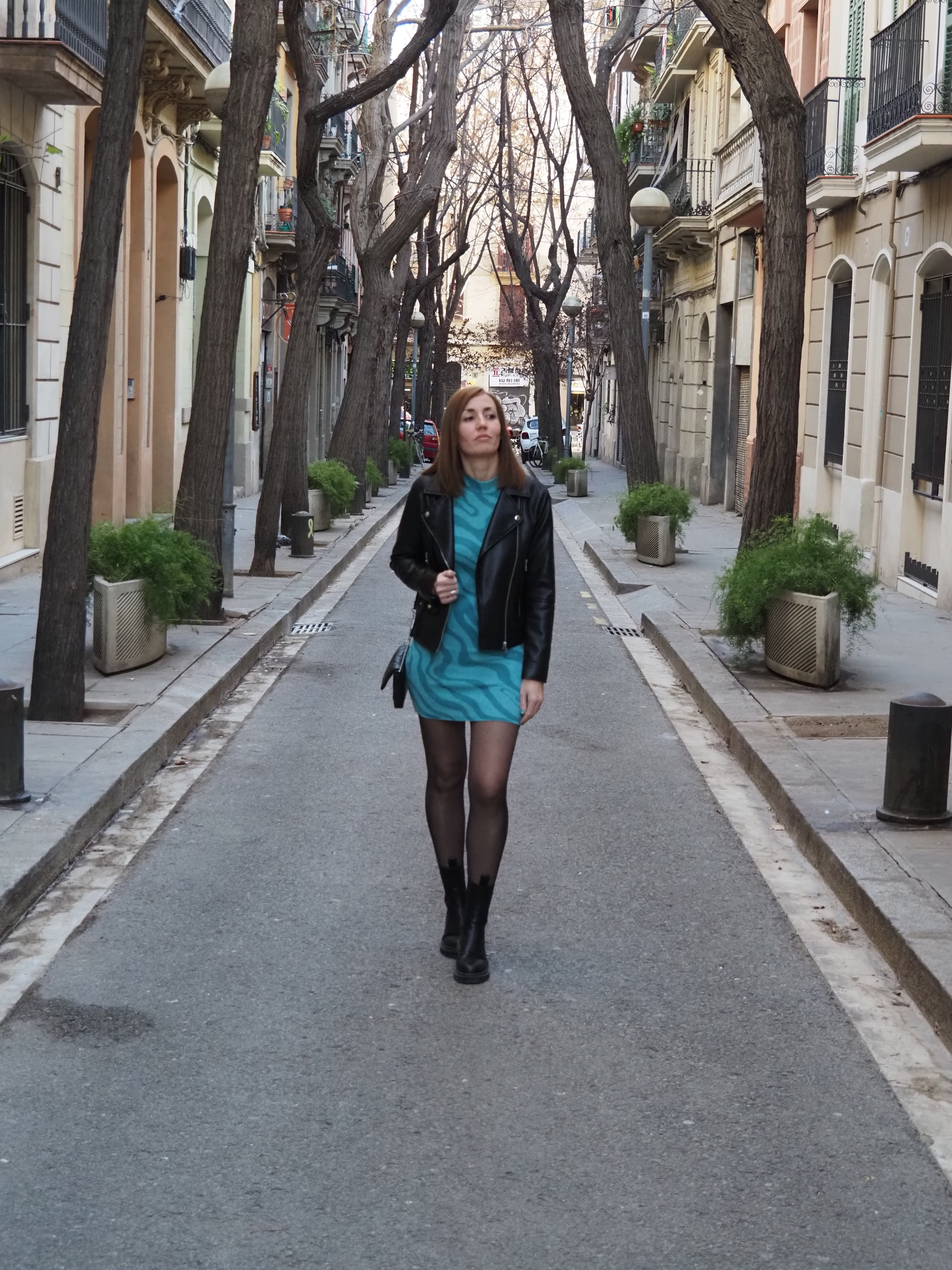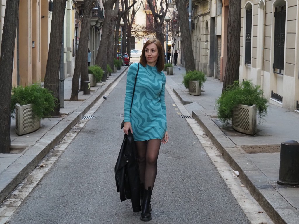 ¡Hola! En este post comparto un outfit de otro estilo, ya que, aunque repito la cazadora biker y las botas de otros looks anteriores, en este caso el vestido es bastante diferente. Como podréis ver en las imágenes, se trata de un vestido corto y ajustado/elástico («de tubo» decíamos cuando yo era adolescente… 🙂 ), del color turquesa que tanto me gusta y con un estampado un tanto psicodélico.
